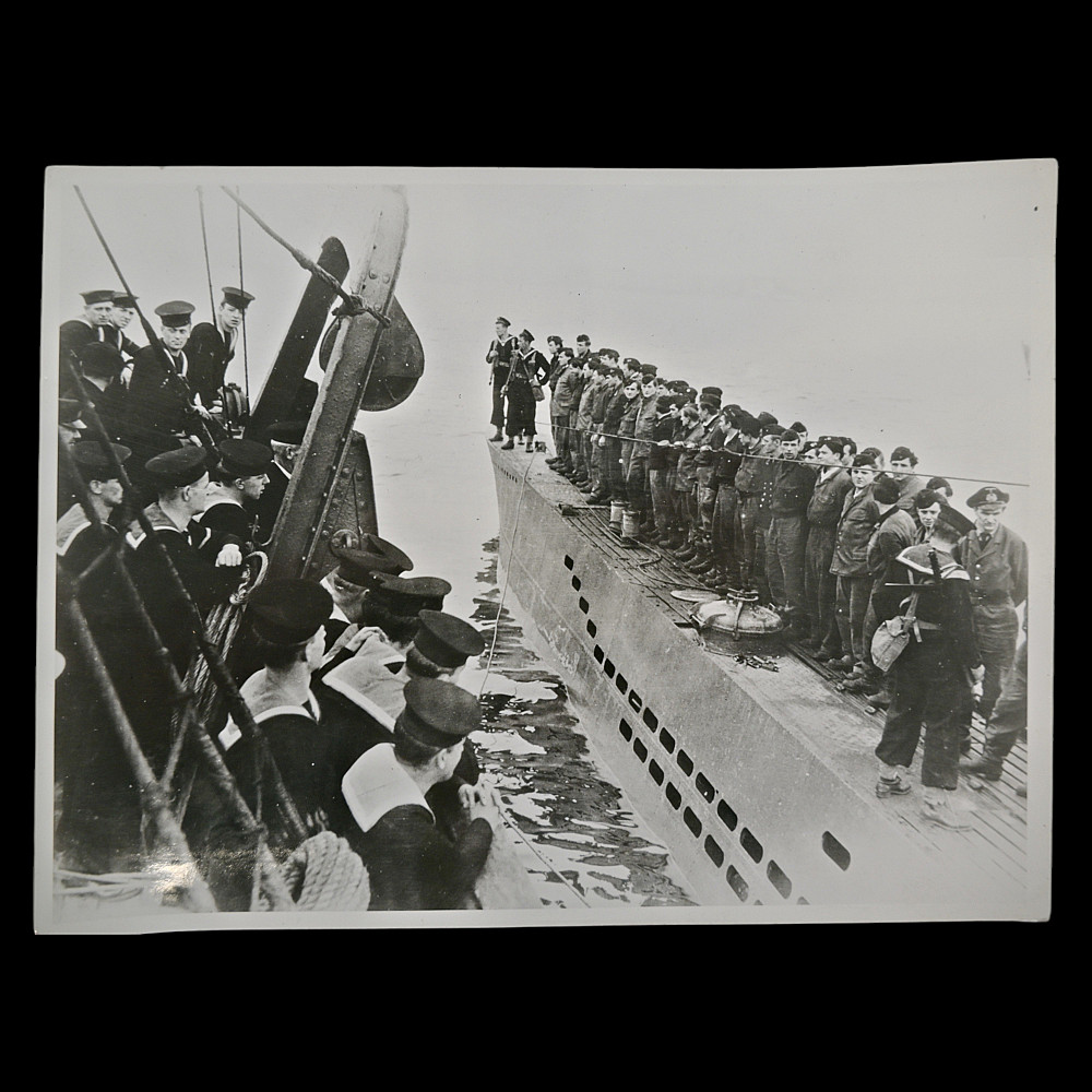 Original WWII Press Photograph – German U-Boat U-249 Surrendering at Weymouth, May 1945. An original vintage World War II press photograph issued by the Photo-Lique USIS, Paris (United States Information Service), depicting the surrender of the German submarine U-249 to British forces at Weymouth, Dorset, England, on May 7, 1945 — the first German U-boat to be formally surrendered to the Allies following the capitulation of Nazi Germany. The image shows German sailors standing on the deck of U-249 while British naval personnel observe from the escorting vessel. The typed caption on the reverse identifies the event, dated and certified by Allied censors, and notes Commander W. R. Nott of the Royal Navy receiving the surrender. A historically significant and rare official press photograph documenting the surrender of the first U-boat after Germany’s unconditional surrender, marking the end of the Battle of the Atlantic. Condition: excellent vintage condition, with original typed wartime information slip attached to the verso. Dimensions: approx. 18 x 24 cm.
