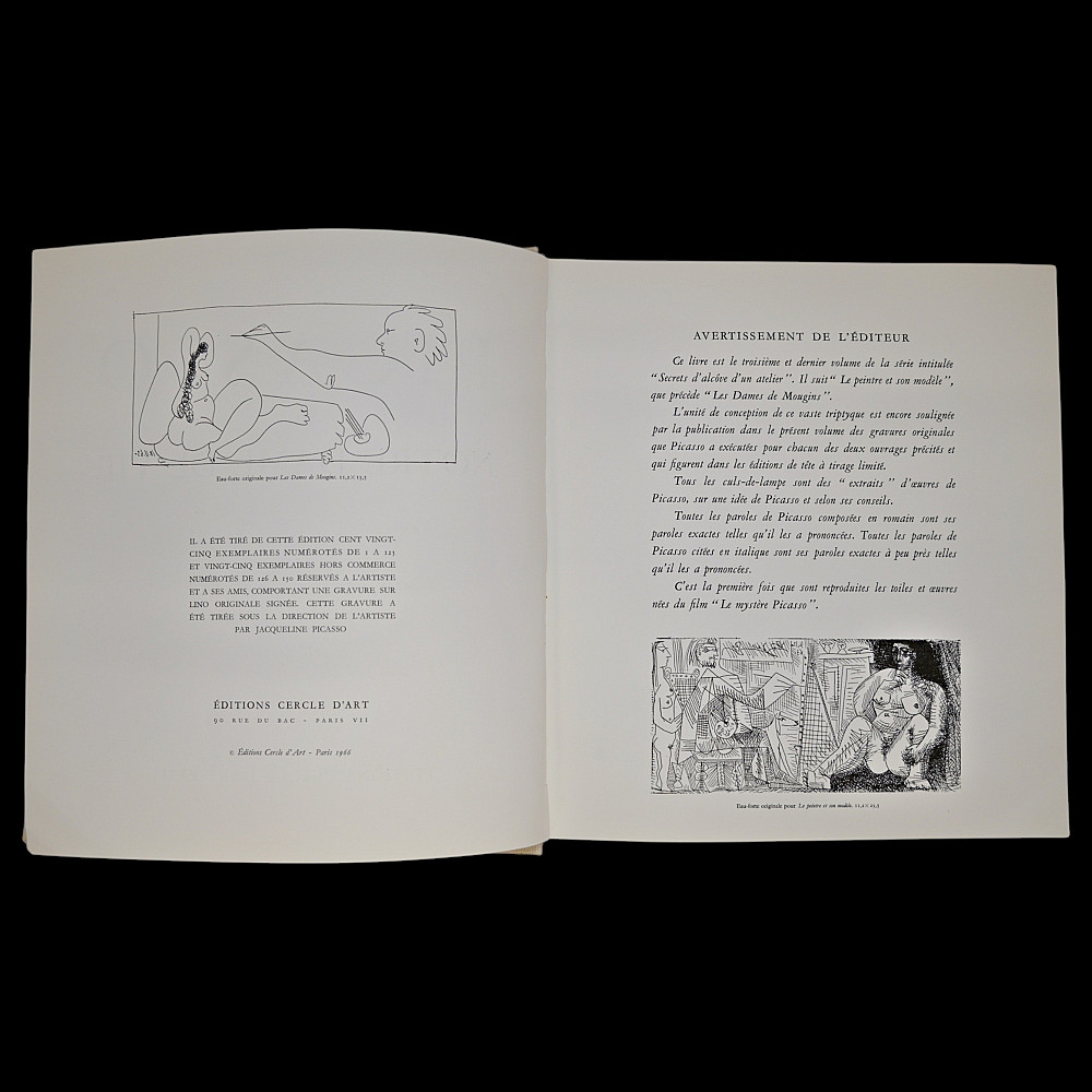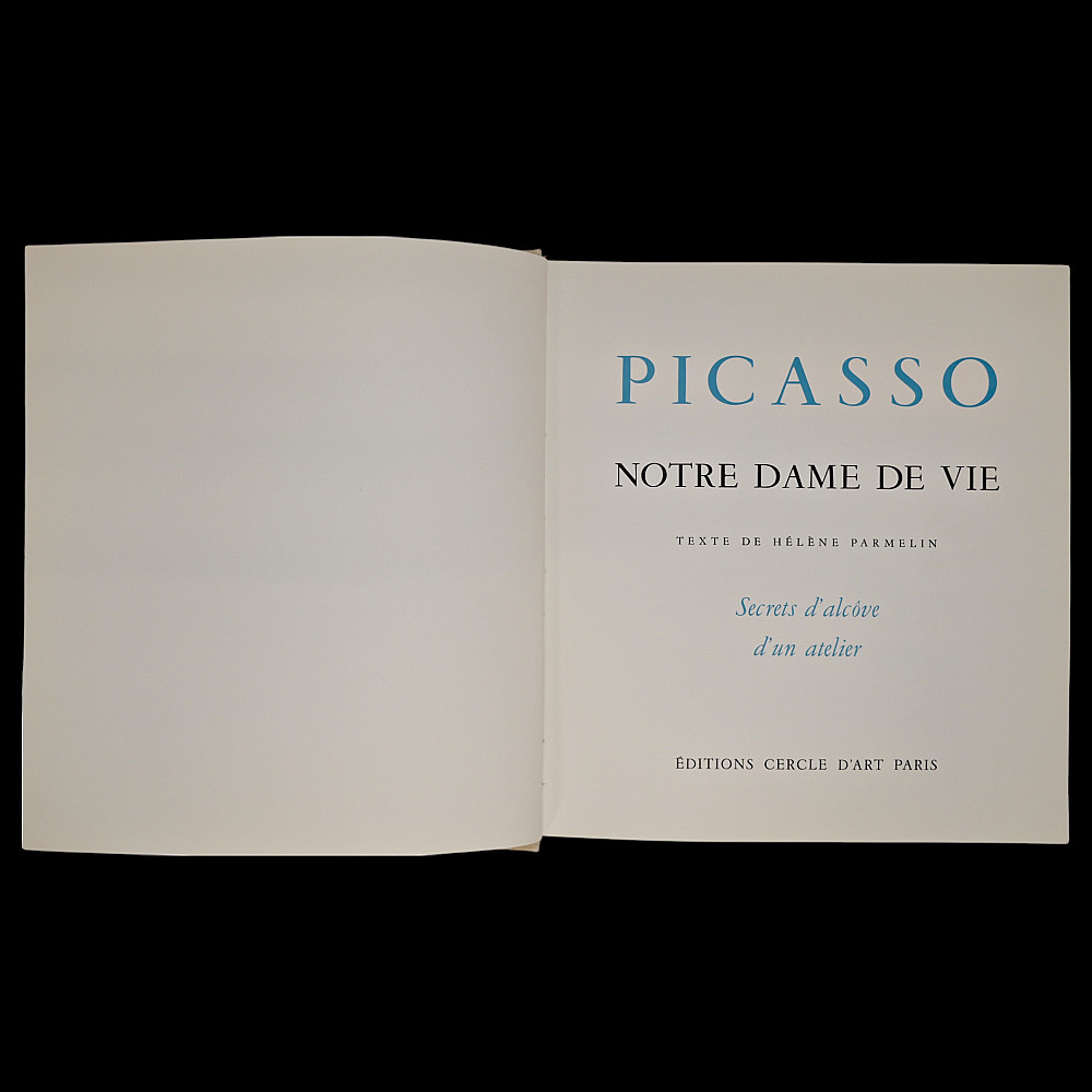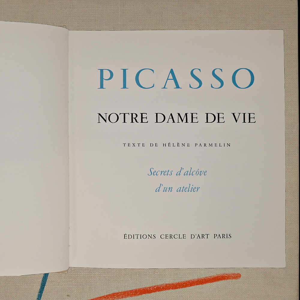 PICASSO — “Notre Dame de Vie: Secrets of a Studio’s Alcove” Text by Hélène Parmelin, Paris, 1966. A richly illustrated art book devoted to the late period of Pablo Picasso’s creative work at his Notre-Dame-de-Vie residence in Mougins, France. This rare volume captures the intimate atmosphere of the artist's studio and home, featuring a wealth of color reproductions and drawings, some printed on special paper, including lithographic plates. Parmelin’s text offers personal insights into Picasso’s daily routine, philosophical musings, and unique working methods. The book contains vivid illustrations of both abstract and figurative compositions, portraits, nudes, and animals, showcasing Picasso’s endless experimentation with color, form, and symbolism. The edition includes facsimiles of Picasso’s drawings and notes, as well as excerpts from conversations with the artist, providing a window into the life and mind of the 20th century’s greatest modern master. An essential collectible for Picasso scholars, bibliophiles, and connoisseurs of 20th-century art books. 30x30