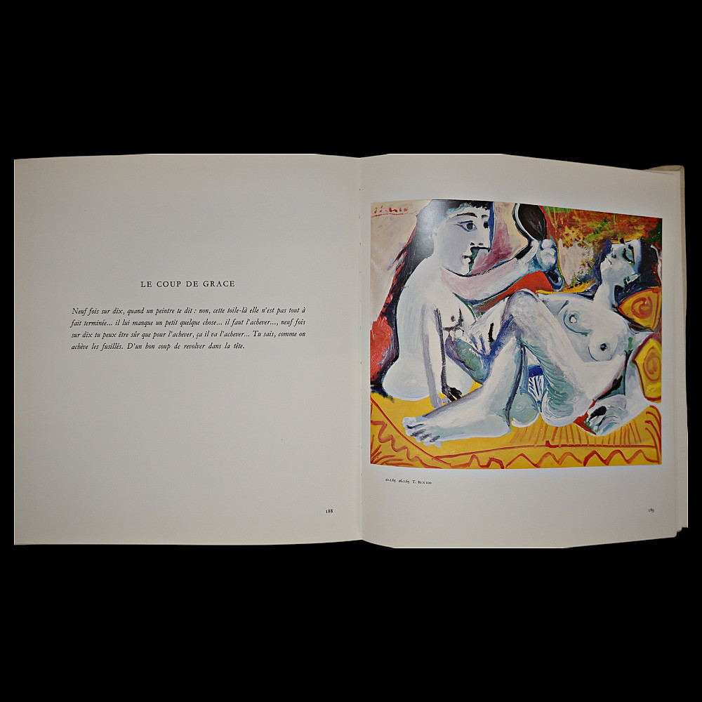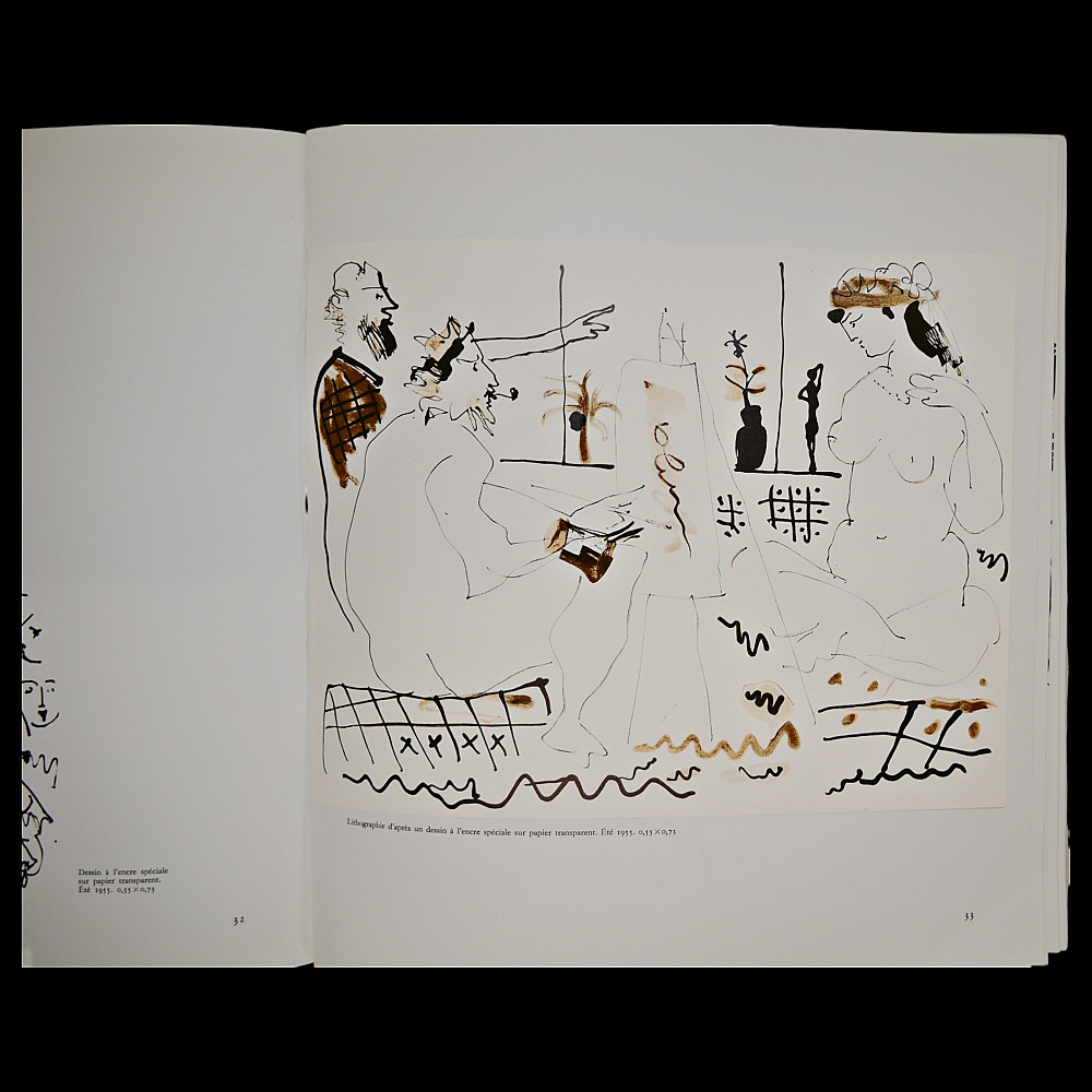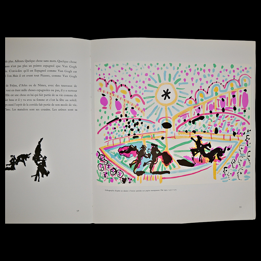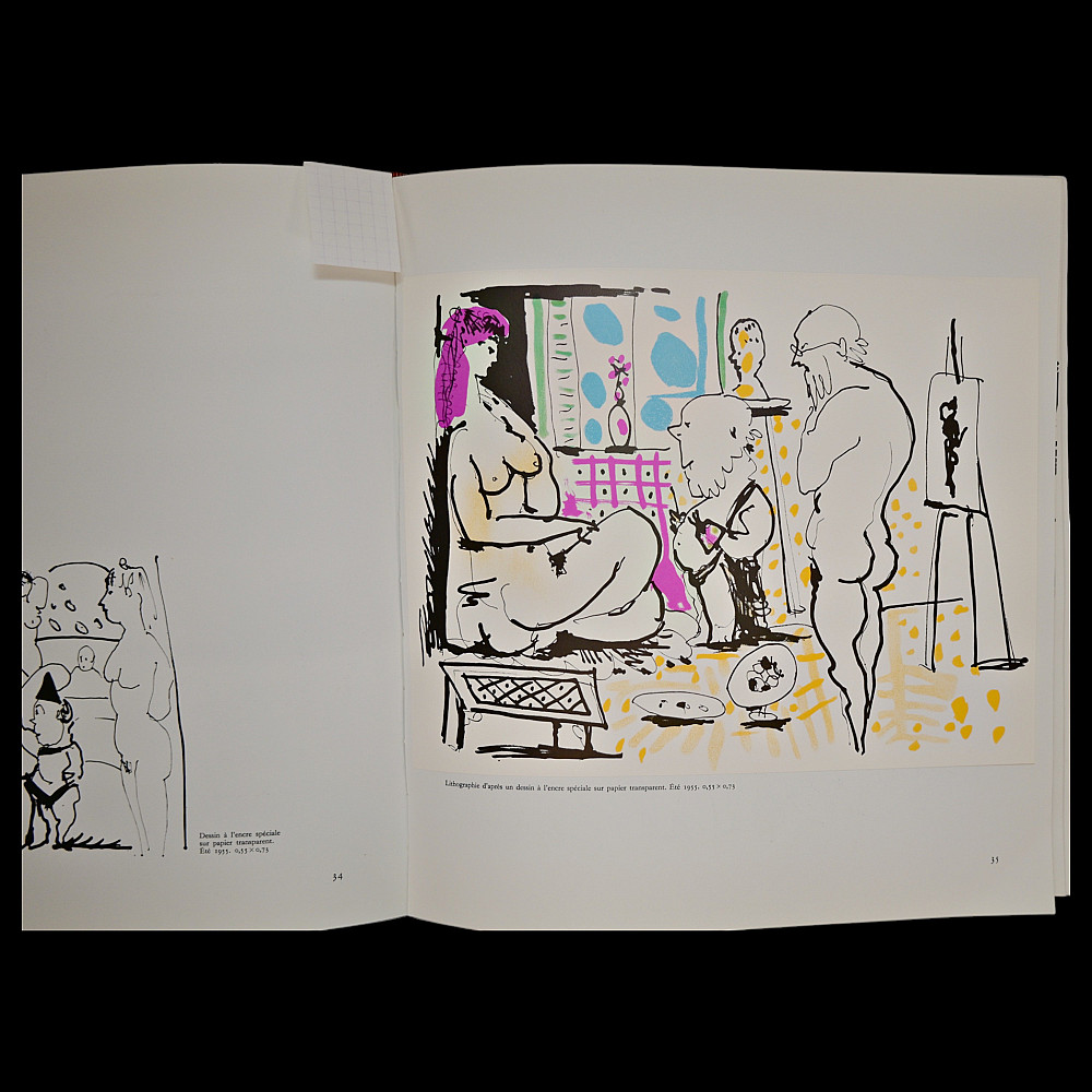 PICASSO — “Notre Dame de Vie: Secrets of a Studio’s Alcove” Text by Hélène Parmelin, Paris, 1966. A richly illustrated art book devoted to the late period of Pablo Picasso’s creative work at his Notre-Dame-de-Vie residence in Mougins, France. This rare volume captures the intimate atmosphere of the artist's studio and home, featuring a wealth of color reproductions and drawings, some printed on special paper, including lithographic plates. Parmelin’s text offers personal insights into Picasso’s daily routine, philosophical musings, and unique working methods. The book contains vivid illustrations of both abstract and figurative compositions, portraits, nudes, and animals, showcasing Picasso’s endless experimentation with color, form, and symbolism. The edition includes facsimiles of Picasso’s drawings and notes, as well as excerpts from conversations with the artist, providing a window into the life and mind of the 20th century’s greatest modern master. An essential collectible for Picasso scholars, bibliophiles, and connoisseurs of 20th-century art books. 30x30
