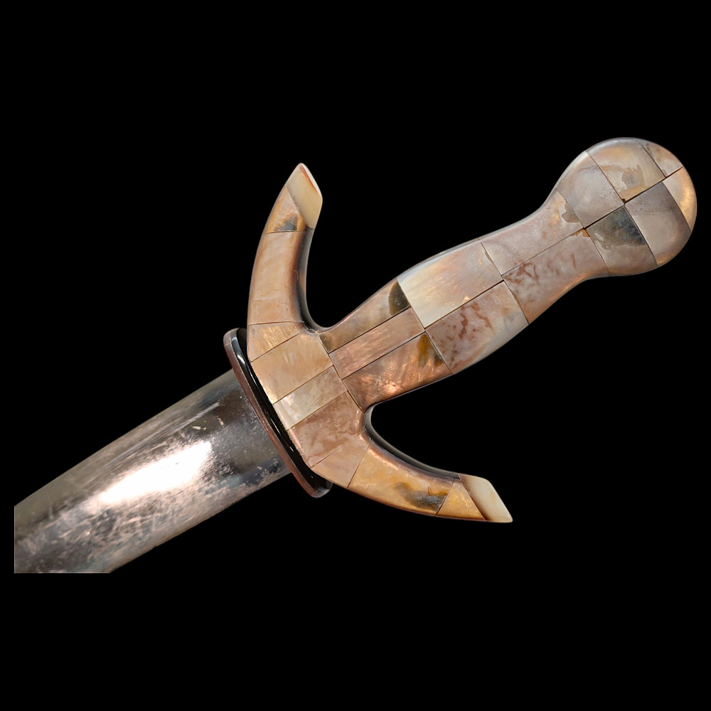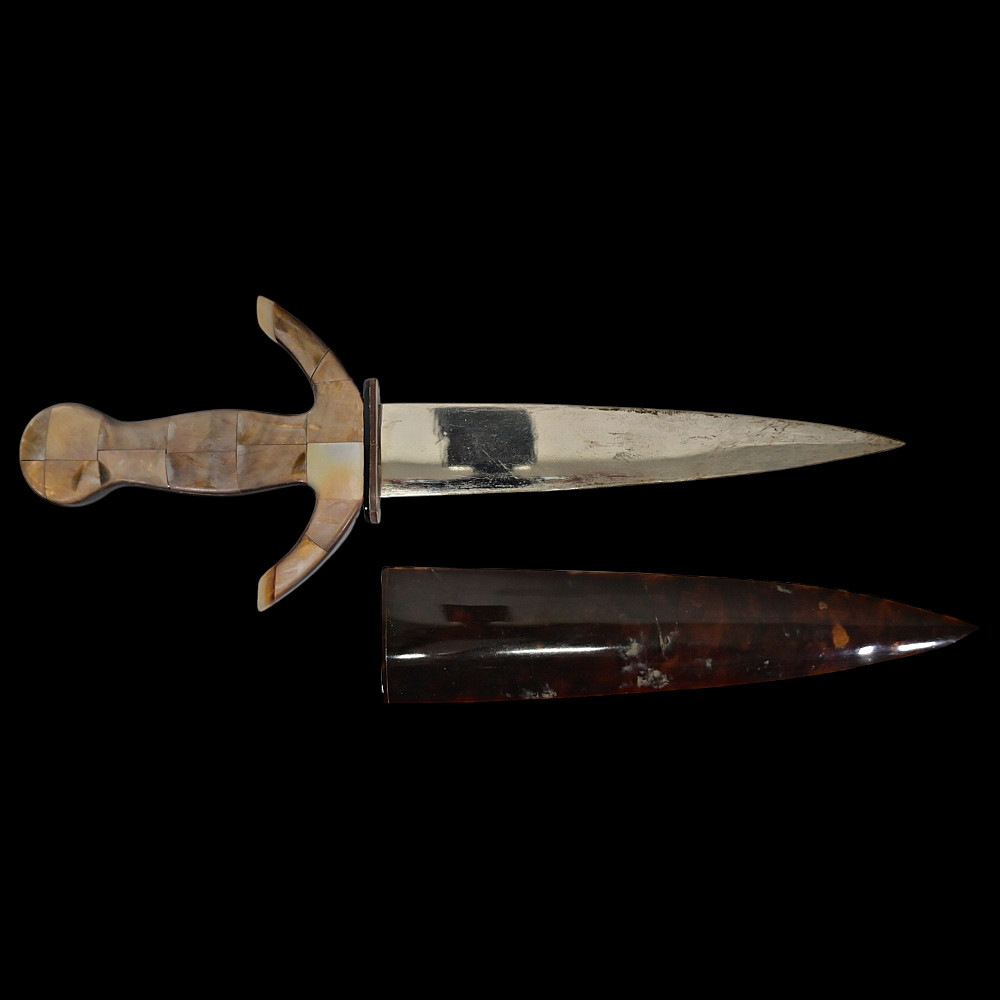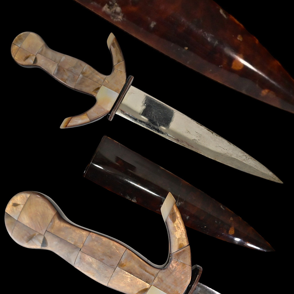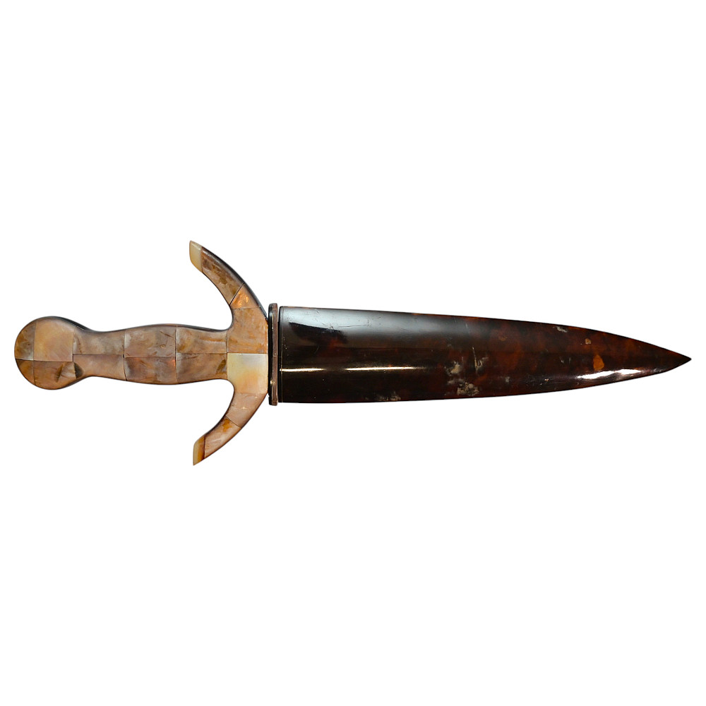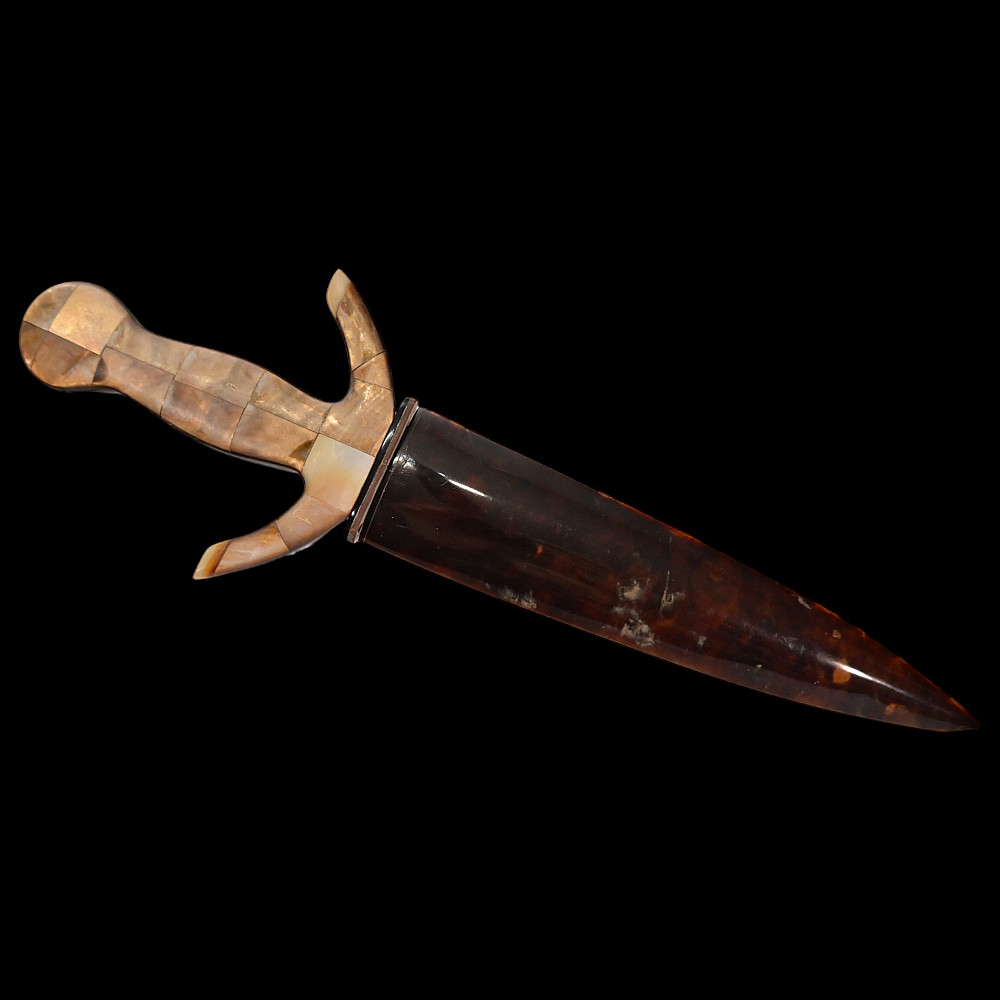 Presentation navy dagger, richly decorated with mother-of-pearl and tortoiseshell, Europe, first half of the 20th century. Steel double-edged blade. Hilt with curved guard, completely covered with mother-of-pearl overlays. Sheath covered with tortoiseshell overlays. Very beautiful collectible dagger in good condition. Length 28 cm.
