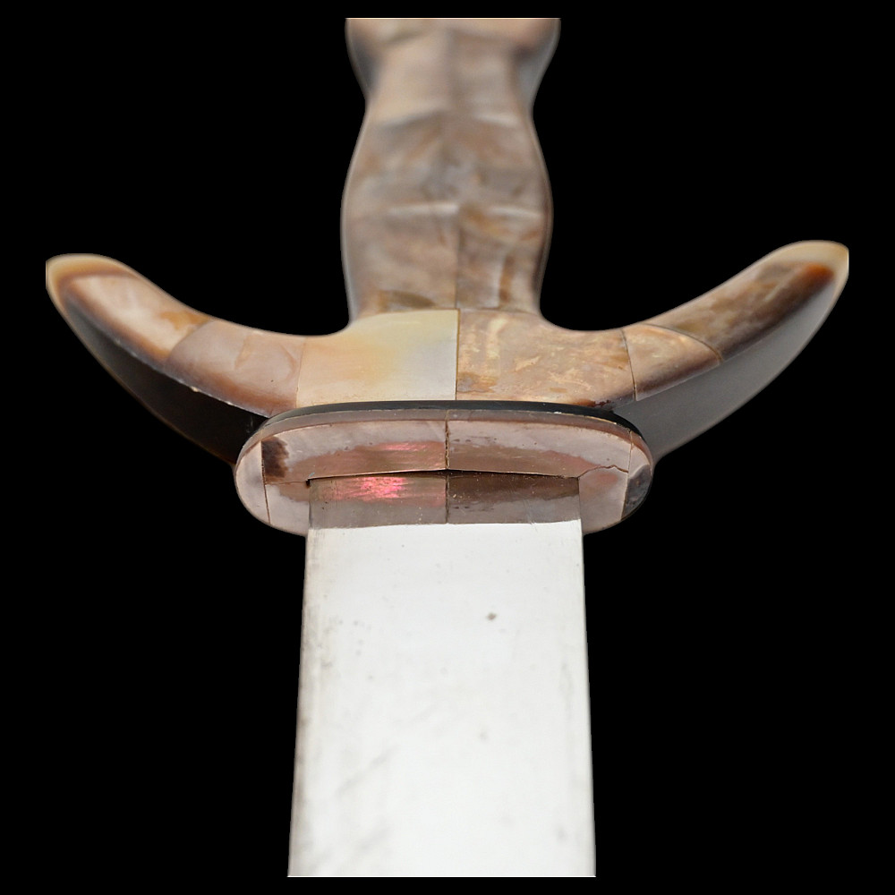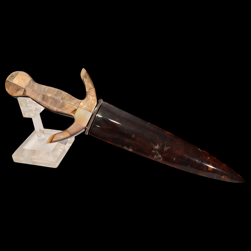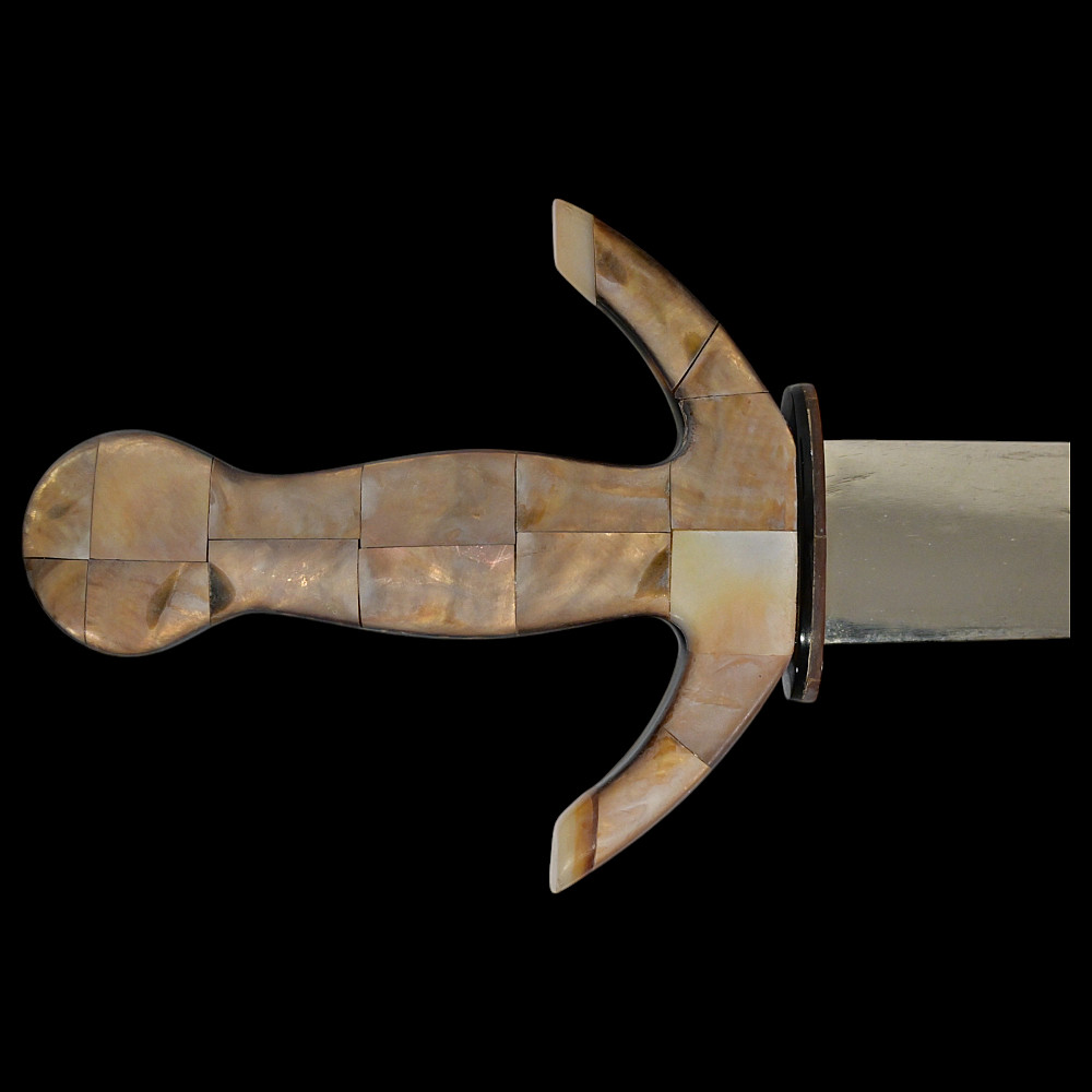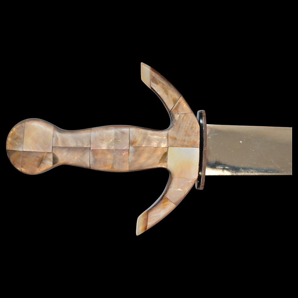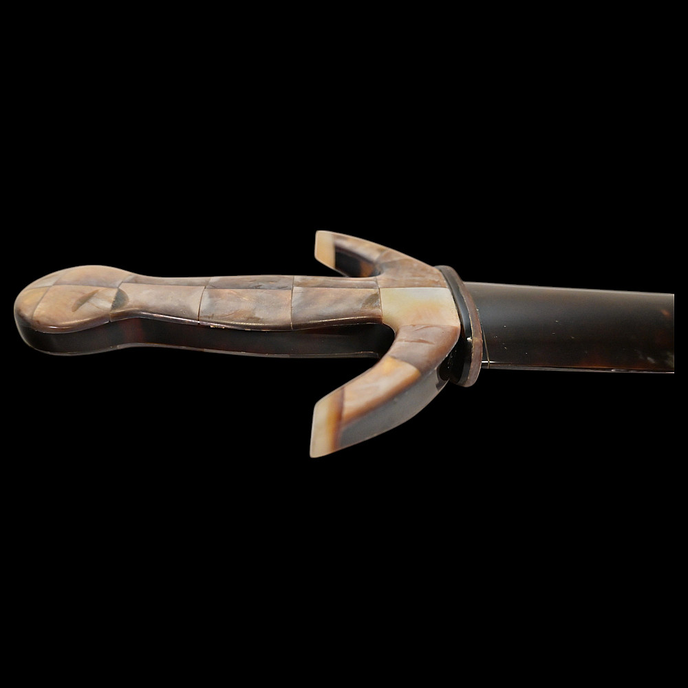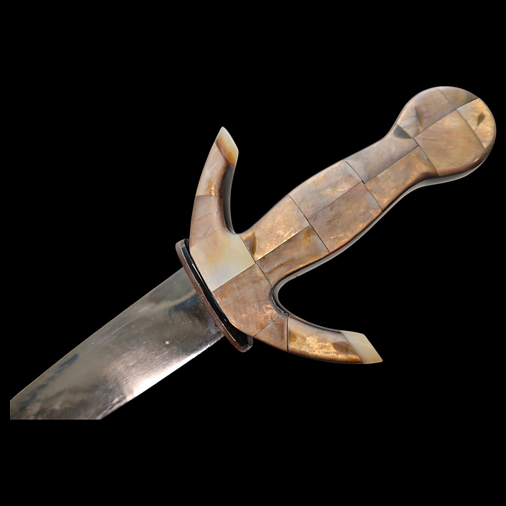 Presentation navy dagger, richly decorated with mother-of-pearl and tortoiseshell, Europe, first half of the 20th century. Steel double-edged blade. Hilt with curved guard, completely covered with mother-of-pearl overlays. Sheath covered with tortoiseshell overlays. Very beautiful collectible dagger in good condition. Length 28 cm.