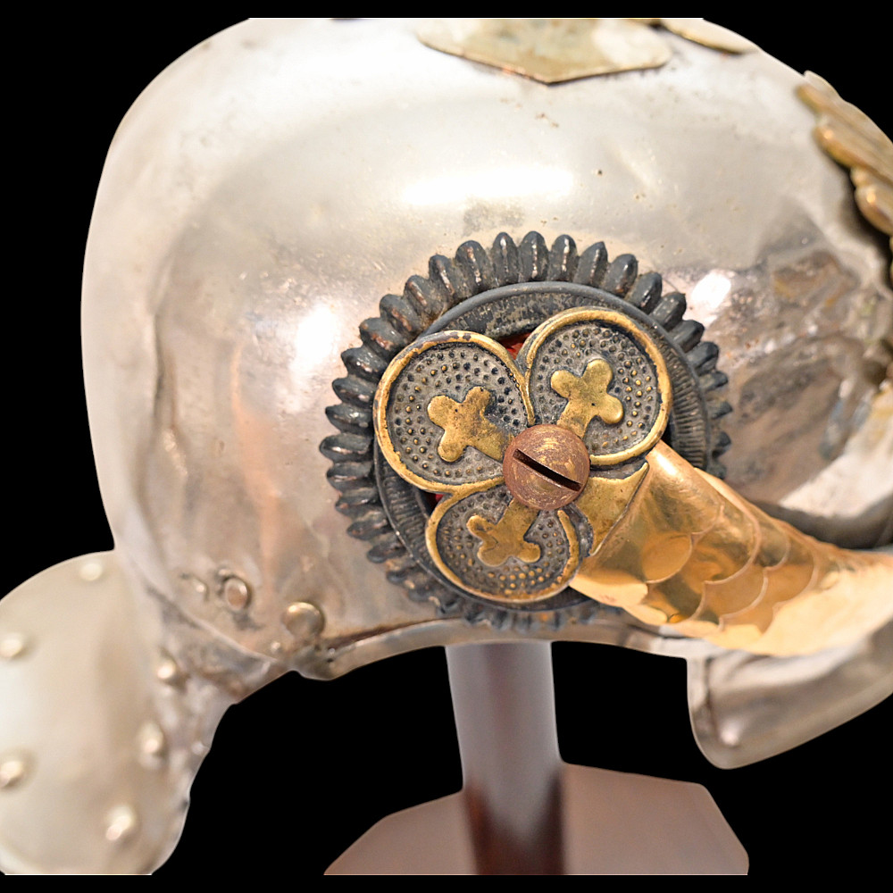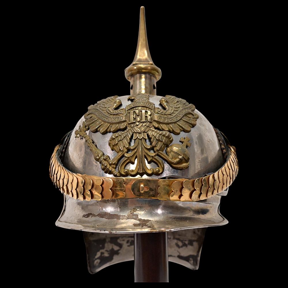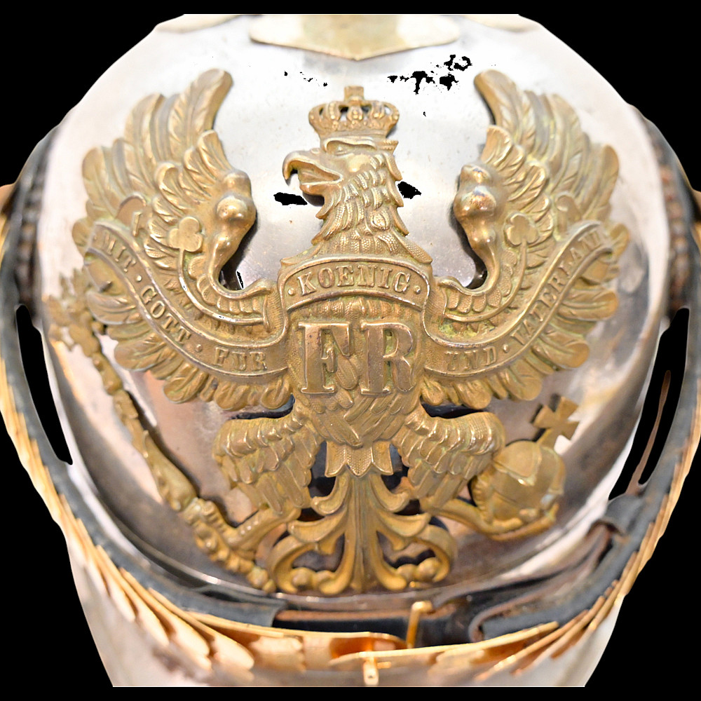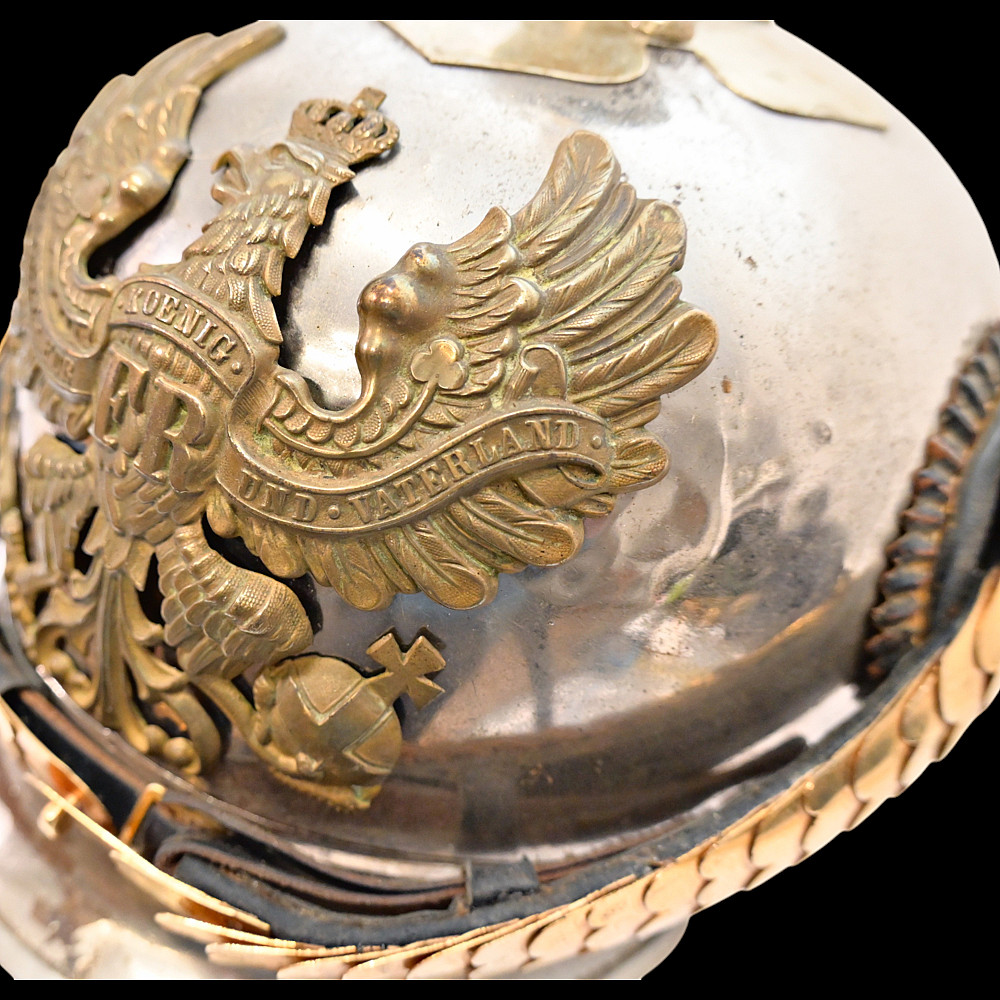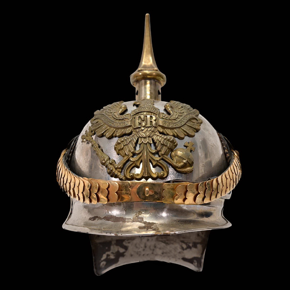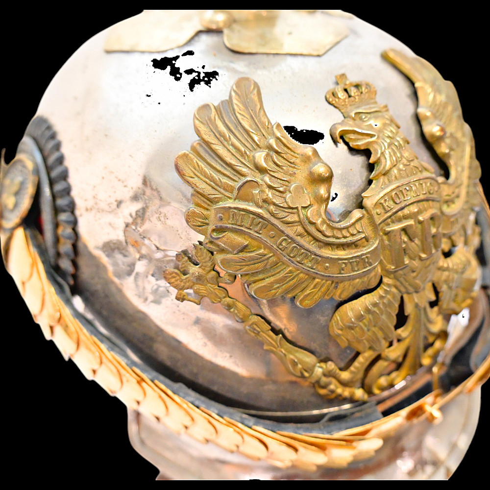 Prussian Cuirassier Officer's Helmet (Kurassierhelm), circa 1900. An elegant and finely crafted officer’s helmet of the Prussian Cuirassier Regiments, executed in polished nickel-silver with brass mounts. The helmet features the tall, graceful spike with ventilated base, affixed by four bolts. The impressive front plate (Wappen) bears the gilt Prussian eagle clutching sword and scepter, with the royal cipher “FR” for Friedrich Rex and the motto “Mit Gott fur Konig und Vaterland” (“With God for King and Fatherland”). The helmet retains its brass chinscales, mounted on beautifully detailed officer-style rosettes with clover-leaf design. The interior shows a traditional green fabric lining with brown leather sweatband, typical for privately purchased officer models. Condition: Good, there are signs of repair and small dents. See photo. Height: approx. 30 cm (to spike).