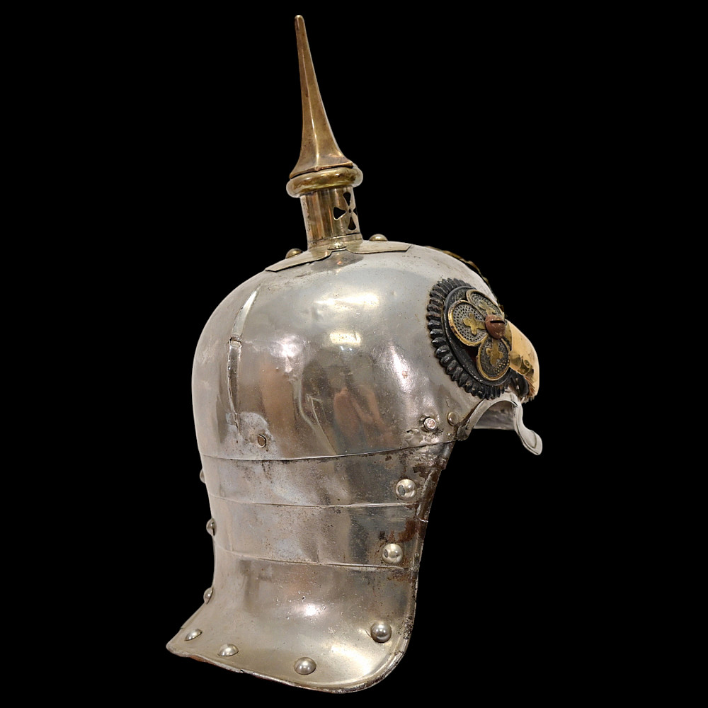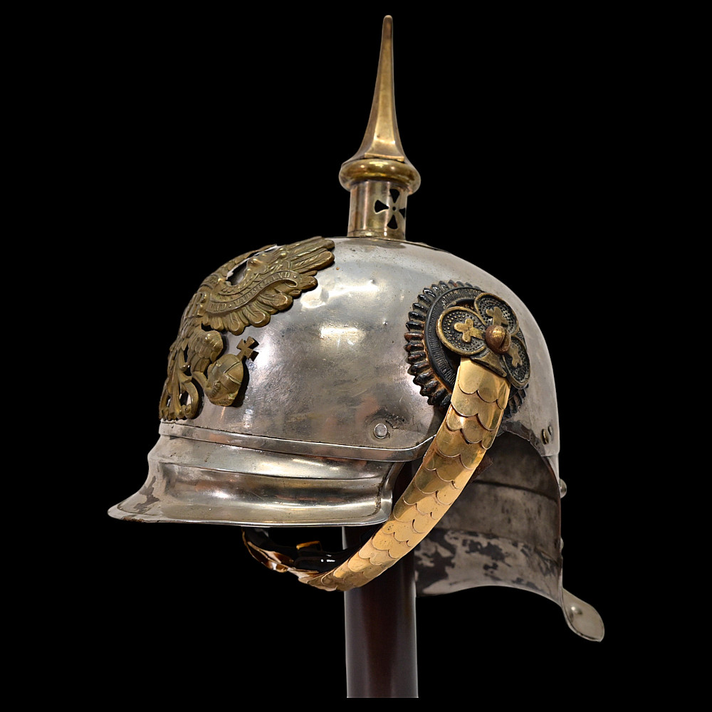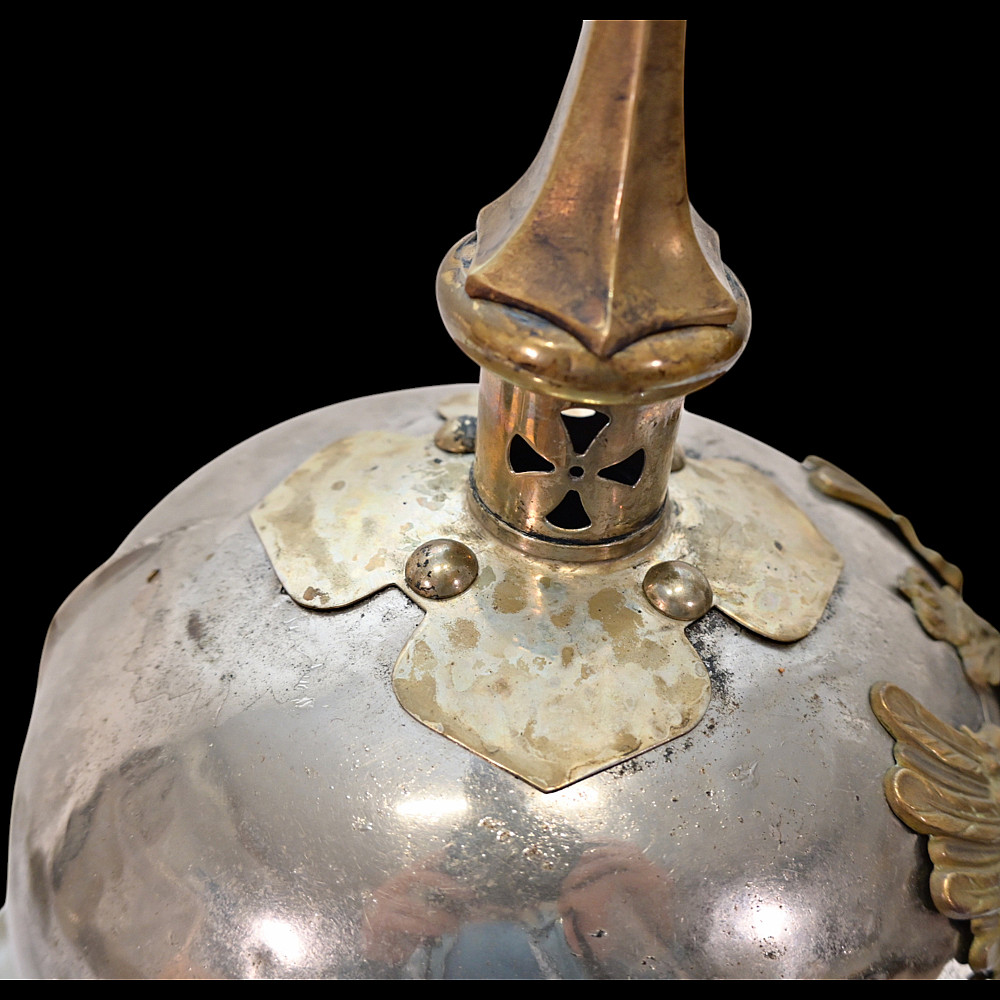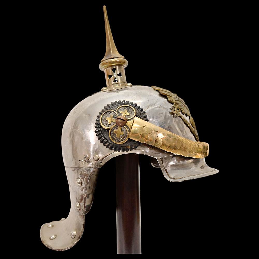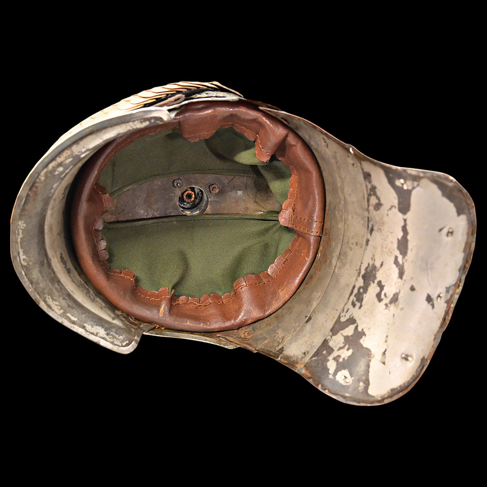 Prussian Cuirassier Officer's Helmet (Kurassierhelm), circa 1900. An elegant and finely crafted officer’s helmet of the Prussian Cuirassier Regiments, executed in polished nickel-silver with brass mounts. The helmet features the tall, graceful spike with ventilated base, affixed by four bolts. The impressive front plate (Wappen) bears the gilt Prussian eagle clutching sword and scepter, with the royal cipher “FR” for Friedrich Rex and the motto “Mit Gott fur Konig und Vaterland” (“With God for King and Fatherland”). The helmet retains its brass chinscales, mounted on beautifully detailed officer-style rosettes with clover-leaf design. The interior shows a traditional green fabric lining with brown leather sweatband, typical for privately purchased officer models. Condition: Good, there are signs of repair and small dents. See photo. Height: approx. 30 cm (to spike).