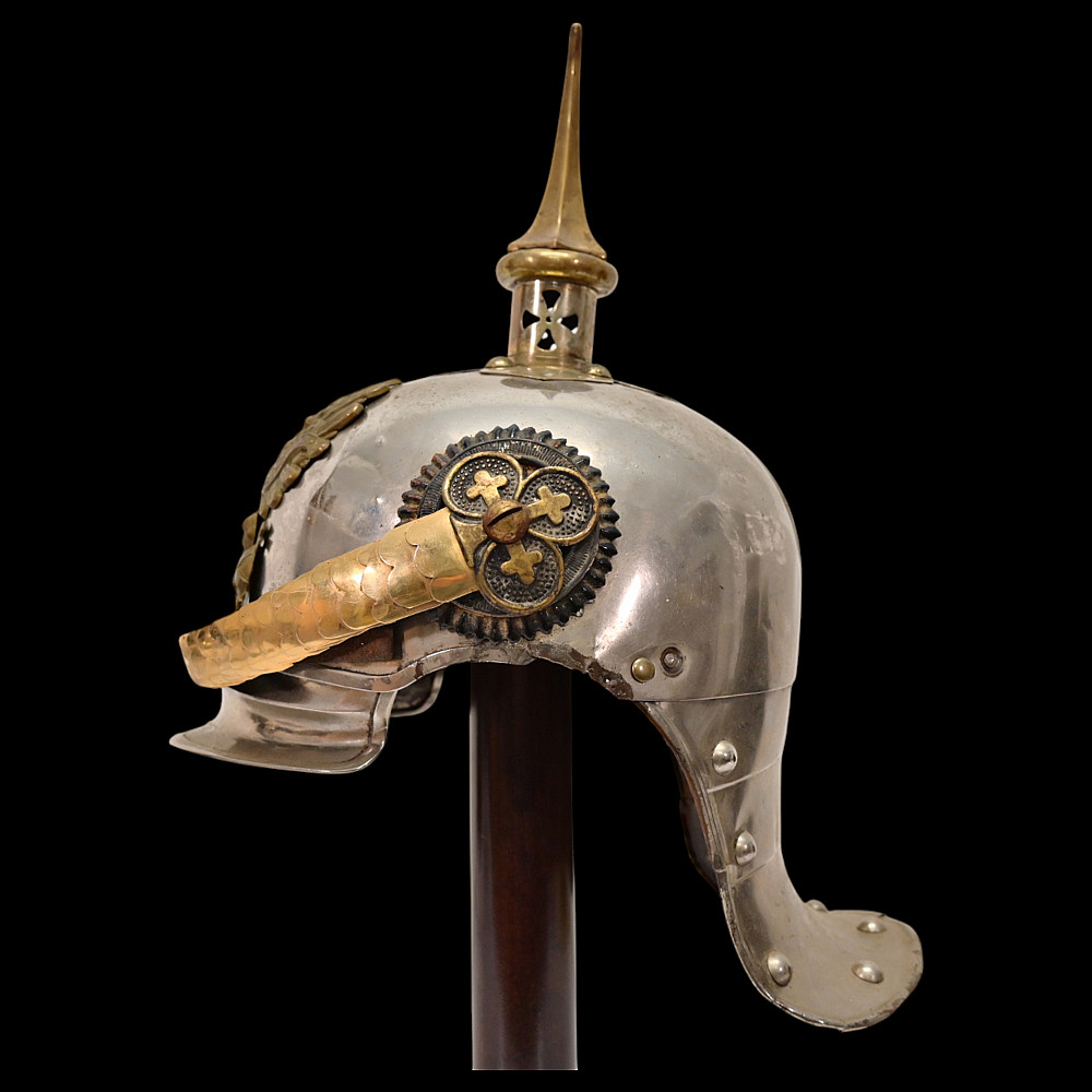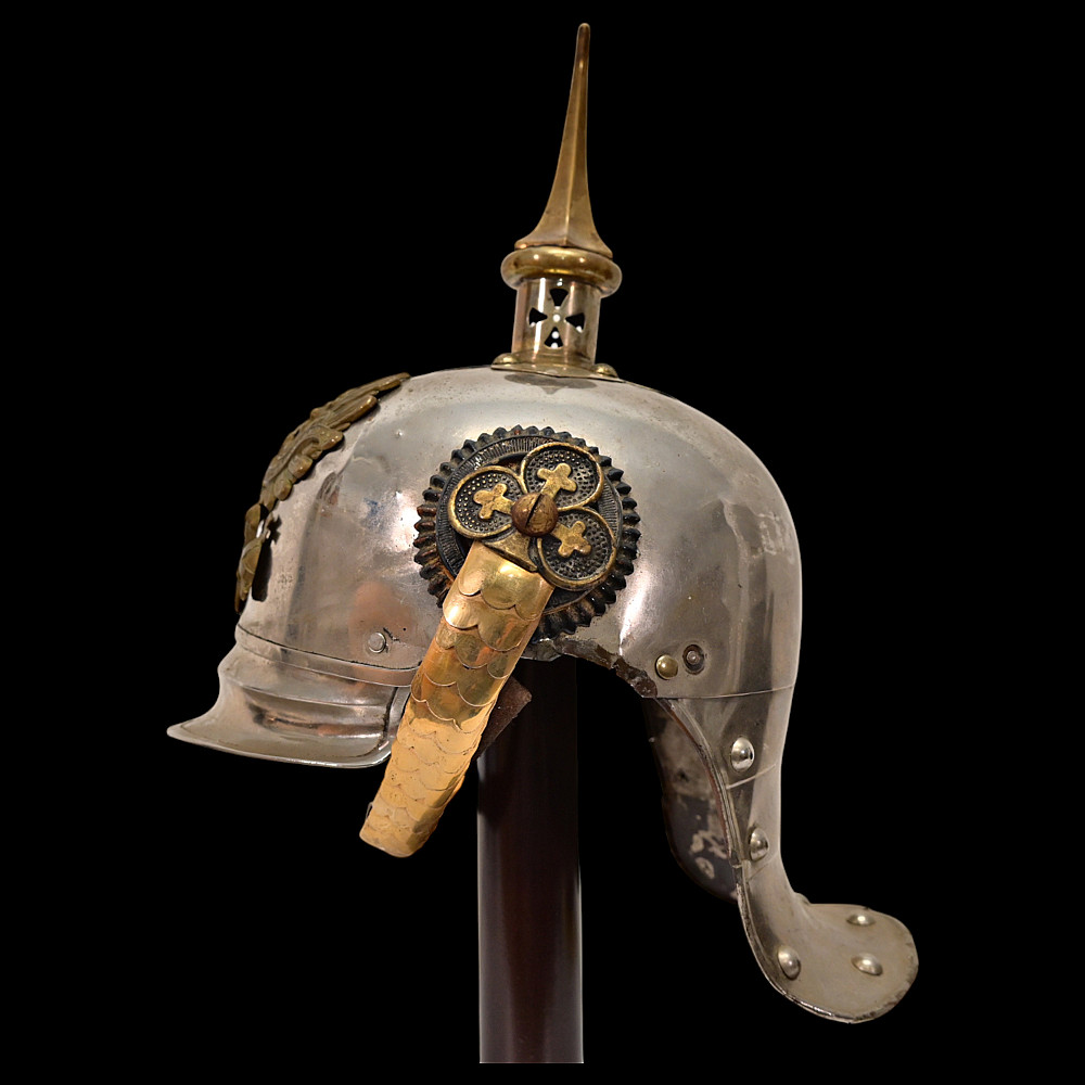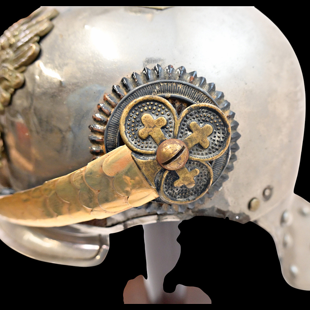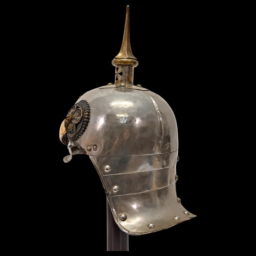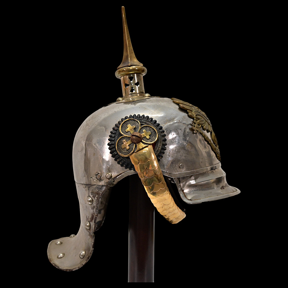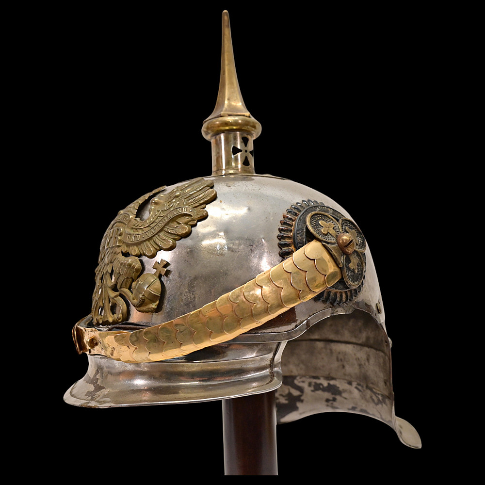 Prussian Cuirassier Officer's Helmet (Kurassierhelm), circa 1900. An elegant and finely crafted officer’s helmet of the Prussian Cuirassier Regiments, executed in polished nickel-silver with brass mounts. The helmet features the tall, graceful spike with ventilated base, affixed by four bolts. The impressive front plate (Wappen) bears the gilt Prussian eagle clutching sword and scepter, with the royal cipher “FR” for Friedrich Rex and the motto “Mit Gott fur Konig und Vaterland” (“With God for King and Fatherland”). The helmet retains its brass chinscales, mounted on beautifully detailed officer-style rosettes with clover-leaf design. The interior shows a traditional green fabric lining with brown leather sweatband, typical for privately purchased officer models. Condition: Good, there are signs of repair and small dents. See photo. Height: approx. 30 cm (to spike).