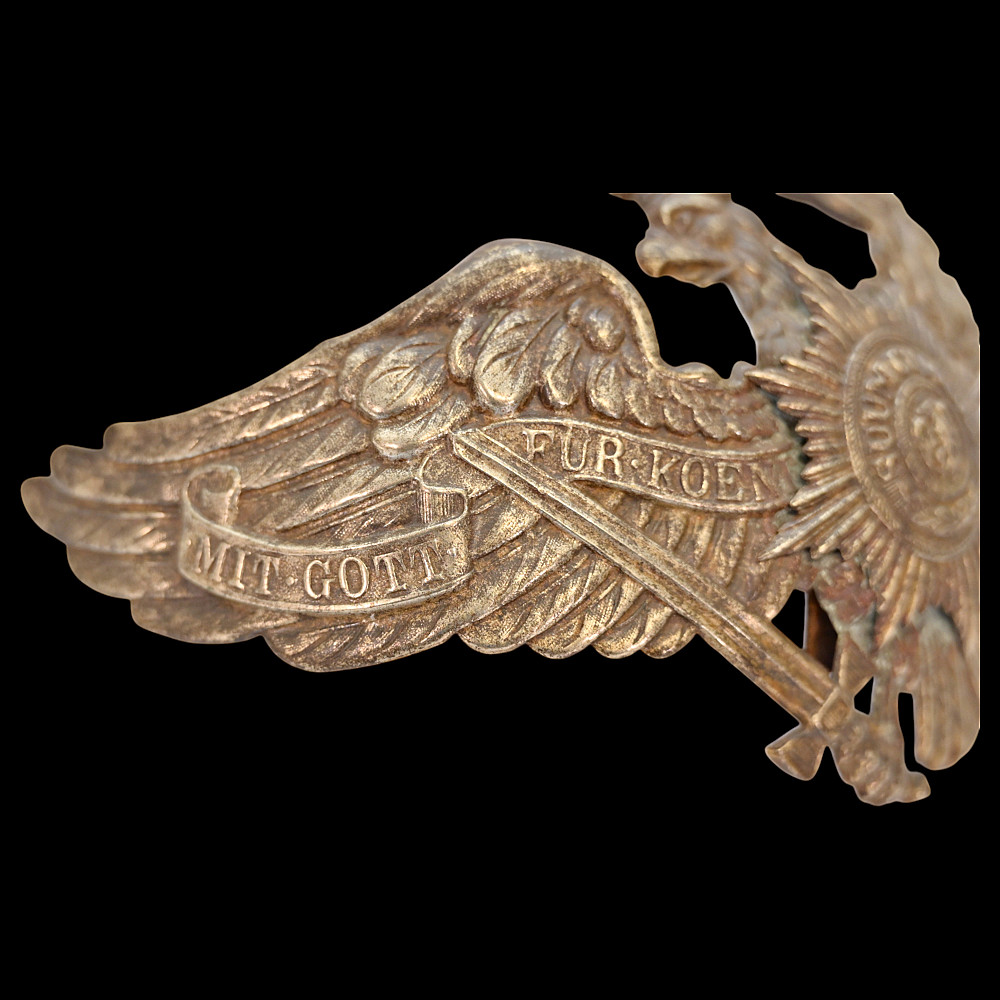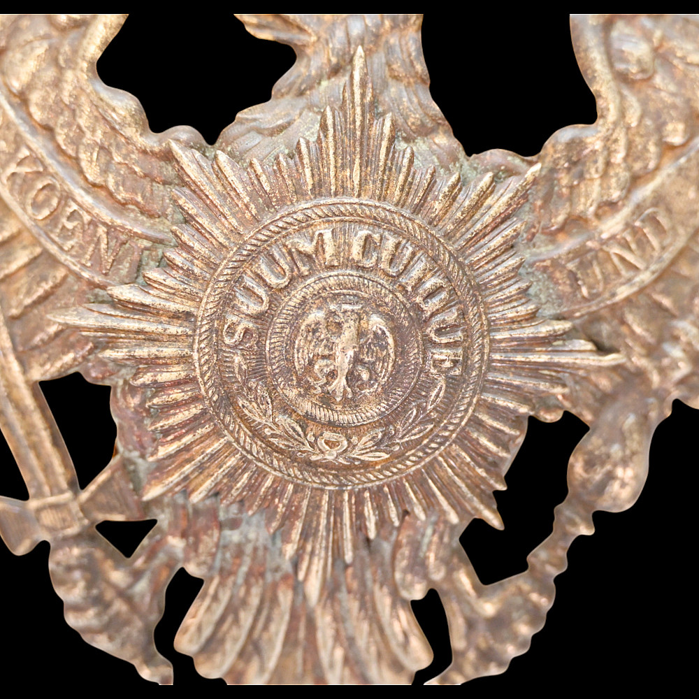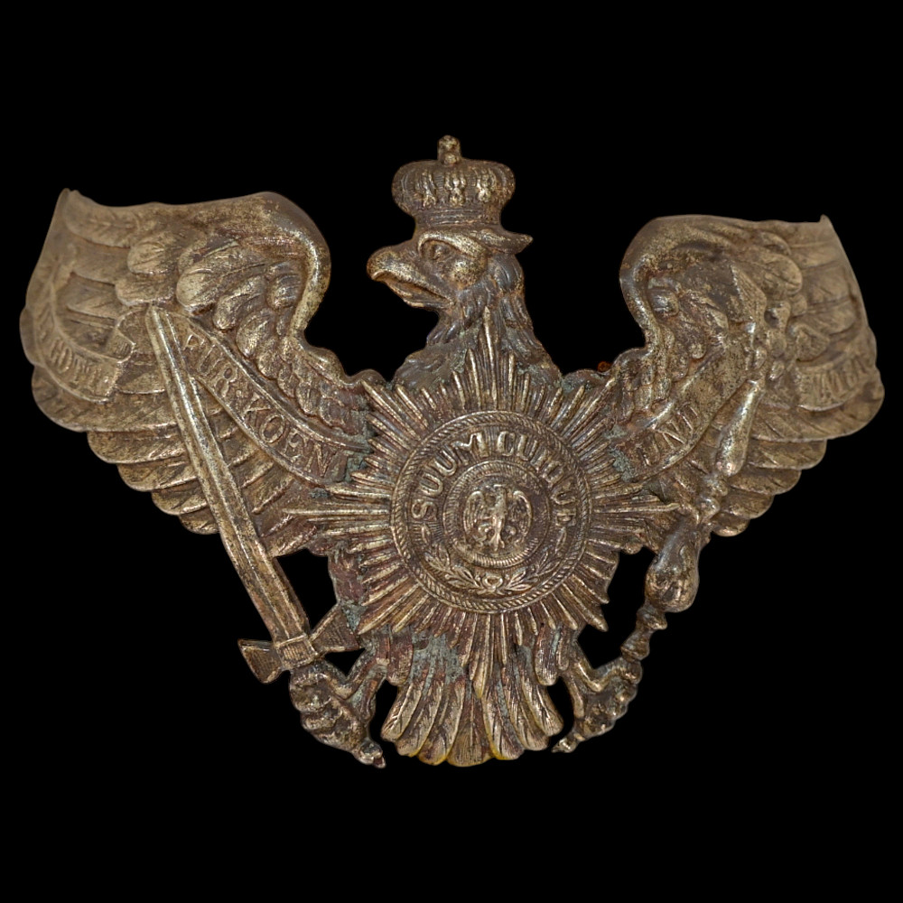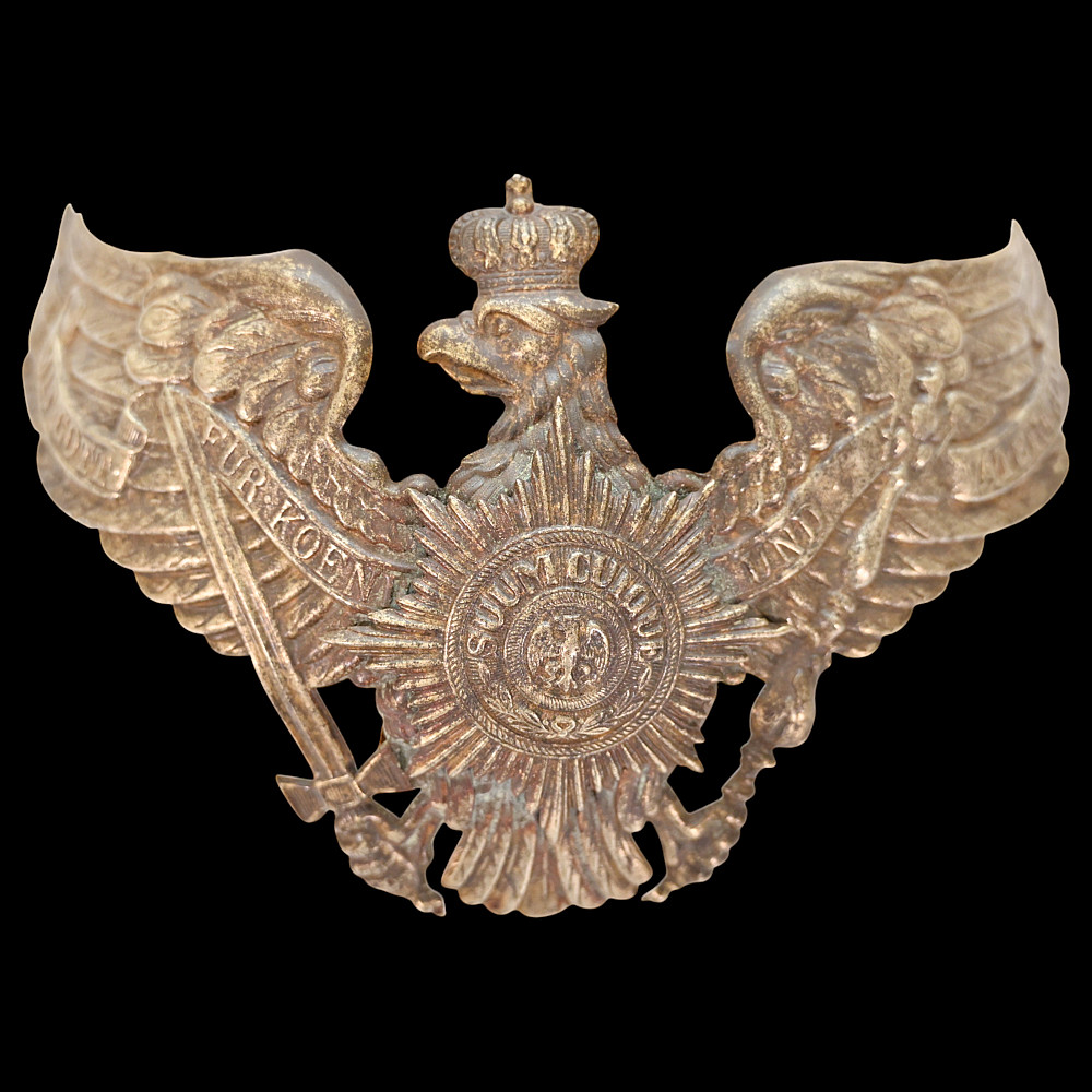 Prussian Guard Eagle Helmet Plate (Wappen), circa 1895–1914. An exceptional Imperial German Prussian Guard Officer’s front plate (Wappen), designed for the Pickelhaube helmet of the elite Garde regiments. The magnificent silver-plated Guard eagle bears outspread wings, crowned head, and the sword and scepter of Prussia, with the national motto “Mit Gott für Konig und Vaterland” (“With God for King and Fatherland”) across its banners. At the eagle’s breast shines the finely detailed Guard Star of the Order of the Black Eagle, inscribed “Suum Cuique” (“To Each His Own”), surrounding the crowned cipher of the Prussian monarchy. This example is crisply struck with fine detailing and retains traces of original silver finish. Condition: Excellent preservation with light age patina and minimal wear. The Guard regiments of the Prussian Army were the most prestigious formations in Imperial Germany, serving directly under the Kaiser. Their helmets were adorned with this distinct Guard Wappen, setting them apart from all other Prussian units. The Guard Star motif was derived from the Order of the Black Eagle — the highest Prussian order of chivalry. Condition: Good preservation with light age patina and minimal wear. Dimensions: approx. 18 cm wide x 12 cm high.