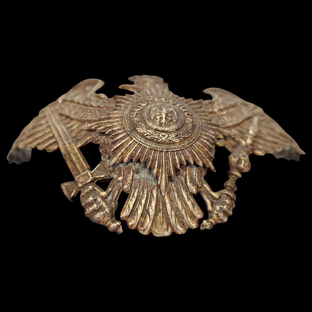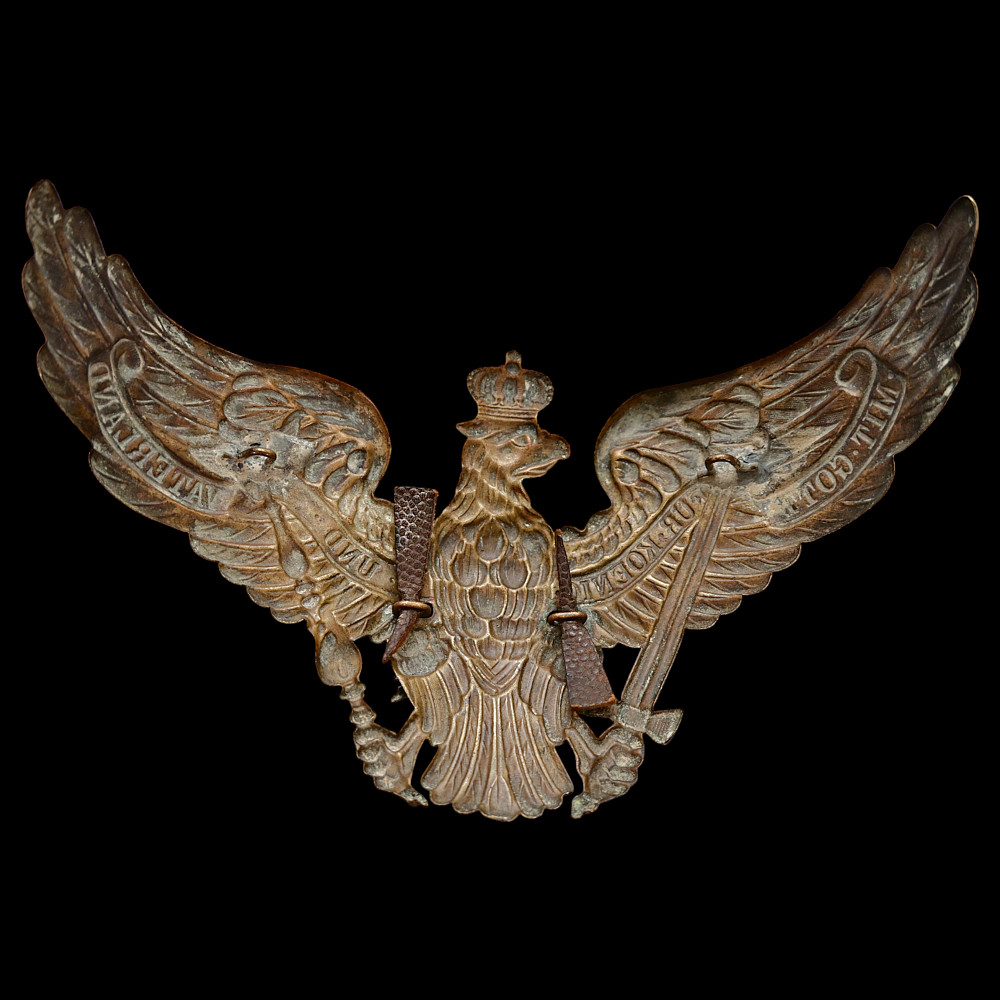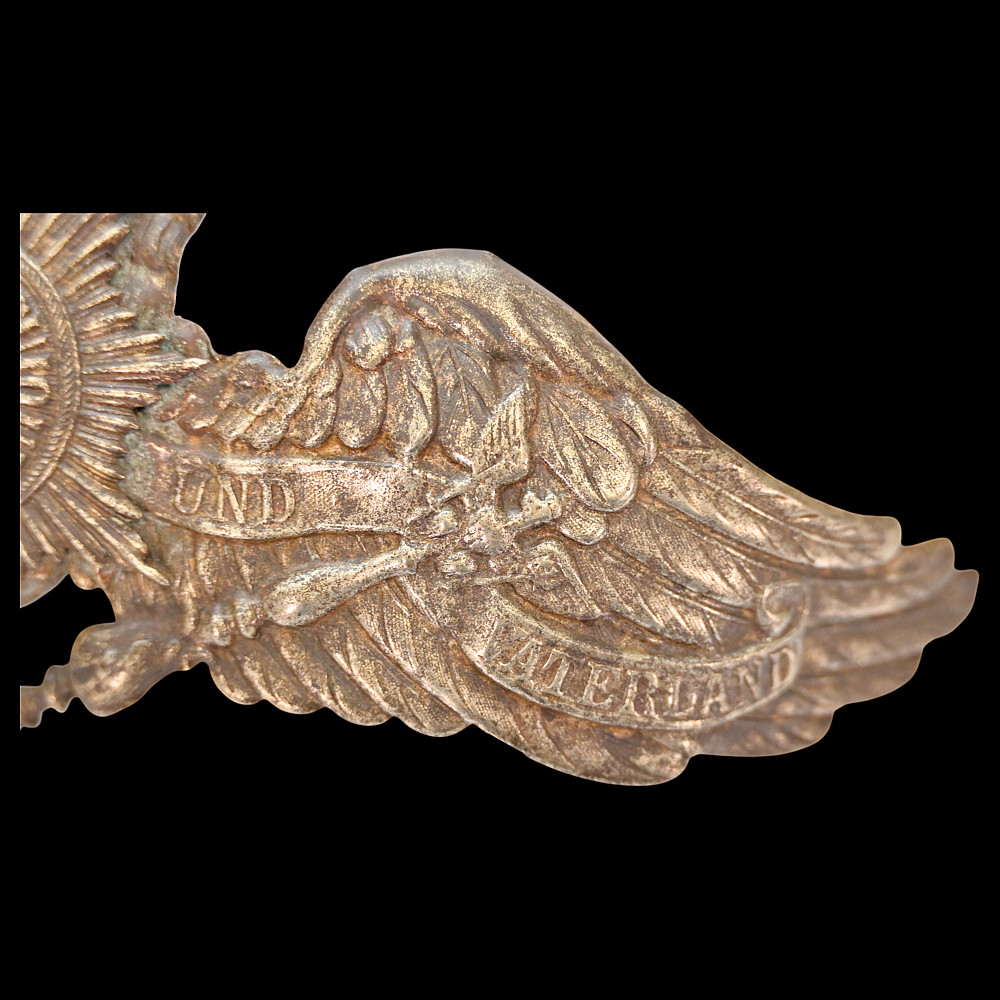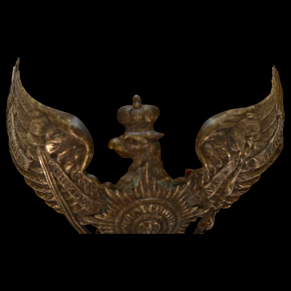 Prussian Guard Eagle Helmet Plate (Wappen), circa 1895–1914. An exceptional Imperial German Prussian Guard Officer’s front plate (Wappen), designed for the Pickelhaube helmet of the elite Garde regiments. The magnificent silver-plated Guard eagle bears outspread wings, crowned head, and the sword and scepter of Prussia, with the national motto “Mit Gott für Konig und Vaterland” (“With God for King and Fatherland”) across its banners. At the eagle’s breast shines the finely detailed Guard Star of the Order of the Black Eagle, inscribed “Suum Cuique” (“To Each His Own”), surrounding the crowned cipher of the Prussian monarchy. This example is crisply struck with fine detailing and retains traces of original silver finish. Condition: Excellent preservation with light age patina and minimal wear. The Guard regiments of the Prussian Army were the most prestigious formations in Imperial Germany, serving directly under the Kaiser. Their helmets were adorned with this distinct Guard Wappen, setting them apart from all other Prussian units. The Guard Star motif was derived from the Order of the Black Eagle — the highest Prussian order of chivalry. Condition: Good preservation with light age patina and minimal wear. Dimensions: approx. 18 cm wide x 12 cm high.