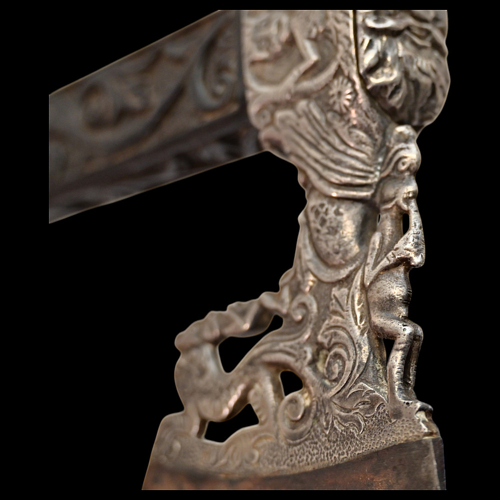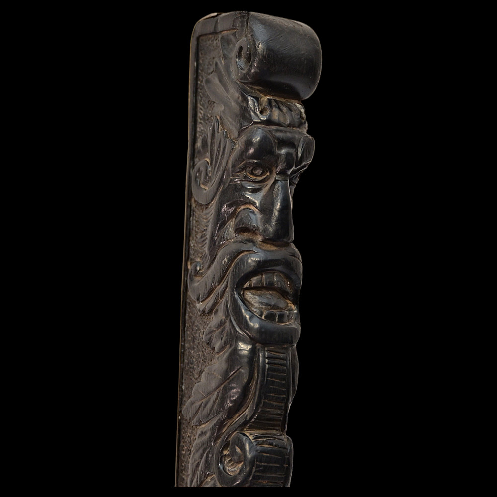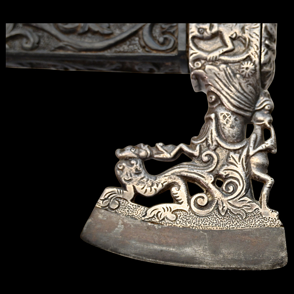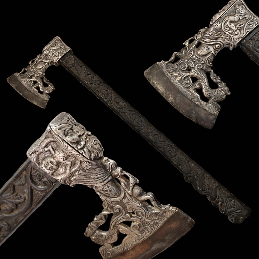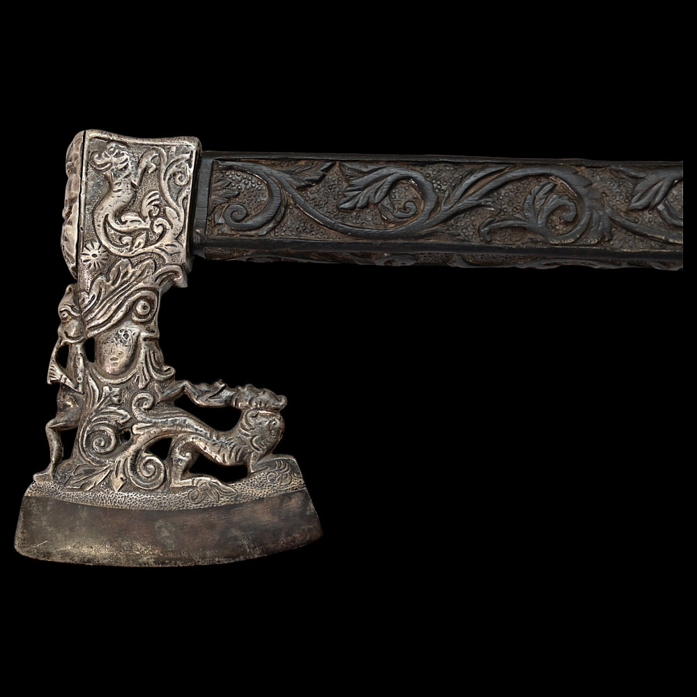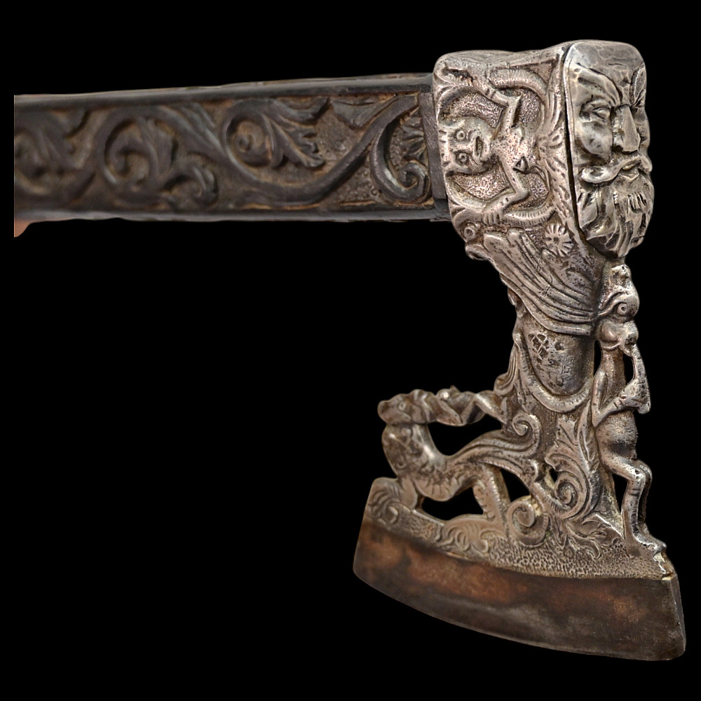Rare Axe of the Admiral of the Venetian Republic, 16th century. This object served as a command staff that was used by admirals of the Venetian fleet in the 16th century. The iron body with a small convex blade is chiselled in high relief with figures, monsters, and silhouettes; the square base is chiselled with figures and animals with a mask at the top. The black wood shaft is richly decorated with carved floral ornaments and a mascaron at the tip. A very rare collectible Renaissance axe. Excellent condition for 44 cm.