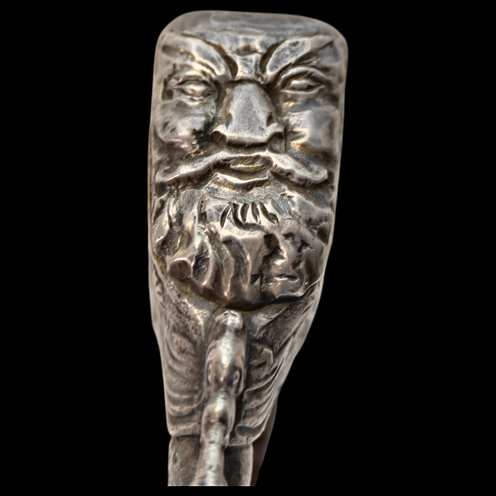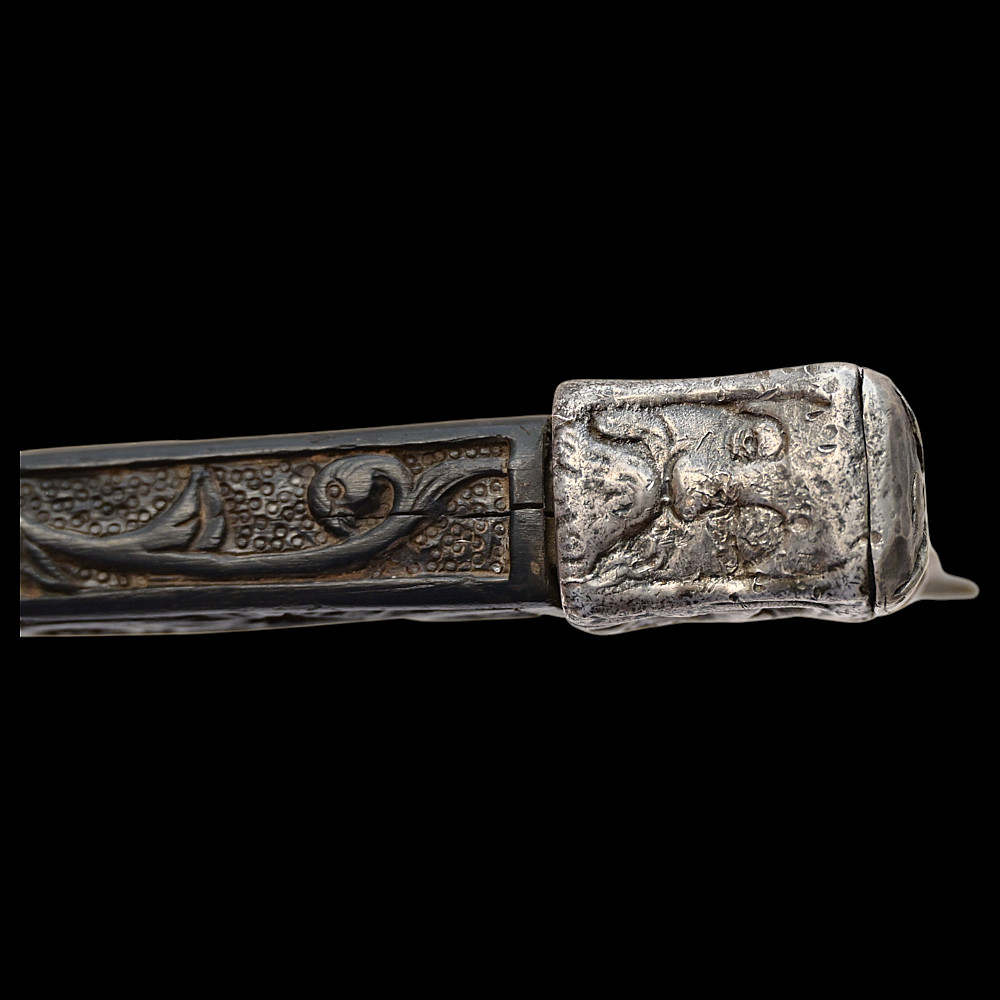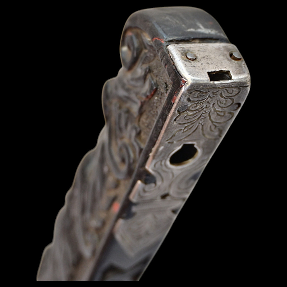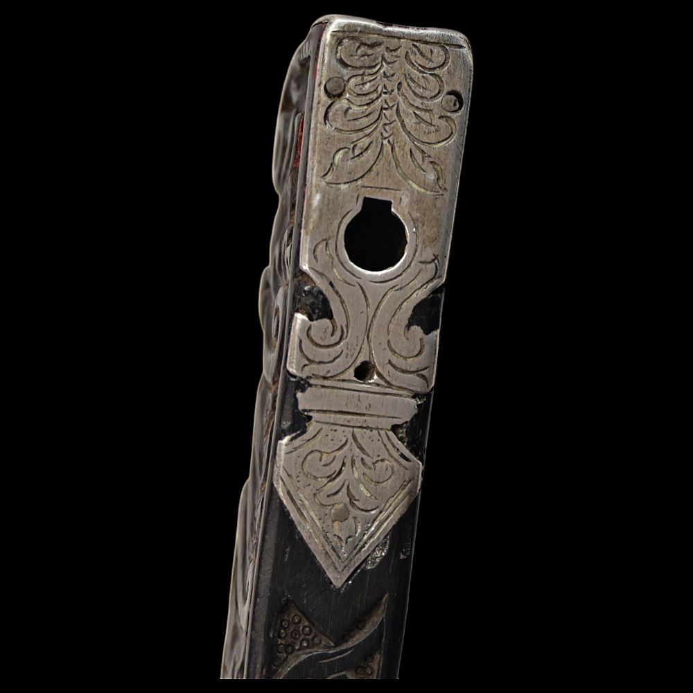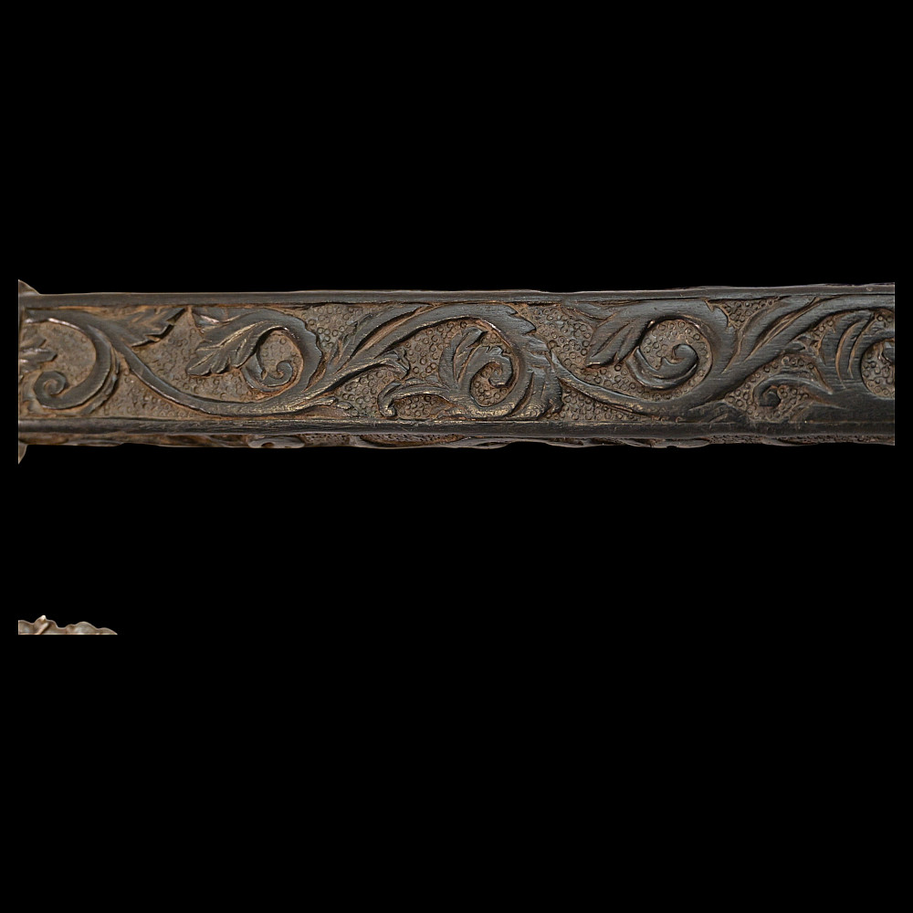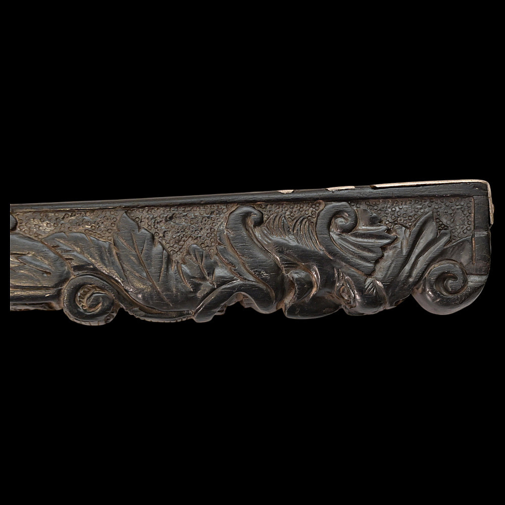 Rare Axe of the Admiral of the Venetian Republic, 16th century. This object served as a command staff that was used by admirals of the Venetian fleet in the 16th century. The iron body with a small convex blade is chiselled in high relief with figures, monsters, and silhouettes; the square base is chiselled with figures and animals with a mask at the top. The black wood shaft is richly decorated with carved floral ornaments and a mascaron at the tip. A very rare collectible Renaissance axe. Excellent condition for 44 cm.