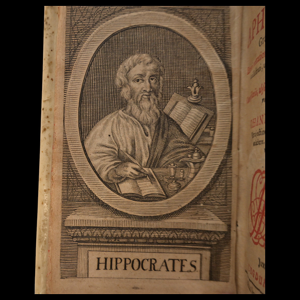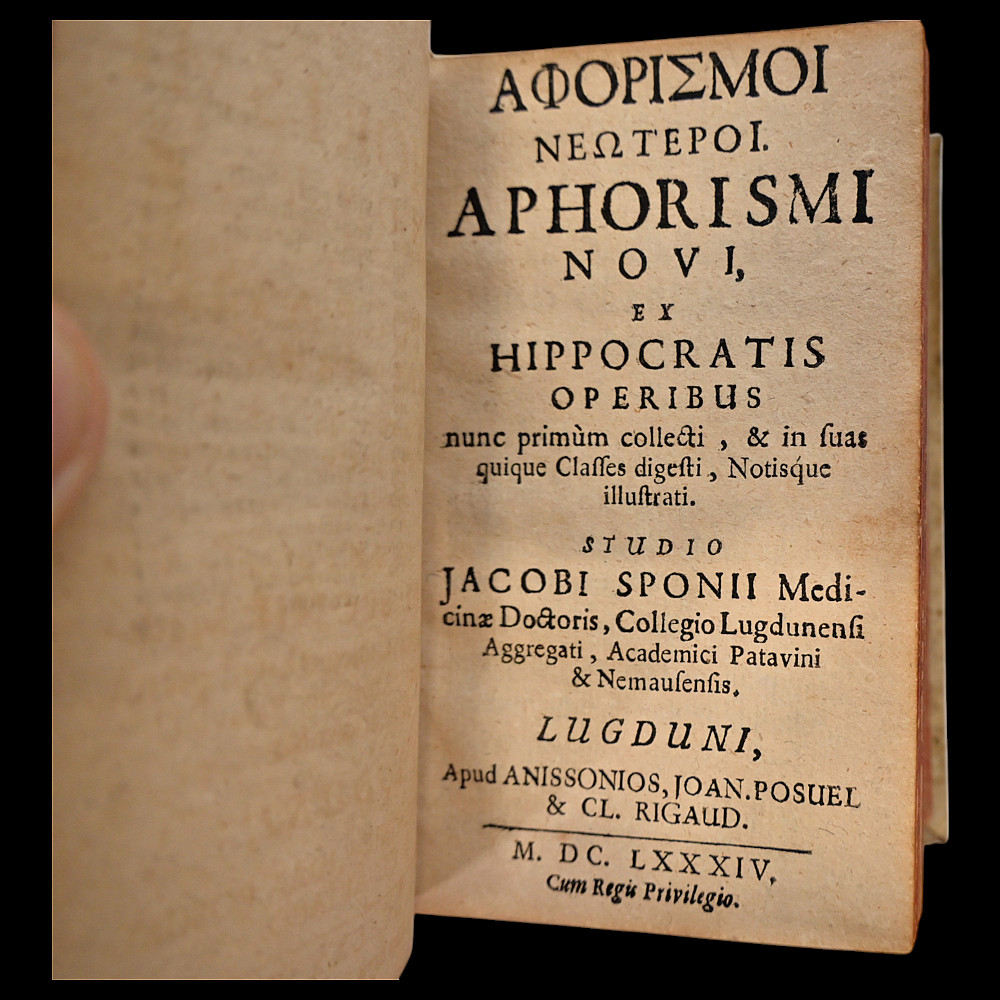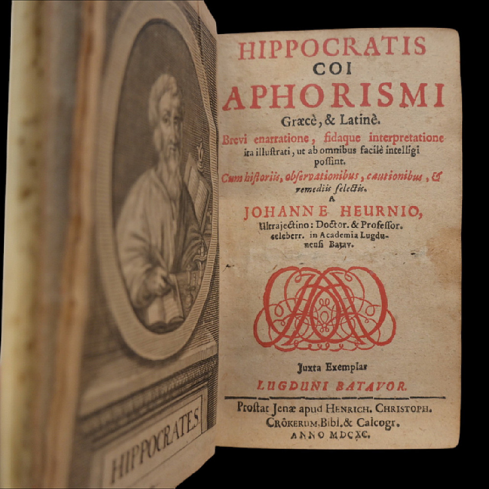 Rare book 1690 Hippocrates Coi Aphorismi – Greek & Latin – Vellum Bound Medical Classic, Lyon. This rare and important medical volume is a 1690 edition of Hippocrates Coi Aphorismi, printed in Lyon (Lugduni), presenting the aphorisms of Hippocrates in both Greek and Latin. The work is edited and annotated by the renowned physician and scholar Johannes Heurnius (Johanne Heurnio). Full vellum binding, spine with manuscript title. Text in Latin with some Greek. This is a historically significant volume for collectors of medical antiquities, early printed books, and Hippocratic texts. The work represents a critical link in the chain of classical medical knowledge transmission during the Renaissance and Enlightenment. Good condition. Size 14x10x6 cm.