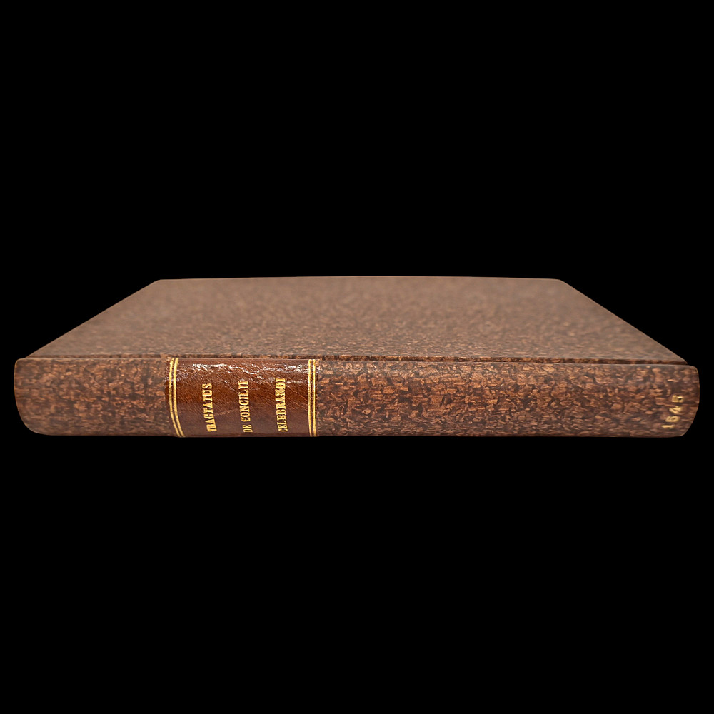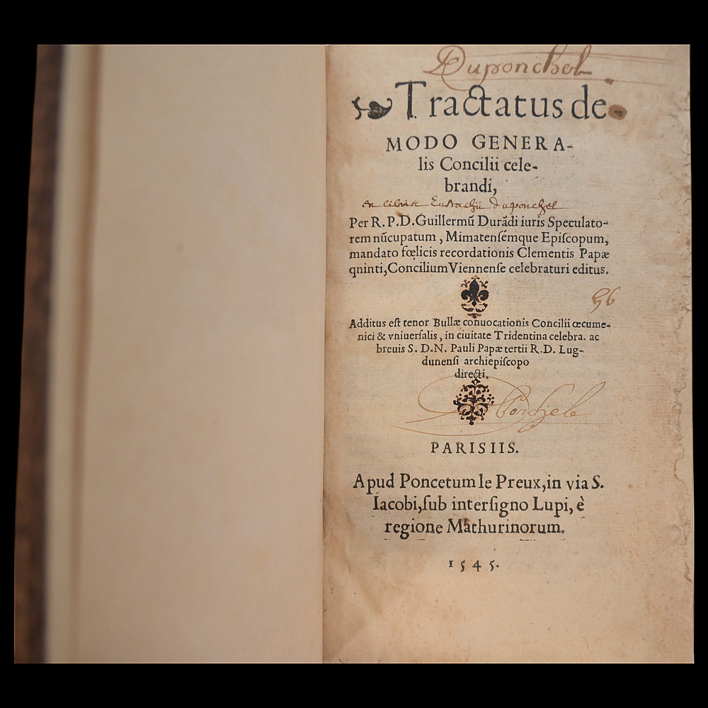 Rare book 16th Century, Treatise on Church Councils by Guillaume Durand, Paris, 1545. An important and influential theological and canonical work, originally composed in 1311 by Guillaume Durand the Younger (also known as William Durandus), this edition was printed in Paris in 1545 by Poncet Le Preux. It is the second edition of the work, the first having appeared in 1531. The Tractatus de modo generalis Concilii celebrandi (“Treatise on the General Manner of Celebrating a Council”) was written at the request of Pope Clement V as a fundamental guide to organizing ecumenical councils, particularly the Council of Vienne (1311–1312). This 1545 edition was reissued on the eve of the Council of Trent, and dedicated to Pope Paul III, as a significant contribution to ongoing ecclesiastical reform discussions. The treatise outlines the proper canonical procedures for convening and conducting church councils, drawing heavily on the authority of Church Fathers, historical precedent, and canon law. Durand's work includes not only procedural rules but also vehement critiques of clerical corruption and specific reform proposals—most notably the radical proposal that no pope should be allowed to create or alter laws without the approval of a general council, and that such councils should be held regularly every ten years. Pages: 243. Binding: Modern marbled boards with gilt-titled leather spine label; very good condition. Language: Latin. A rare and significant example of 16th-century Catholic theological literature, with high scholarly value for collectors of early printed books, ecclesiastical history, and canon law. Size 17x11x2cm.