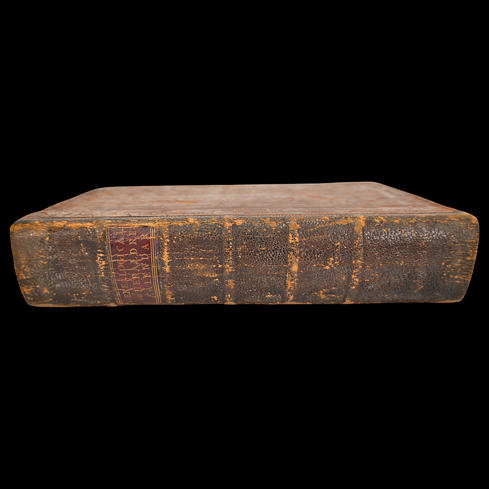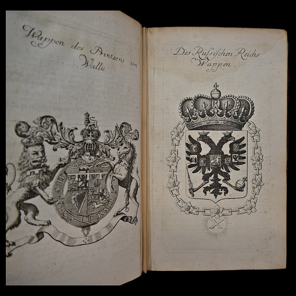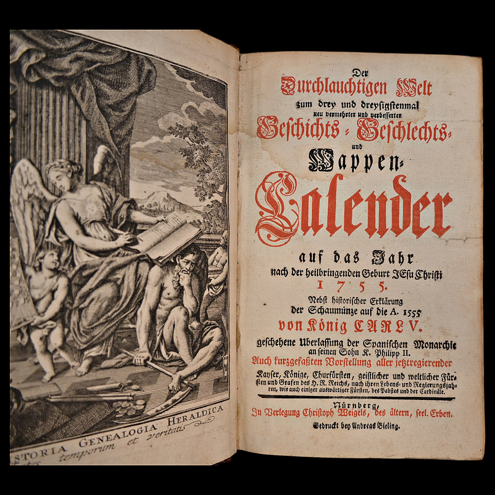 Rare book, 1754 – Coats of Arms of German Nobility – Fully Illustrated Heraldic Calendar, Bieling for Weigel, Nuremberg, 1754. Title: Wappen-Kalender auf das Jahr 1755, (enlarged and improved history, family and coat of arms calendar for the year.. 1755). Publisher: Bieling for Weigel, Nuremberg, 1754. Language: German. A rare and visually striking heraldic calendar featuring numerous full-page engravings of European noble family coats of arms. Produced as a genealogical and heraldic reference for the year 1755. Not collated. Original leather binding. Marbled edges. Spine with raised bands. Size 21x15x4 cm.