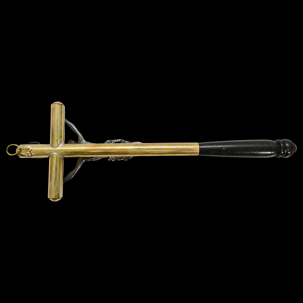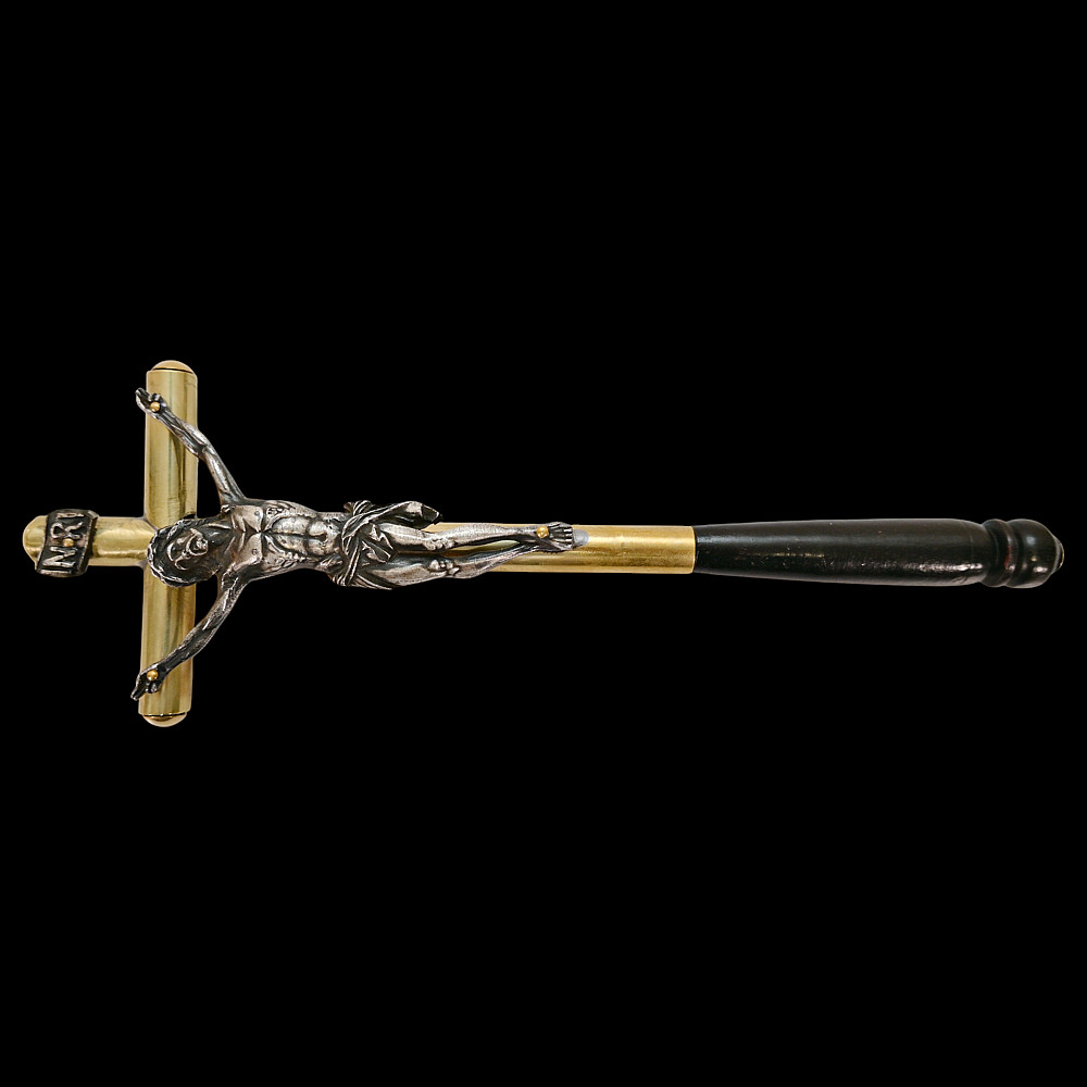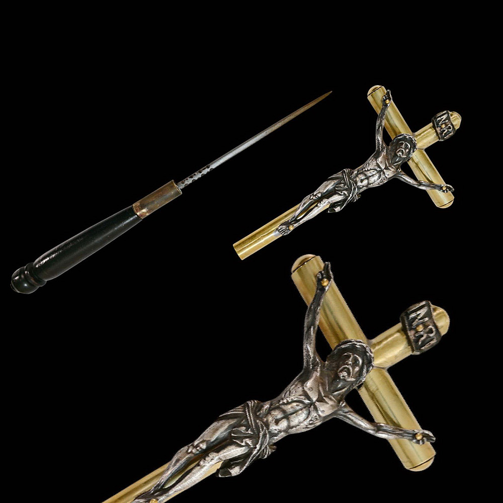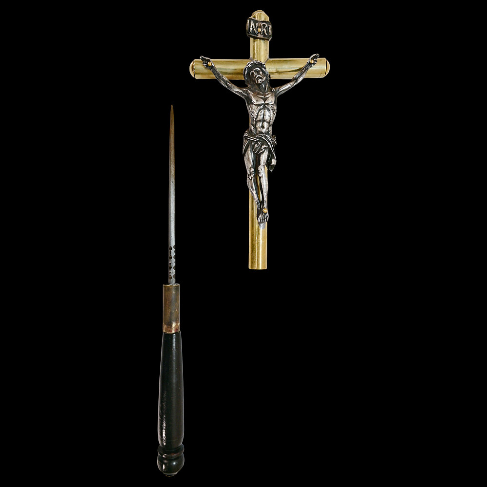 Rare Crucifix Stiletto of a Military Priest, Spain, late 19th century. An extraordinary devotional and defensive object - a concealed stiletto dagger ingeniously housed within a brass crucifix, attributed to a Spanish military chaplain of the late 19th century. The cross, crafted from brass tubing, bears a finely modeled silvered bronze corpus of Christ, rendered with striking anatomical realism. The vertical shaft of the cross is removable to reveal a slender faceted stiletto blade, designed for personal protection. These rare hybrid devotional weapons, known as “crucifix stilettos”, were occasionally carried by military priests and missionaries, particularly in frontier or colonial contexts where spiritual and physical dangers coexisted. A fascinating and rare artifact, merging sacred symbolism with practical ingenuity - a poignant relic of the turbulent interplay between faith and survival in the post-Napoleonic and colonial era. Good condition. Length (overall): approx. 28 cm. Blade length: approx. 12 cm.