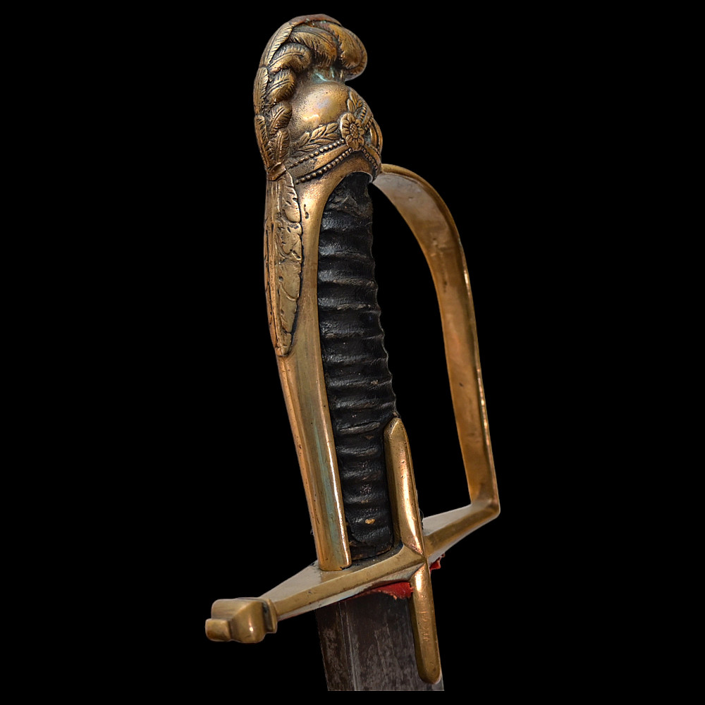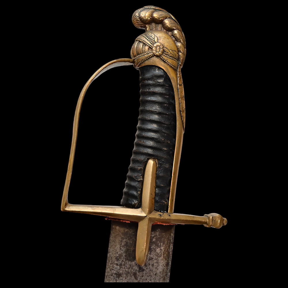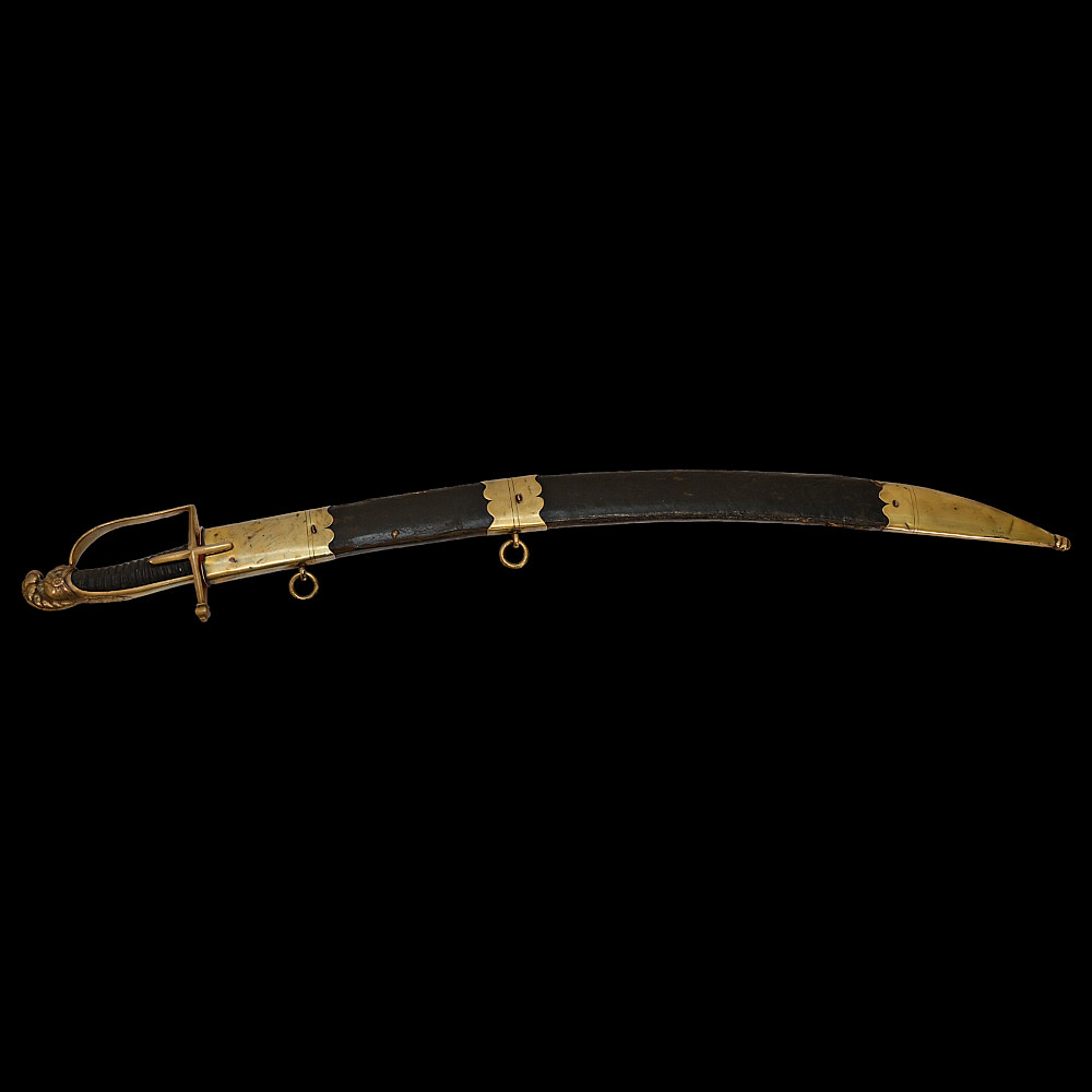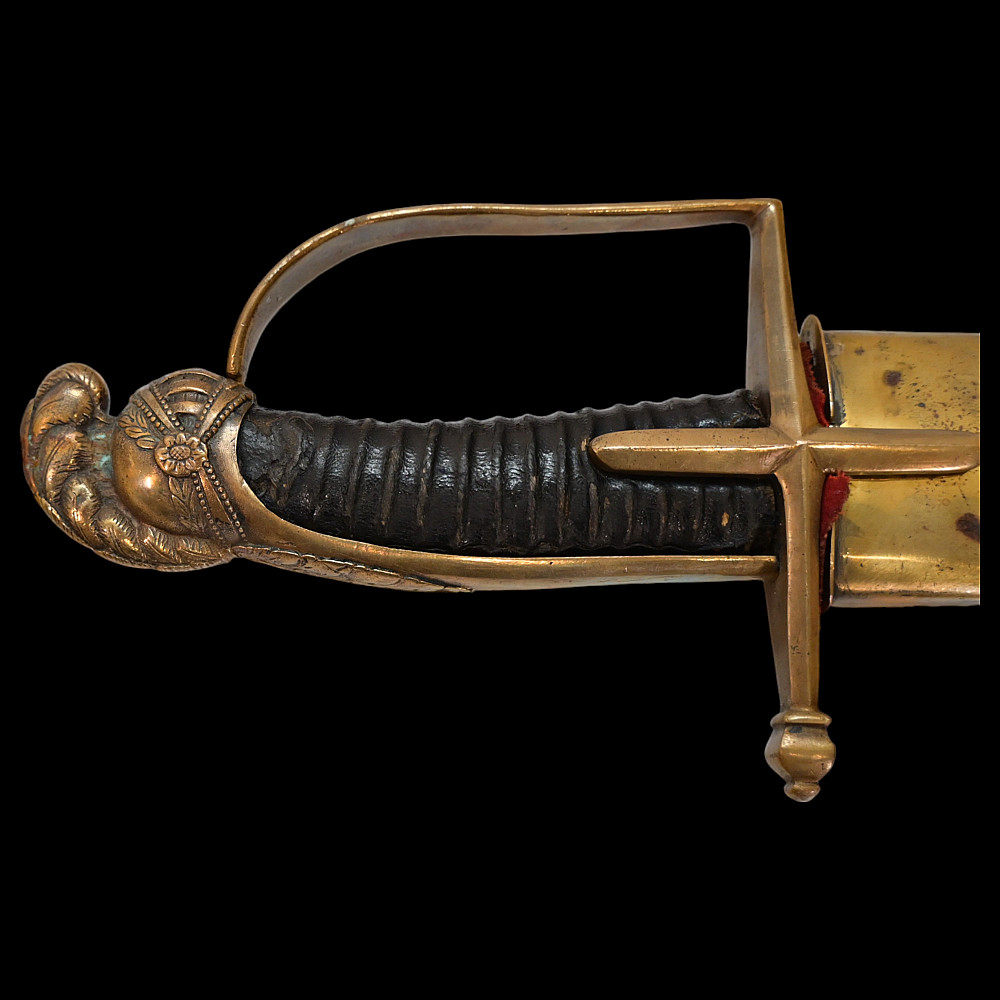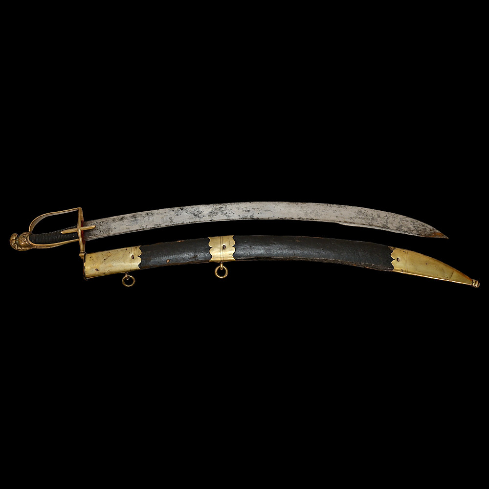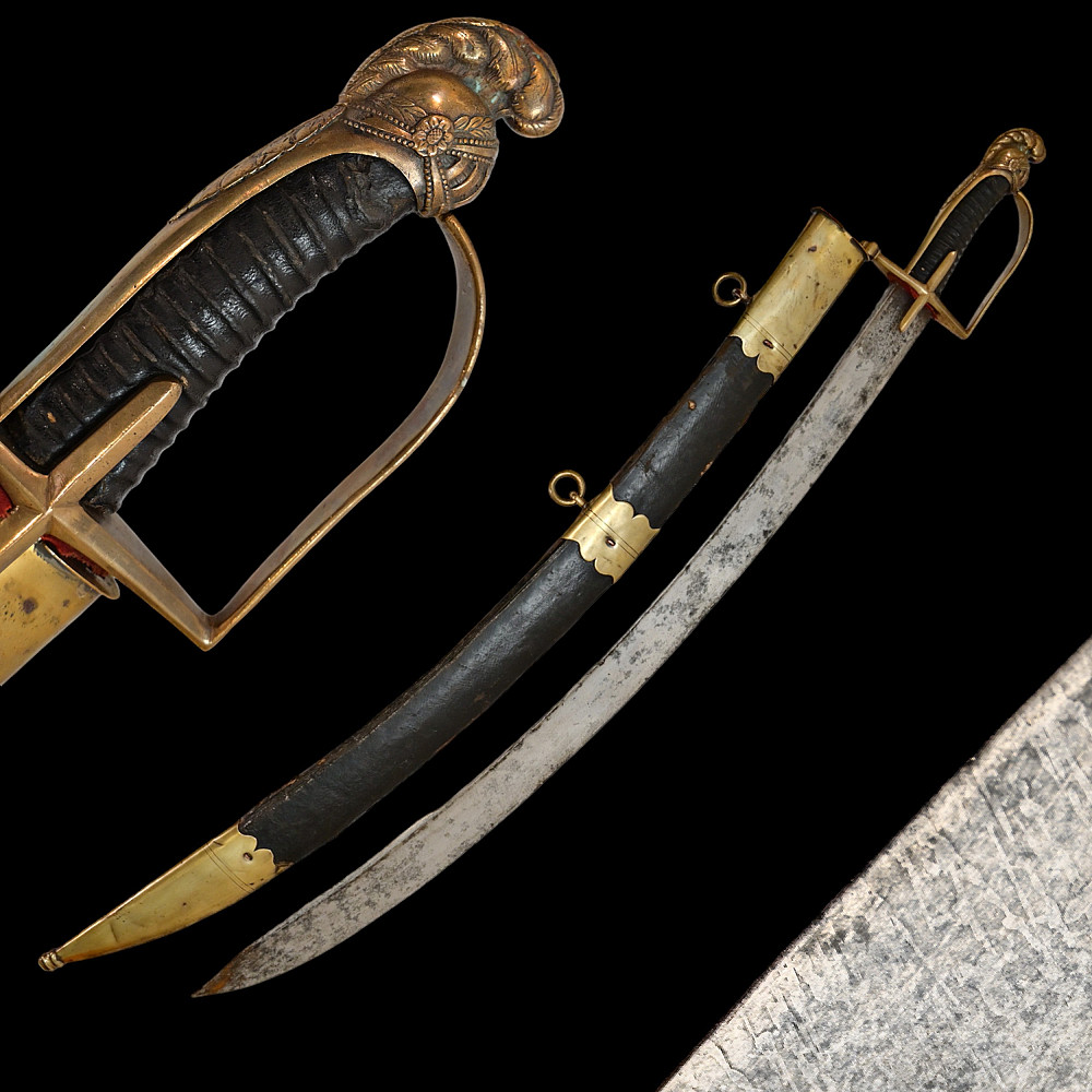 Rare French General's Saber, Louis XVI period, second half of 18th century. A very beautiful, massive steel blade, decorated with etched decor that imitates the patterns of Damascus steel. High-quality bronze hilt with a knight's helmet on the pommel. Wooden handle covered with leather. Wooden scabbard covered with leather with brass fittings. A very beautiful Napoleonic era collectible. Length 97 cm.