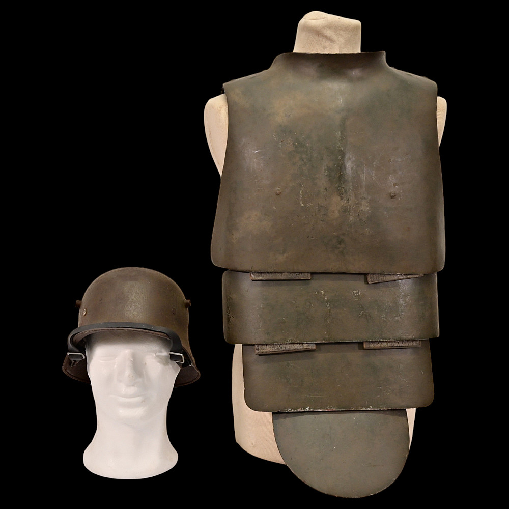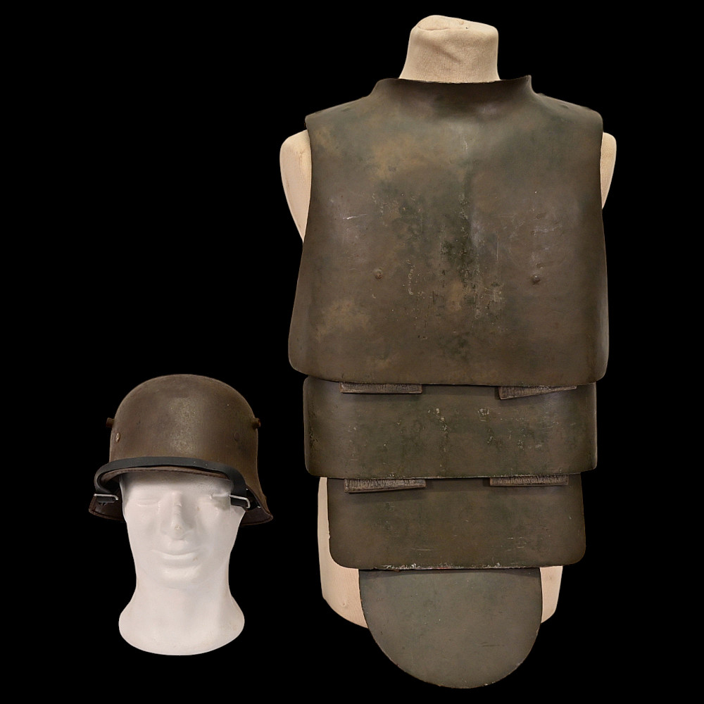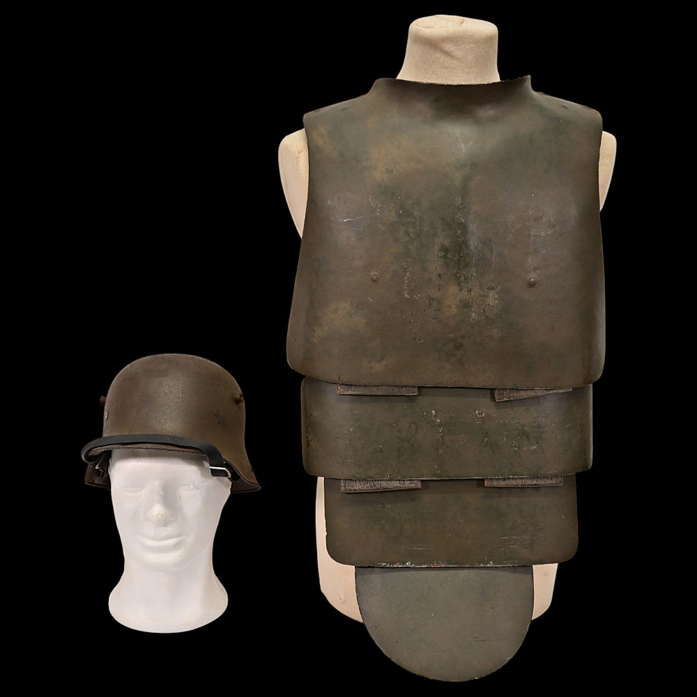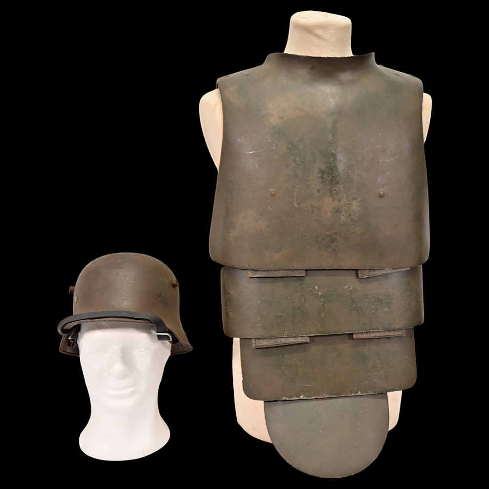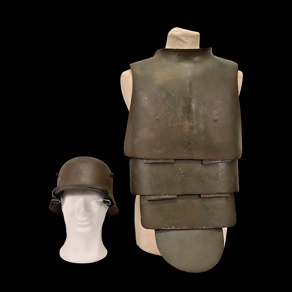 Rare German WWI Trench Armor Set (Sappenpanzer and Stahlhelm M1916), ca 1916 – 1918. A rare and complete example of the Sappenpanzer steel body armor issued to German stormtroopers (Sturmtruppen) and sentries during the latter years of the First World War, accompanied by an original Stahlhelm Model 1916 combat helmet. The armor consists of four articulated plates designed to cover the torso and lower abdomen, constructed from thick steel and retaining traces of the original field-gray paint. The overlapping plates are connected by internal leather straps, allowing limited flexibility while providing protection from shrapnel and small arms fire at long range. Some surface oxidation. The accompanying M1916 helmet retains its original paint finish and early pattern steel liner band with worn leather liner. The Sappenpanzer was introduced around 1916 for troops exposed to heavy fire in forward positions - snipers, machine-gunners, and sentries. Combined with the Stahlhelm, it represented one of the earliest systematic uses of body armor in modern warfare. Although effective against shrapnel and low-velocity rounds, its weight (around 9 - 12 kg) limited mobility, restricting its use primarily to static trench duty. Armor height: approx. 74 cm. Helmet: standard M16. Condition: Good, unrestored condition with original finish.