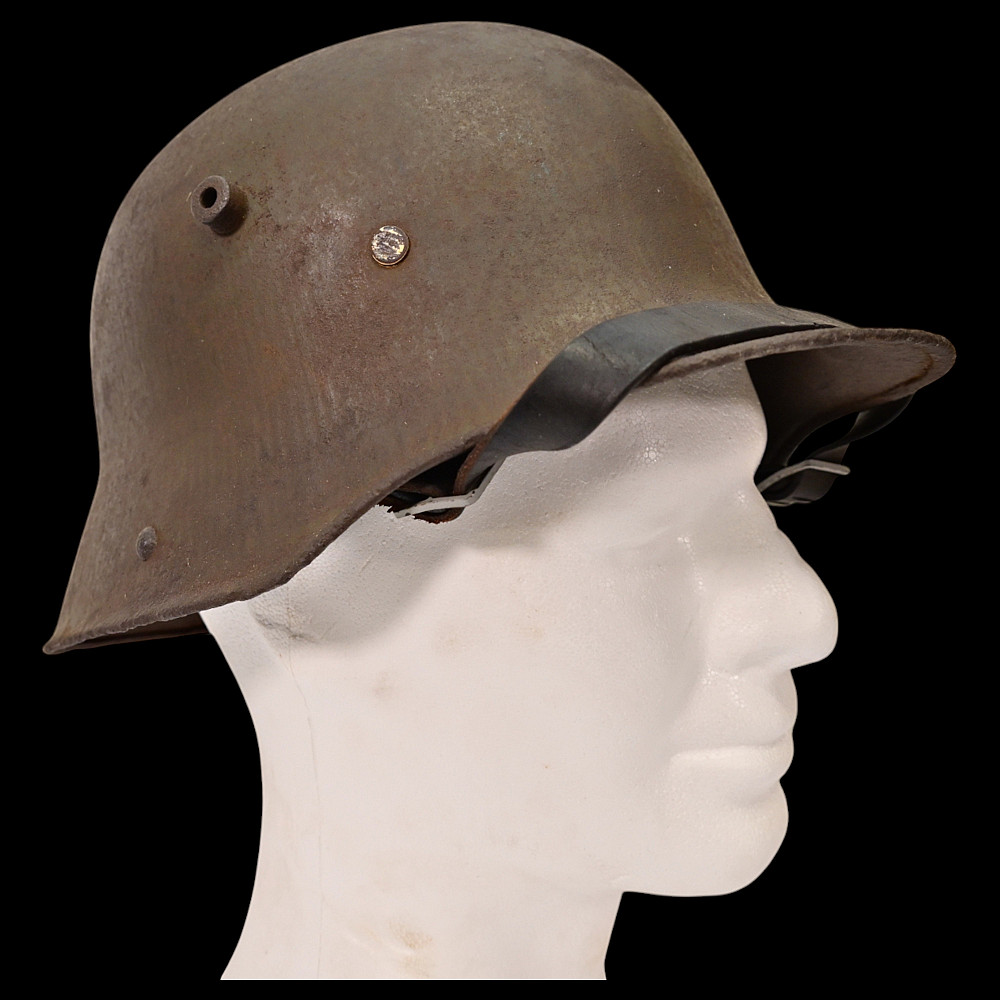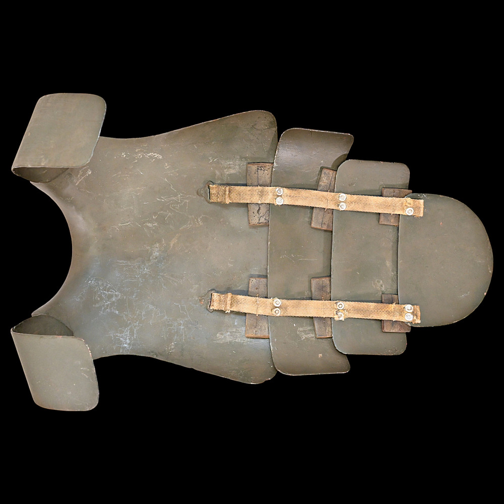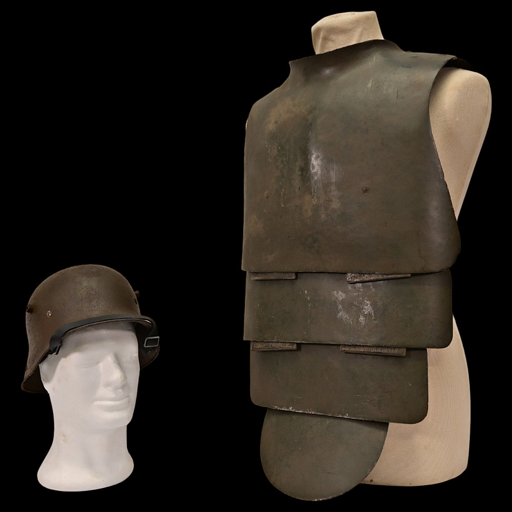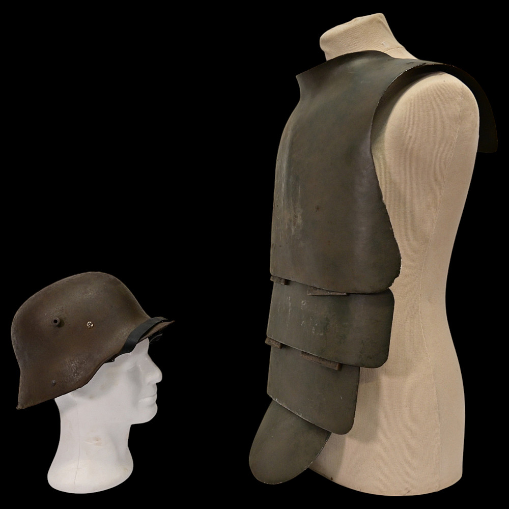 Rare German WWI Trench Armor Set (Sappenpanzer and Stahlhelm M1916), ca 1916 – 1918. A rare and complete example of the Sappenpanzer steel body armor issued to German stormtroopers (Sturmtruppen) and sentries during the latter years of the First World War, accompanied by an original Stahlhelm Model 1916 combat helmet. The armor consists of four articulated plates designed to cover the torso and lower abdomen, constructed from thick steel and retaining traces of the original field-gray paint. The overlapping plates are connected by internal leather straps, allowing limited flexibility while providing protection from shrapnel and small arms fire at long range. Some surface oxidation. The accompanying M1916 helmet retains its original paint finish and early pattern steel liner band with worn leather liner. The Sappenpanzer was introduced around 1916 for troops exposed to heavy fire in forward positions - snipers, machine-gunners, and sentries. Combined with the Stahlhelm, it represented one of the earliest systematic uses of body armor in modern warfare. Although effective against shrapnel and low-velocity rounds, its weight (around 9 - 12 kg) limited mobility, restricting its use primarily to static trench duty. Armor height: approx. 74 cm. Helmet: standard M16. Condition: Good, unrestored condition with original finish.