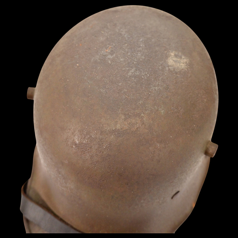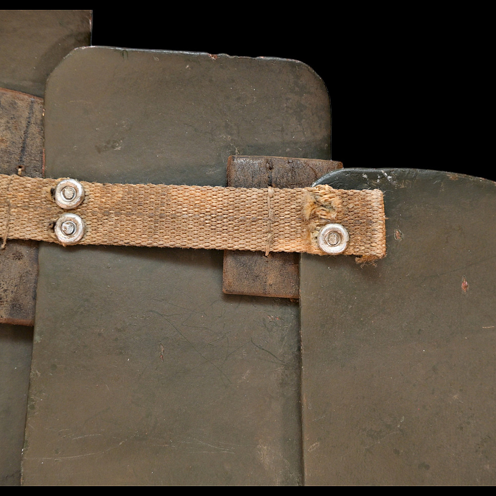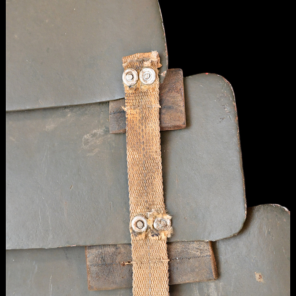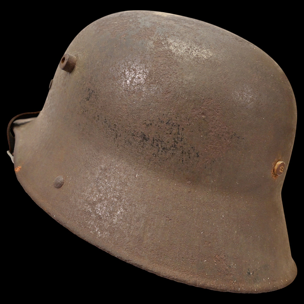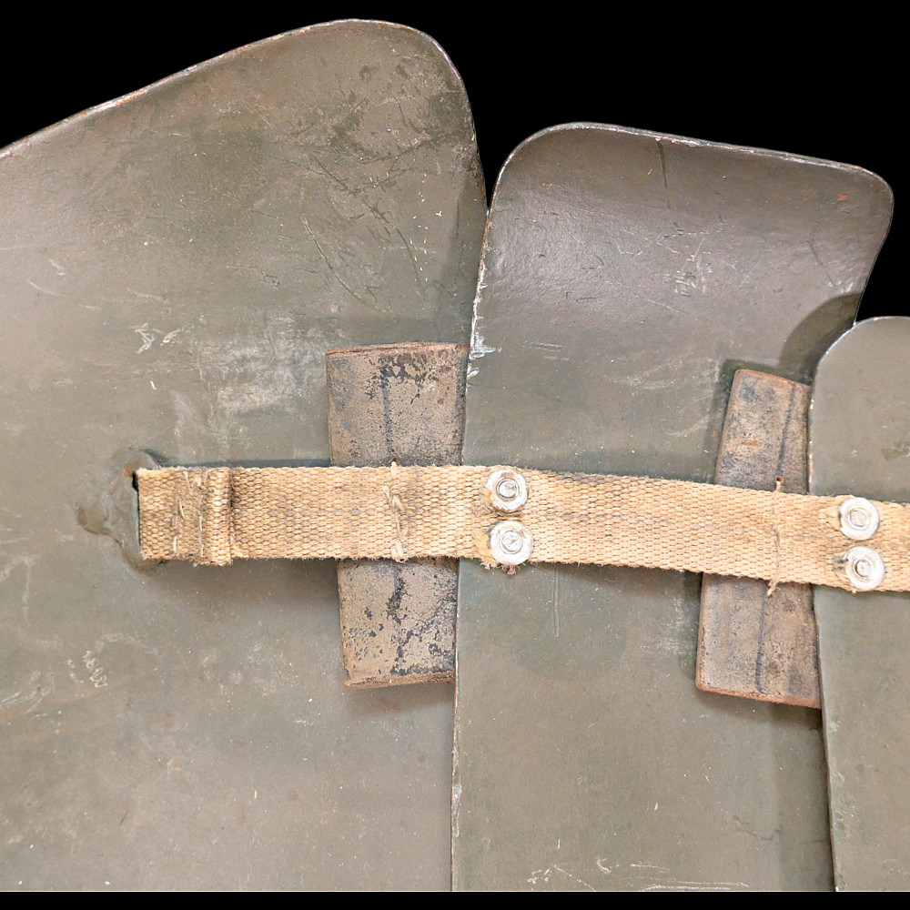Rare German WWI Trench Armor Set (Sappenpanzer and Stahlhelm M1916), ca 1916 – 1918. A rare and complete example of the Sappenpanzer steel body armor issued to German stormtroopers (Sturmtruppen) and sentries during the latter years of the First World War, accompanied by an original Stahlhelm Model 1916 combat helmet. The armor consists of four articulated plates designed to cover the torso and lower abdomen, constructed from thick steel and retaining traces of the original field-gray paint. The overlapping plates are connected by internal leather straps, allowing limited flexibility while providing protection from shrapnel and small arms fire at long range. Some surface oxidation. The accompanying M1916 helmet retains its original paint finish and early pattern steel liner band with worn leather liner. The Sappenpanzer was introduced around 1916 for troops exposed to heavy fire in forward positions - snipers, machine-gunners, and sentries. Combined with the Stahlhelm, it represented one of the earliest systematic uses of body armor in modern warfare. Although effective against shrapnel and low-velocity rounds, its weight (around 9 - 12 kg) limited mobility, restricting its use primarily to static trench duty. Armor height: approx. 74 cm. Helmet: standard M16. Condition: Good, unrestored condition with original finish.