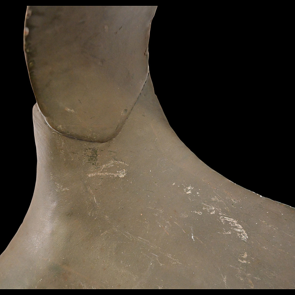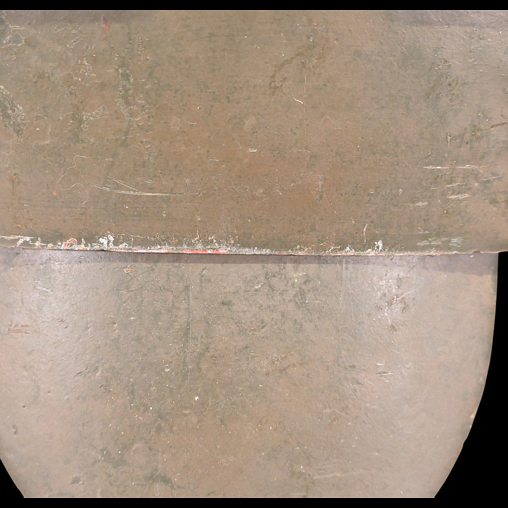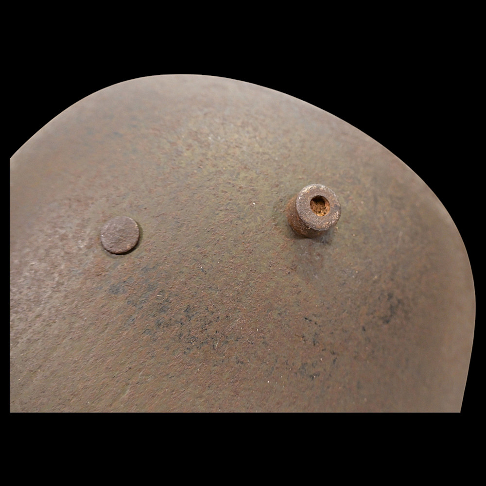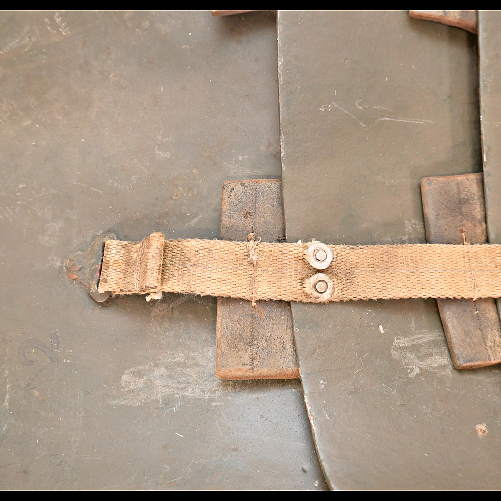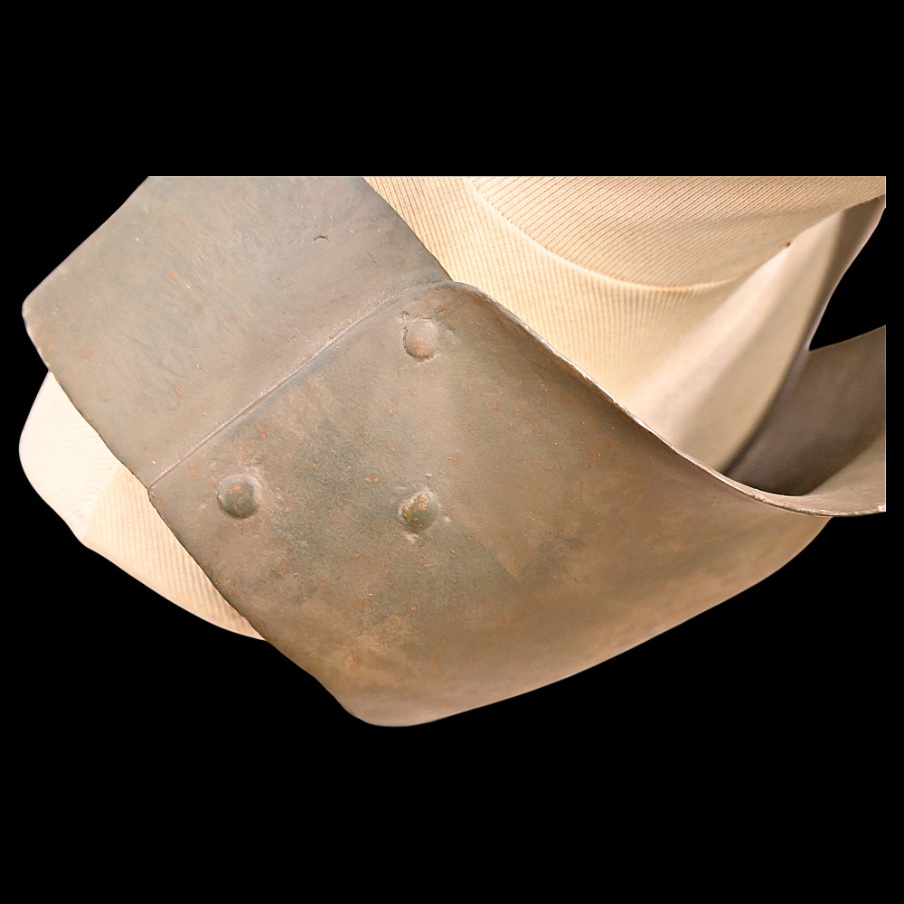 Rare German WWI Trench Armor Set (Sappenpanzer and Stahlhelm M1916), ca 1916 – 1918. A rare and complete example of the Sappenpanzer steel body armor issued to German stormtroopers (Sturmtruppen) and sentries during the latter years of the First World War, accompanied by an original Stahlhelm Model 1916 combat helmet. The armor consists of four articulated plates designed to cover the torso and lower abdomen, constructed from thick steel and retaining traces of the original field-gray paint. The overlapping plates are connected by internal leather straps, allowing limited flexibility while providing protection from shrapnel and small arms fire at long range. Some surface oxidation. The accompanying M1916 helmet retains its original paint finish and early pattern steel liner band with worn leather liner. The Sappenpanzer was introduced around 1916 for troops exposed to heavy fire in forward positions - snipers, machine-gunners, and sentries. Combined with the Stahlhelm, it represented one of the earliest systematic uses of body armor in modern warfare. Although effective against shrapnel and low-velocity rounds, its weight (around 9 - 12 kg) limited mobility, restricting its use primarily to static trench duty. Armor height: approx. 74 cm. Helmet: standard M16. Condition: Good, unrestored condition with original finish.