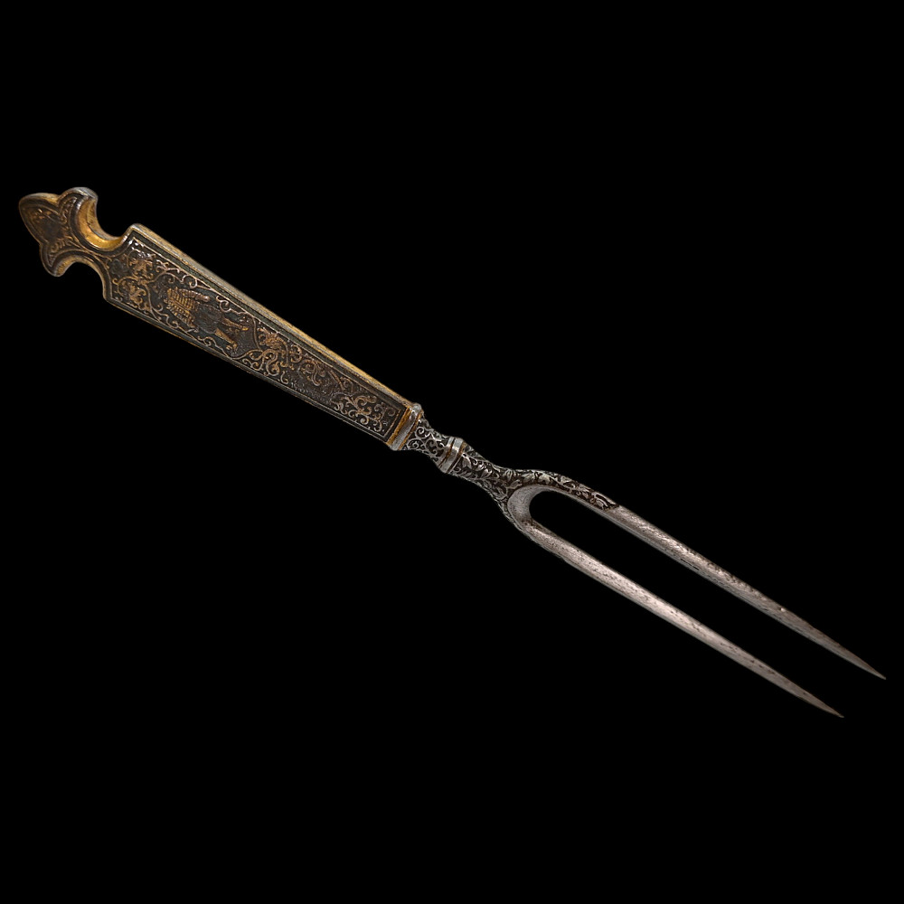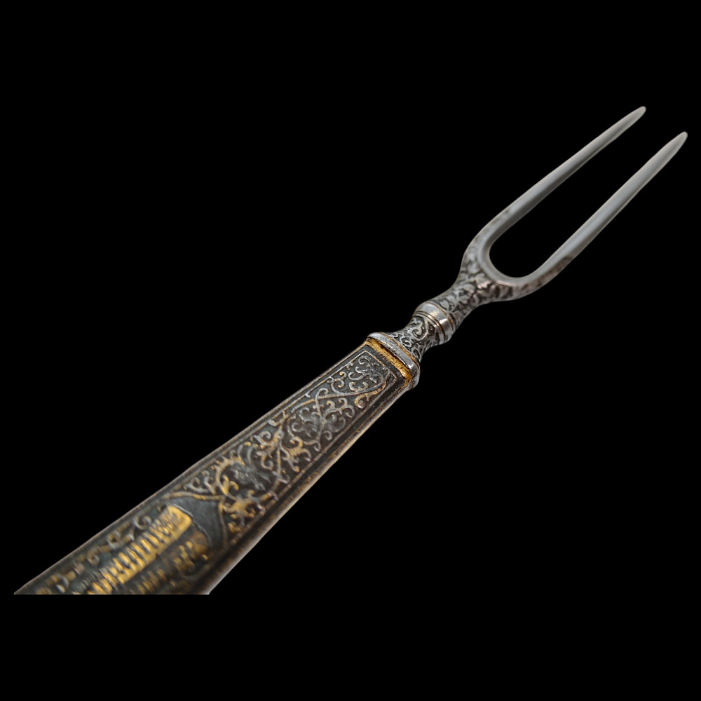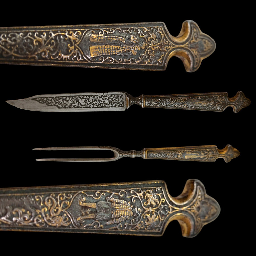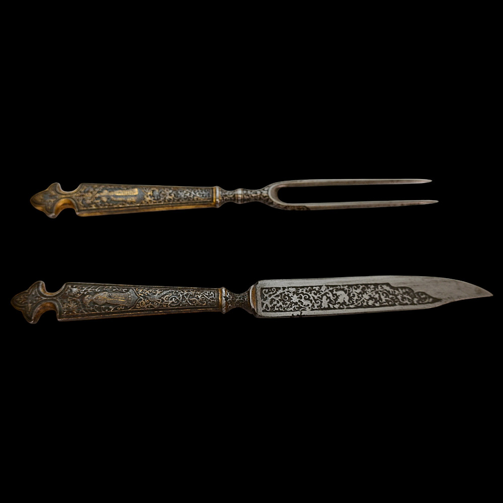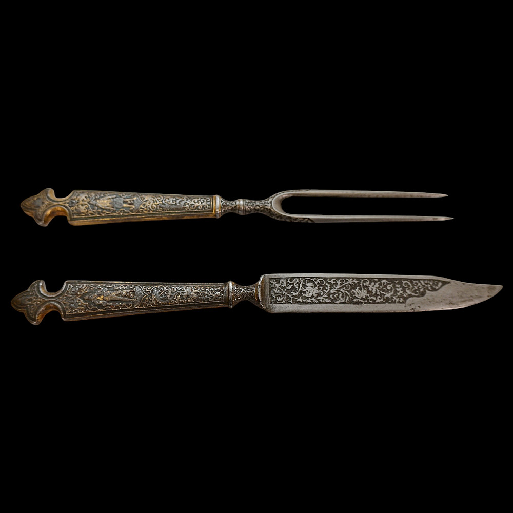 Rare, high quality, cutlery set, knife and fork, engraving, gilding, France, 17th century. Exquisite iron knife handles are very richly decorated with engraving and gilding, figures of a man and a woman surrounded by a plant ornament. The steel blade of the knife is also decorated with a very beautiful plant ornament. A wonderful set belonged to a person from the upper class. A wonderful collectible artifact in good condition. Length 19 cm.