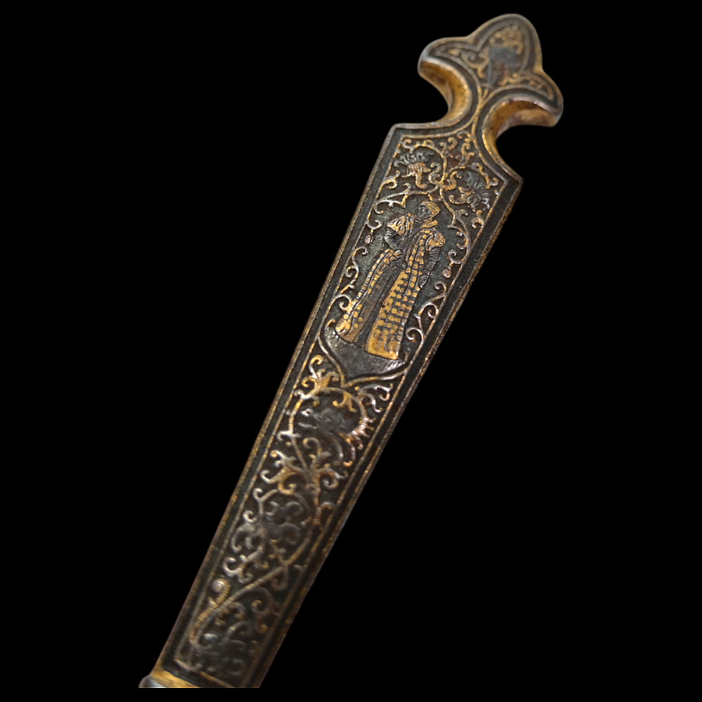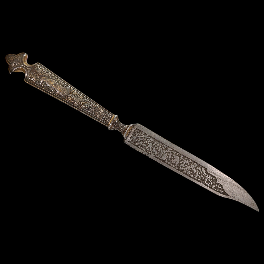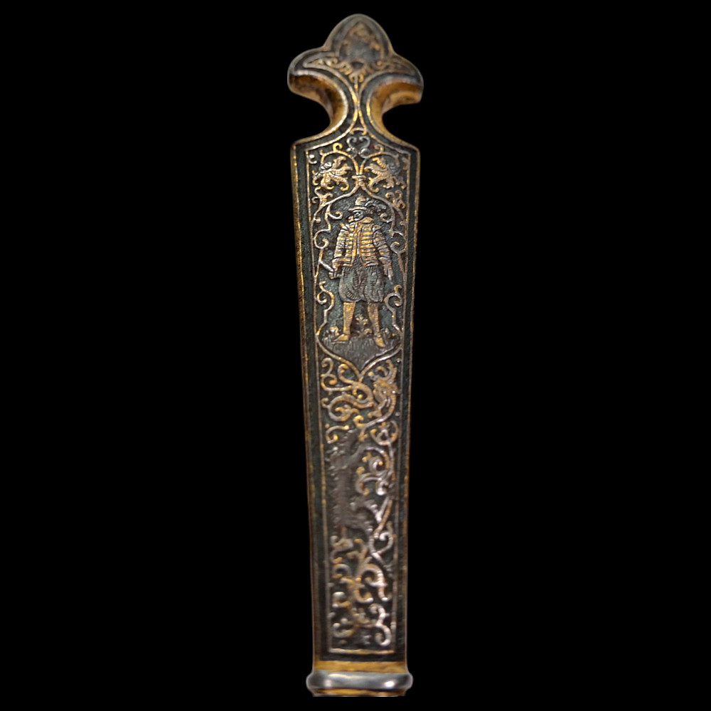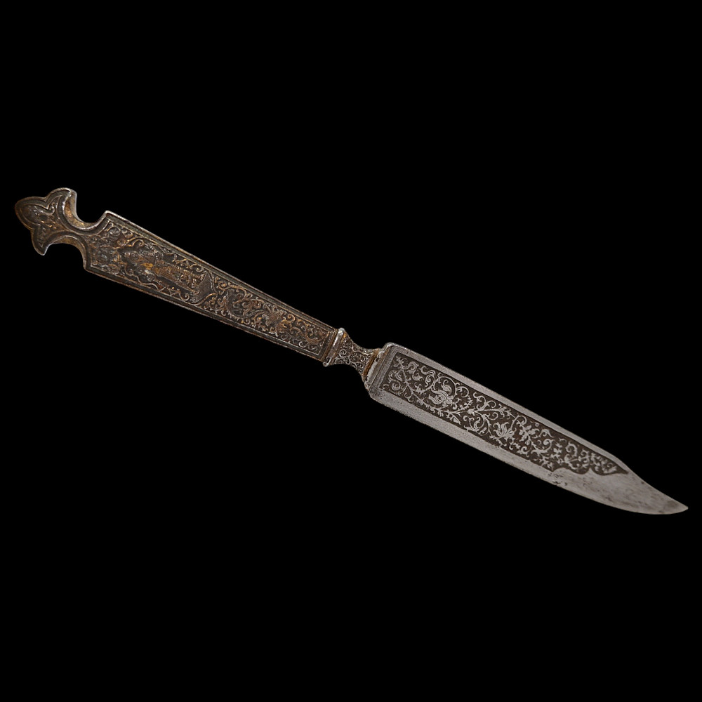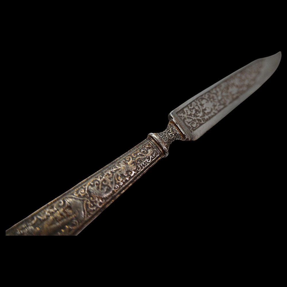 Rare, high quality, cutlery set, knife and fork, engraving, gilding, France, 17th century. Exquisite iron knife handles are very richly decorated with engraving and gilding, figures of a man and a woman surrounded by a plant ornament. The steel blade of the knife is also decorated with a very beautiful plant ornament. A wonderful set belonged to a person from the upper class. A wonderful collectible artifact in good condition. Length 19 cm.