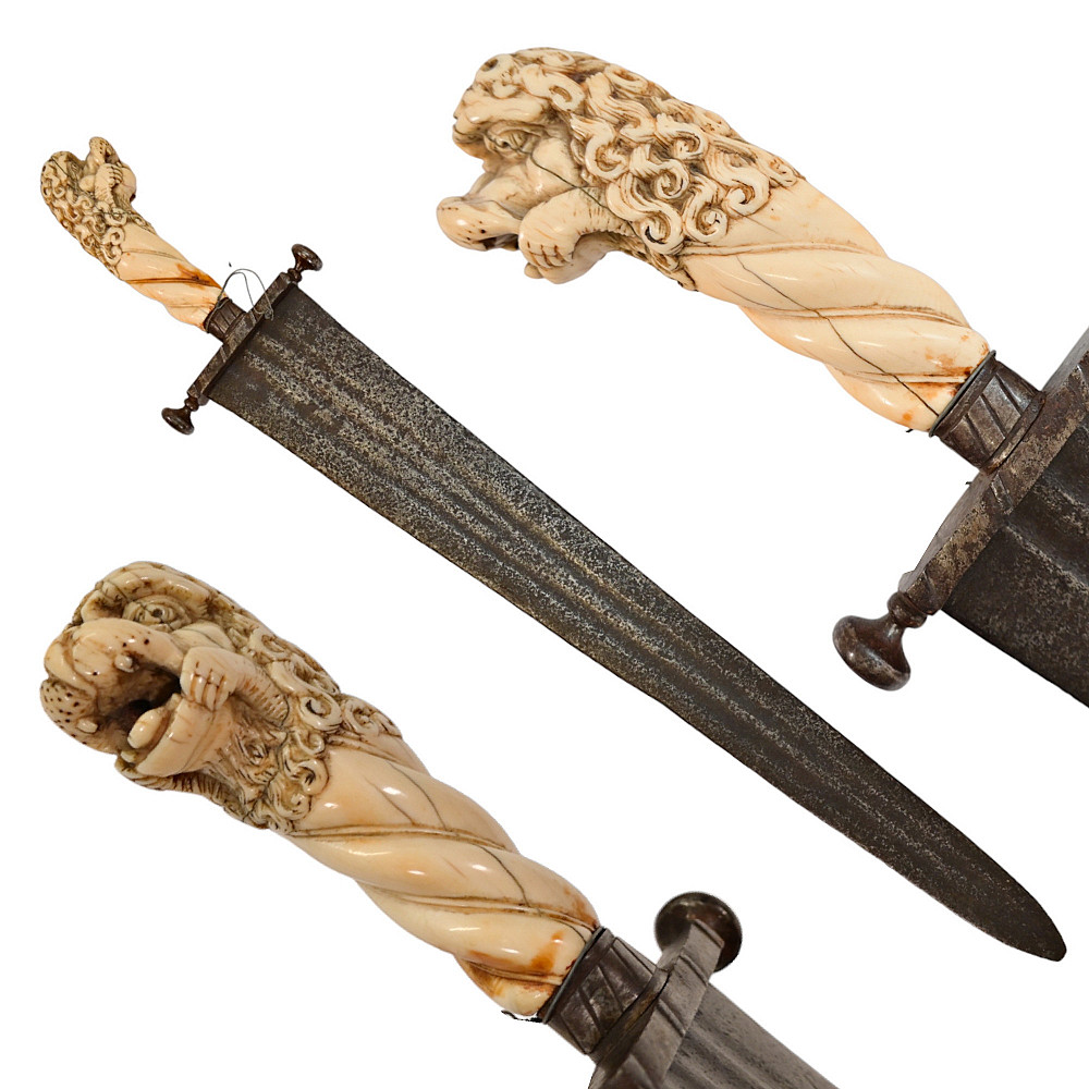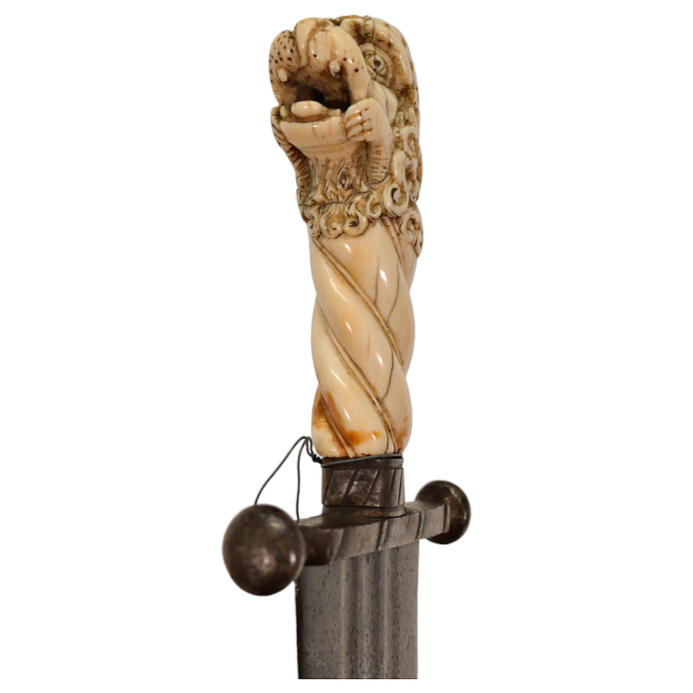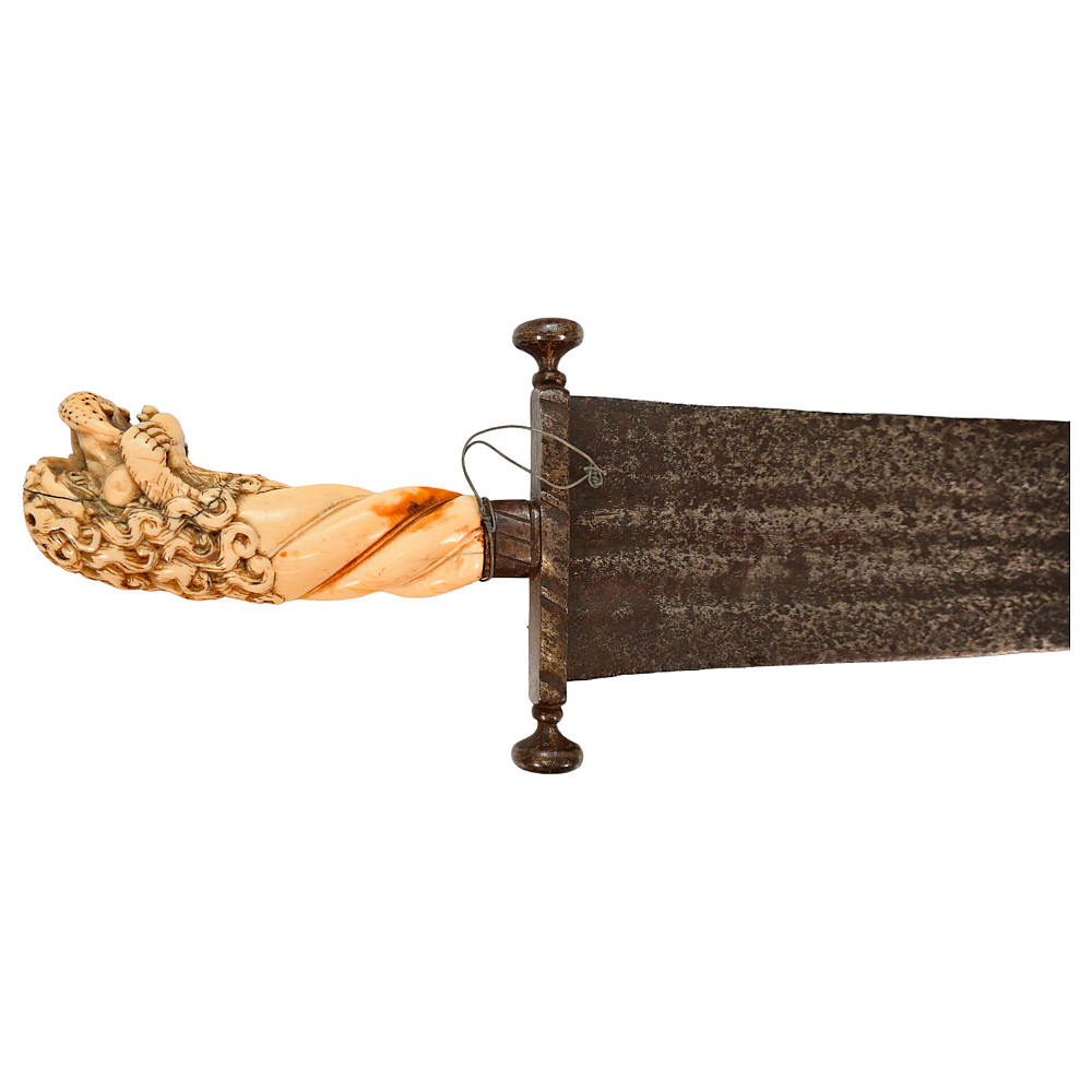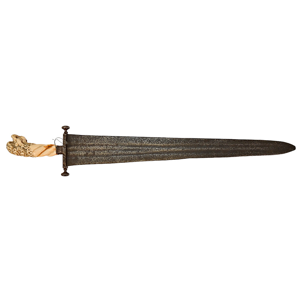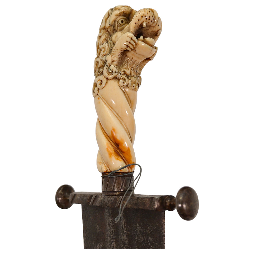 Rare Cinquedea type Sword, 16-17th Century, Italy. Wide, double-edged blade with three fullers on each side. The iron guard is skillfully made. Fine bone pommel carved in the shape of a lion's head. Rare and exquisite collectible.