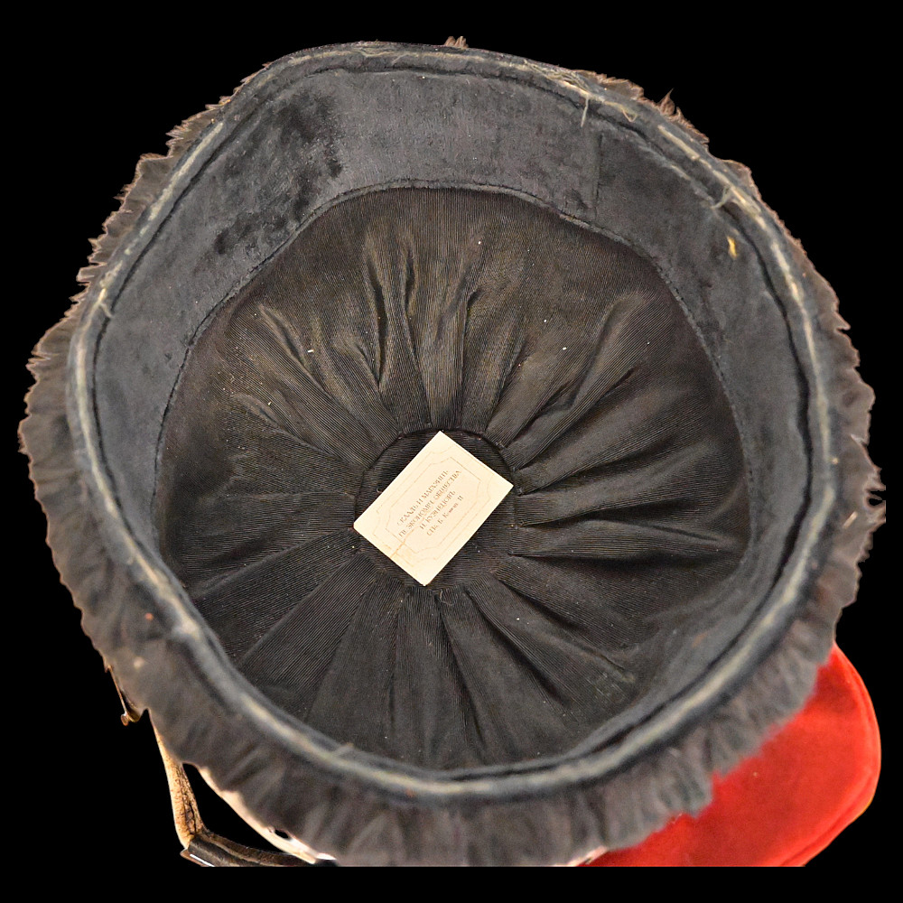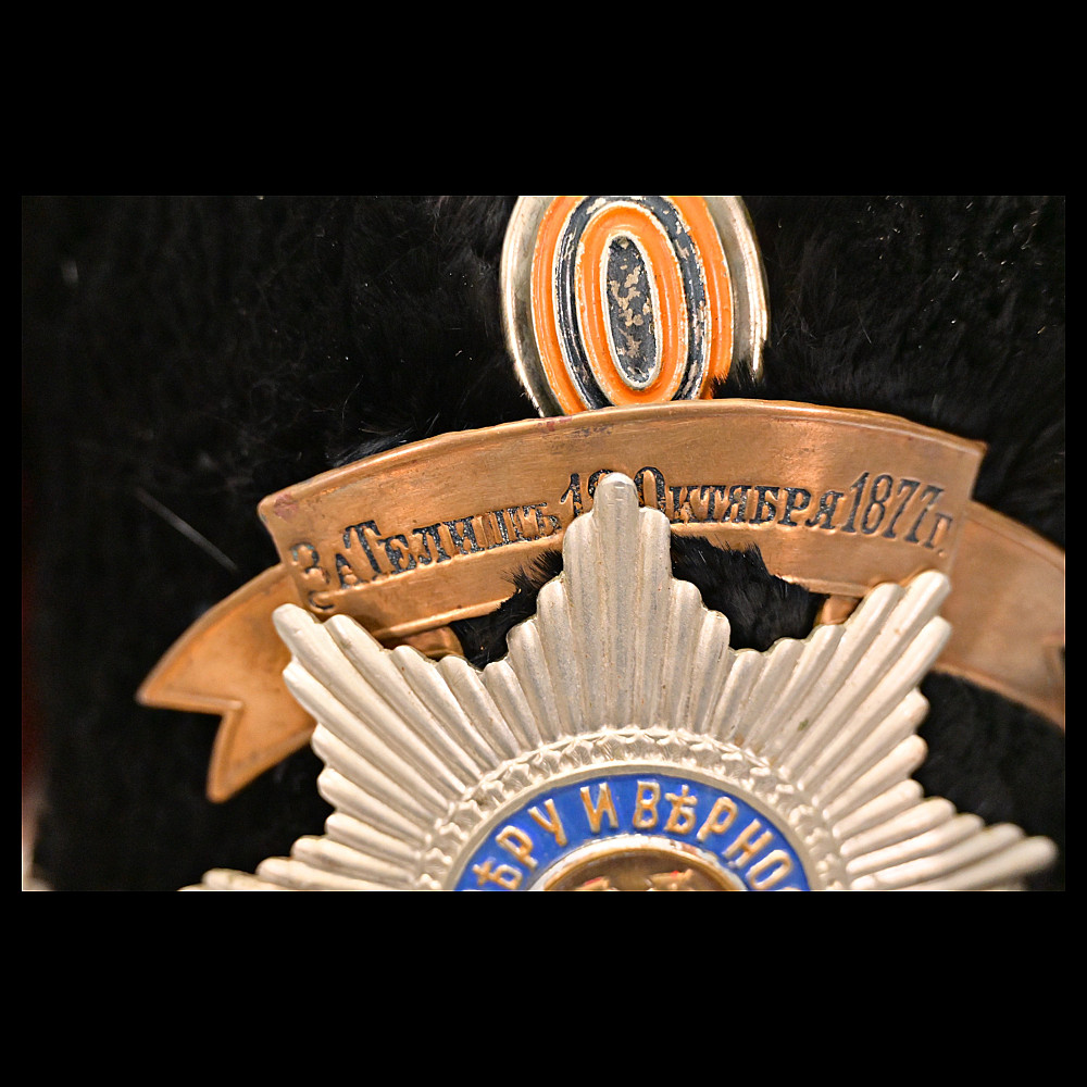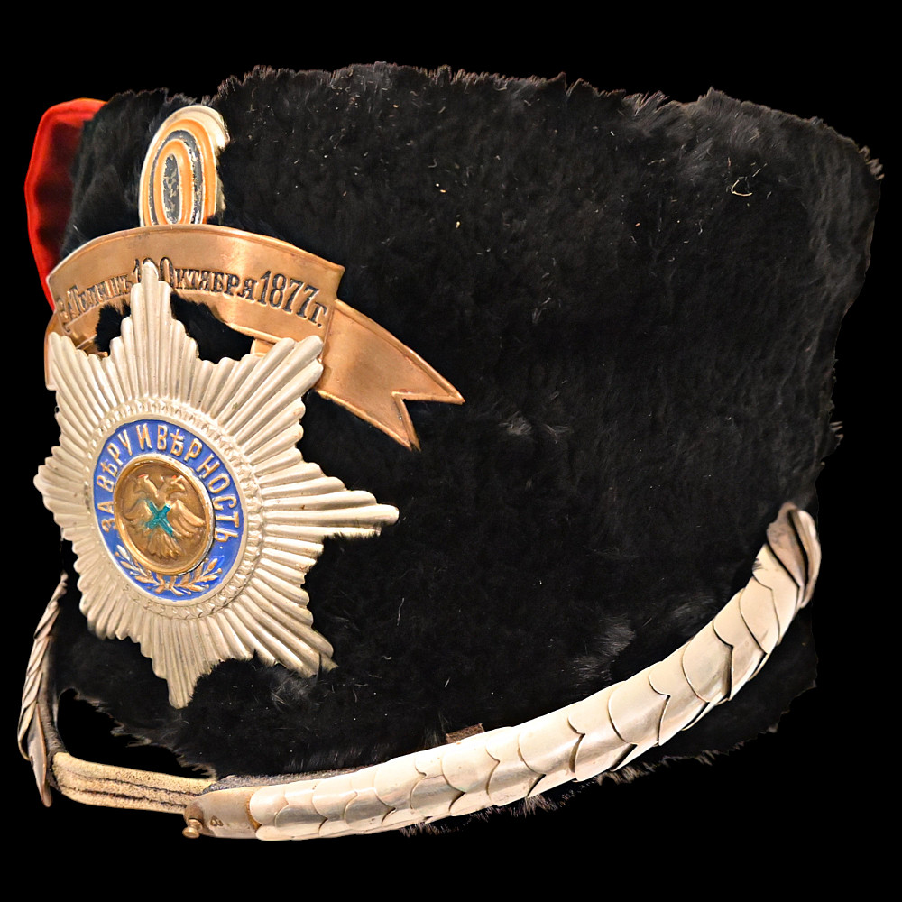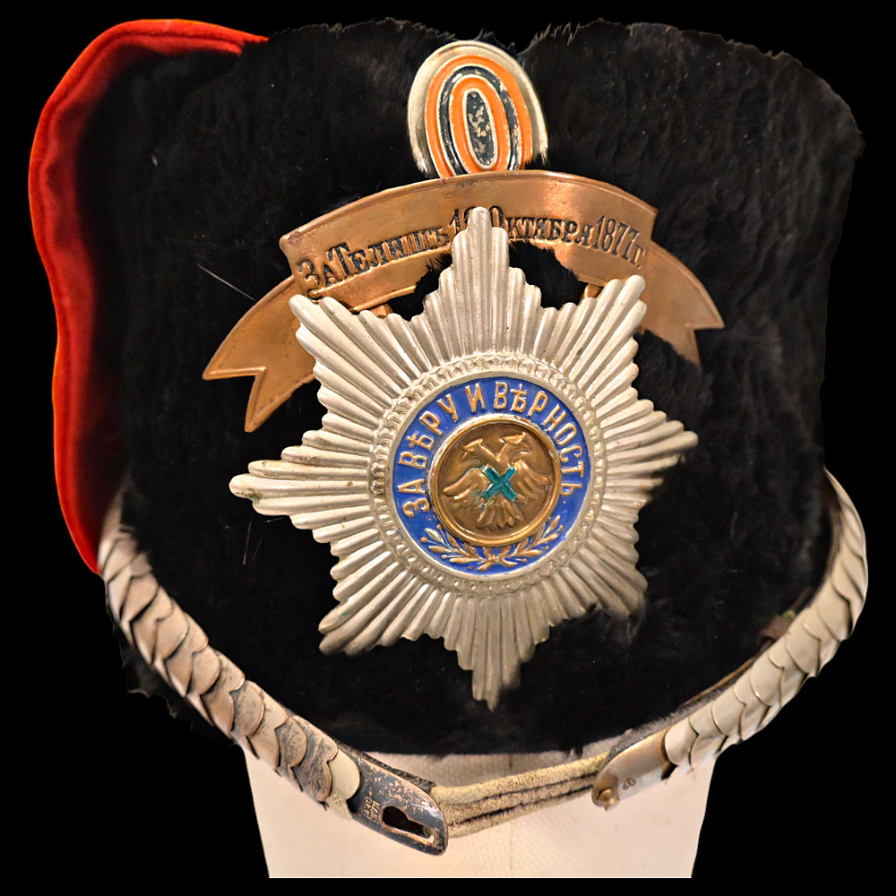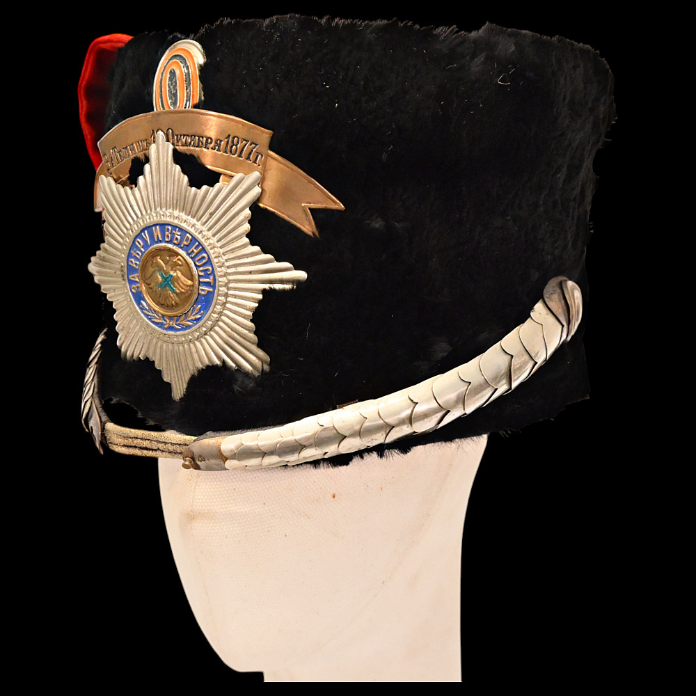 Rare Hussar cap, model 1909, Russian Empire. This magnificent Hussar cap is a prime example of late Imperial Russian military regalia. The tall cylindrical busby is covered in fine black karakul fur and crowned with a large silvered and enameled star of the Order of St. Andrew. The blue enamel reads "For Faith and Loyalty". Above it, a bronze banner bears the inscription: “For Telish on October 12, 1877”—a reference to the regiment’s bravery during the Russo-Turkish War. A top the badge is the regimental cockade. The lower edge features a luxurious chin strap made of overlapping silvered metal scales, retaining the original fastening hardware with manufacturer's marks. The interior is lined with black fabric and carries the rare original retailer’s label: "Warehouse and store GV. Economic Society N. Kuznetsov, St. Petersburg. B. Konyush. 11", indicating manufacture or sale through a prominent St. Petersburg outfitter. A fine collectible from the Russian Empire in excellent condition. Height cm.