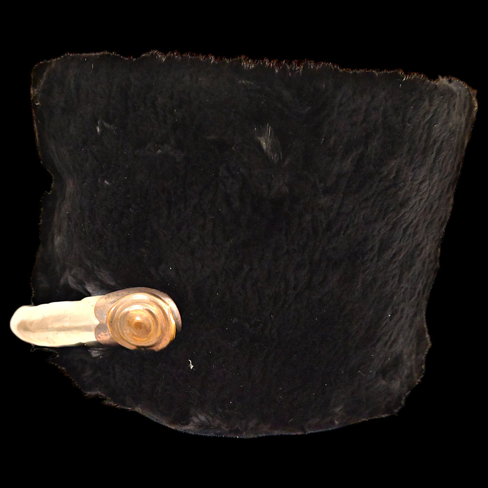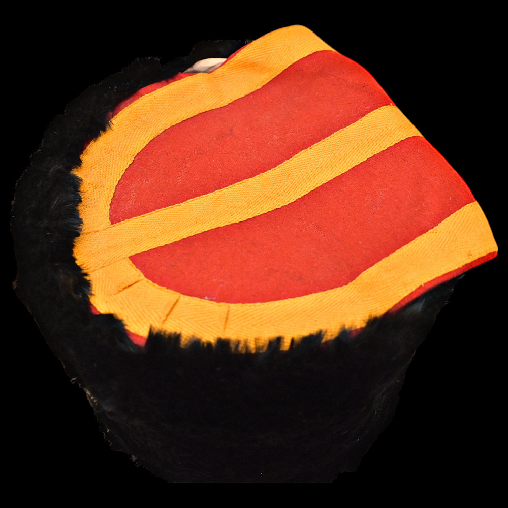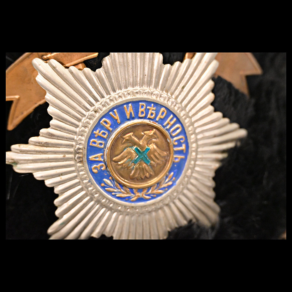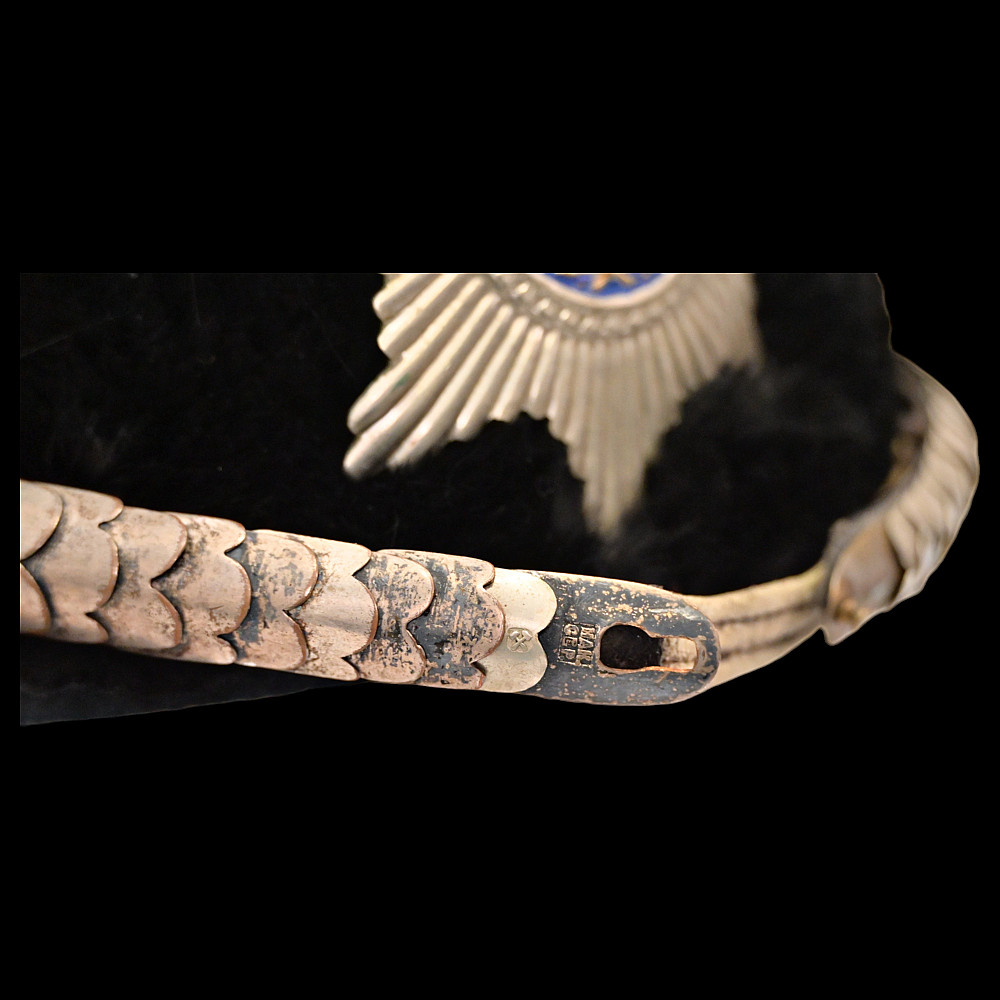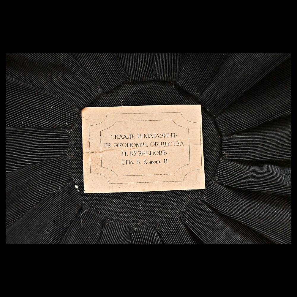 Rare Hussar cap, model 1909, Russian Empire. This magnificent Hussar cap is a prime example of late Imperial Russian military regalia. The tall cylindrical busby is covered in fine black karakul fur and crowned with a large silvered and enameled star of the Order of St. Andrew. The blue enamel reads "For Faith and Loyalty". Above it, a bronze banner bears the inscription: “For Telish on October 12, 1877”—a reference to the regiment’s bravery during the Russo-Turkish War. A top the badge is the regimental cockade. The lower edge features a luxurious chin strap made of overlapping silvered metal scales, retaining the original fastening hardware with manufacturer's marks. The interior is lined with black fabric and carries the rare original retailer’s label: "Warehouse and store GV. Economic Society N. Kuznetsov, St. Petersburg. B. Konyush. 11", indicating manufacture or sale through a prominent St. Petersburg outfitter. A fine collectible from the Russian Empire in excellent condition. Height cm.