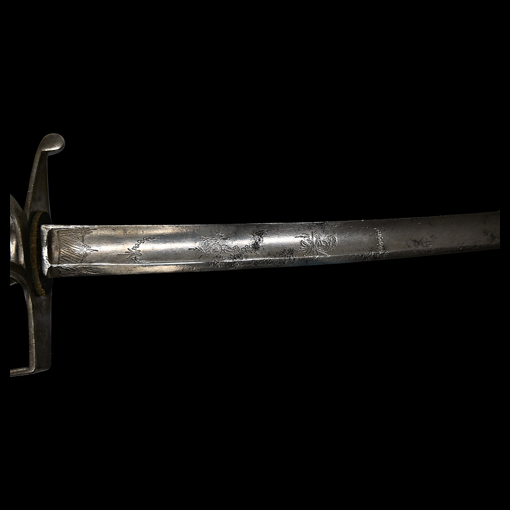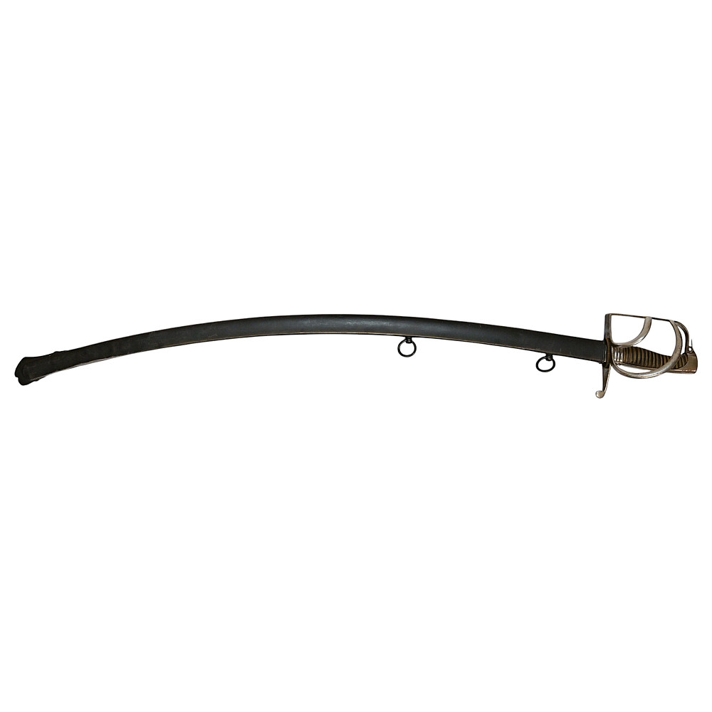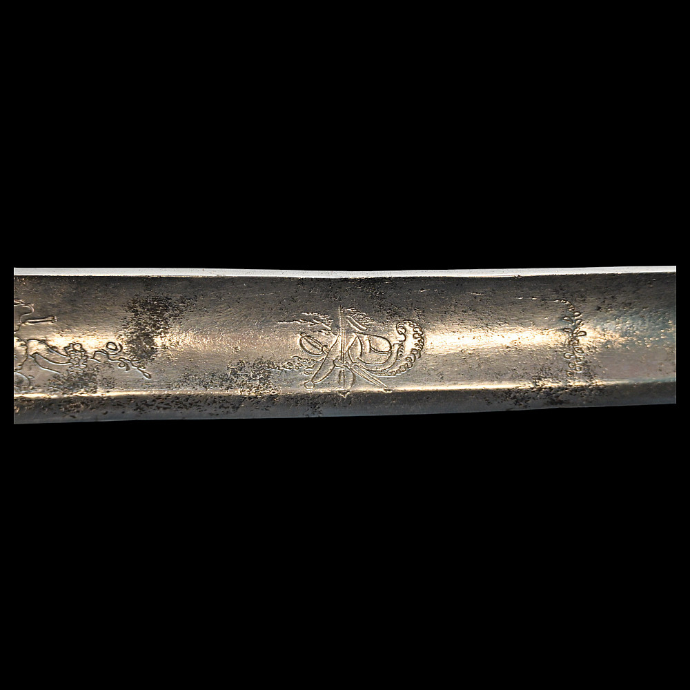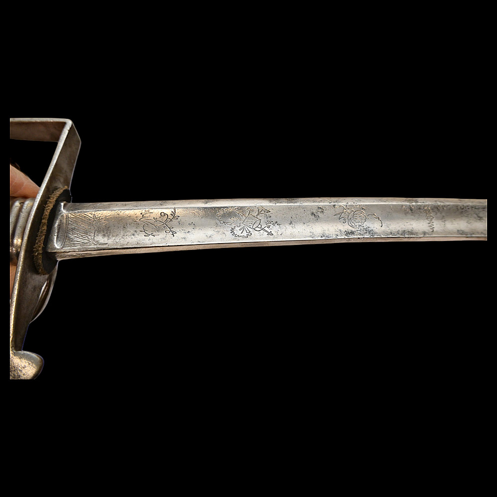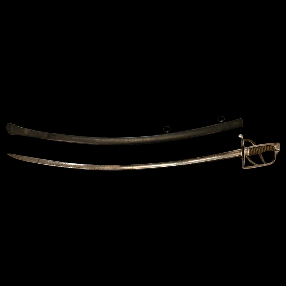 Rare light cavalry sabre model 1809, Russian Empire, first half of the 19th century. The curved steel blade is decorated with engraved decor on both sides. Steel hilt with three protective bows. Wooden handle wrapped in black leather with twisted brass wire. Iron scabbard with two rings for hanging. A rare example of a Russian Empire sabre in good condition. Length 101 cm.
