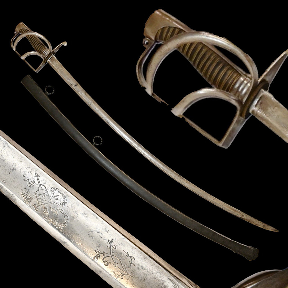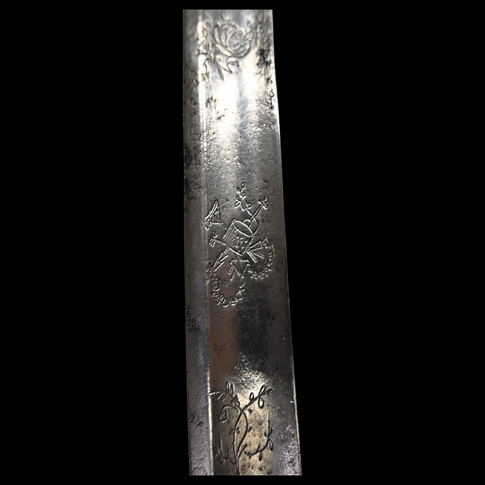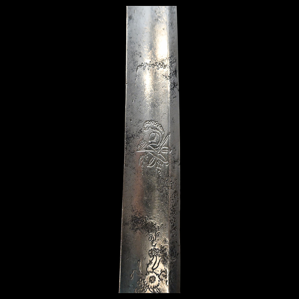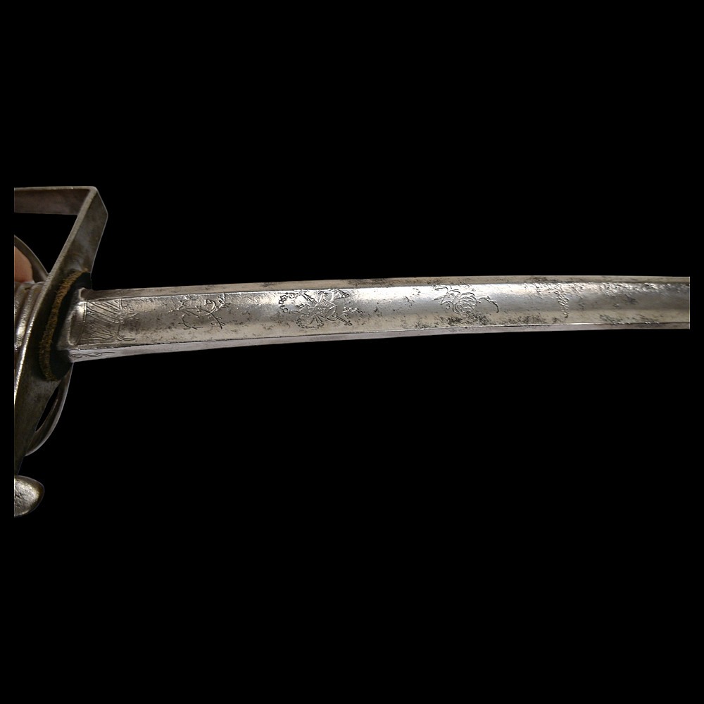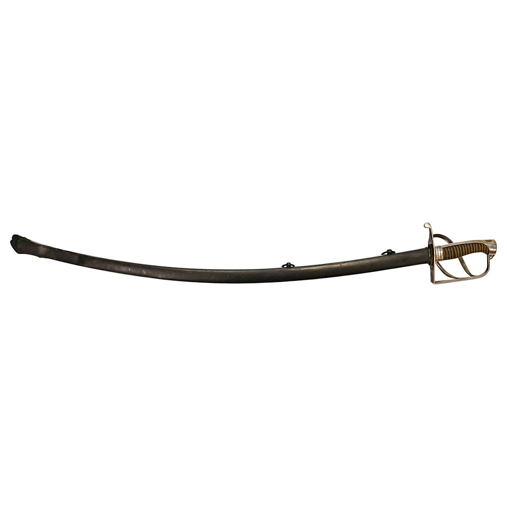 Rare light cavalry sabre model 1809, Russian Empire, first half of the 19th century. The curved steel blade is decorated with engraved decor on both sides. Steel hilt with three protective bows. Wooden handle wrapped in black leather with twisted brass wire. Iron scabbard with two rings for hanging. A rare example of a Russian Empire sabre in good condition. Length 101 cm.