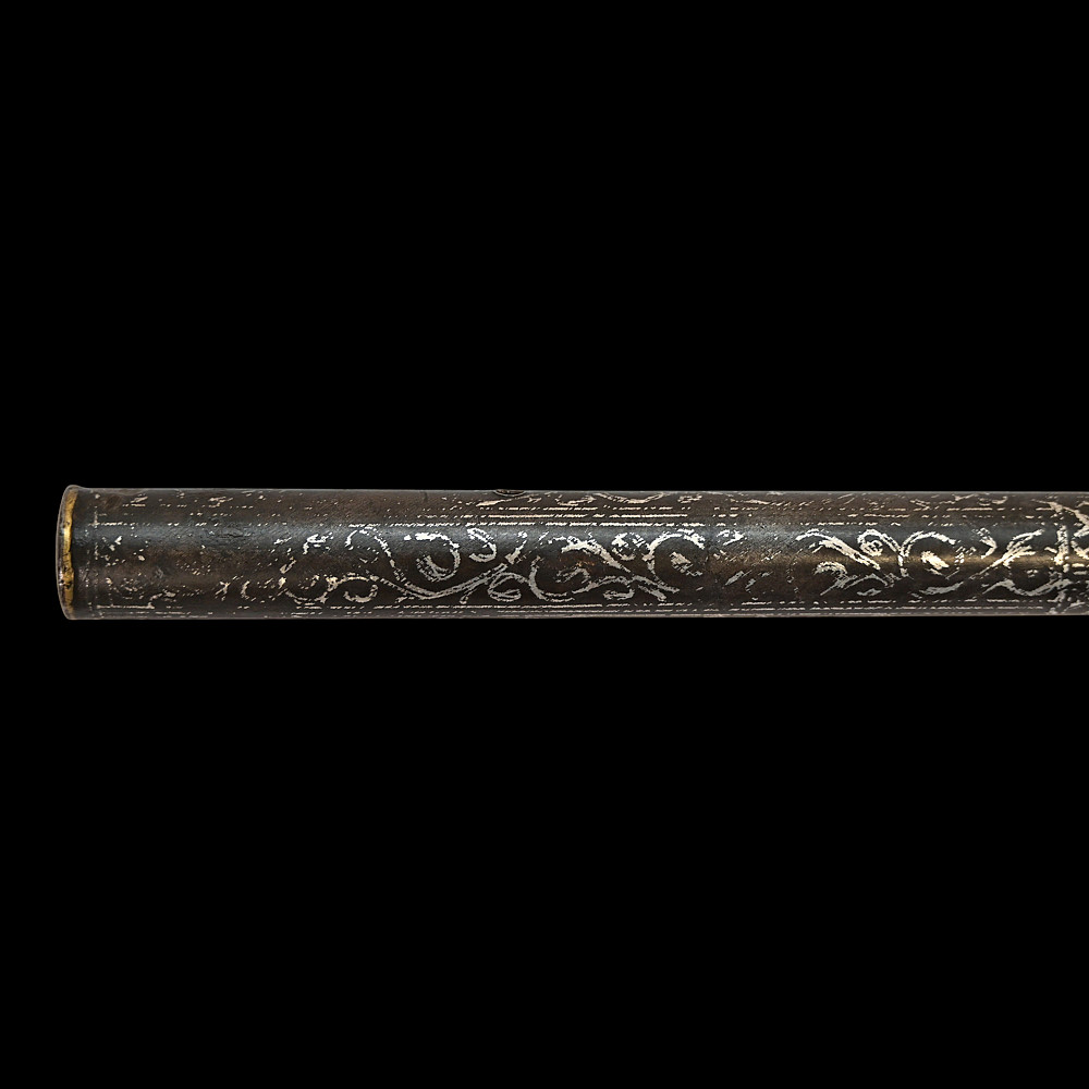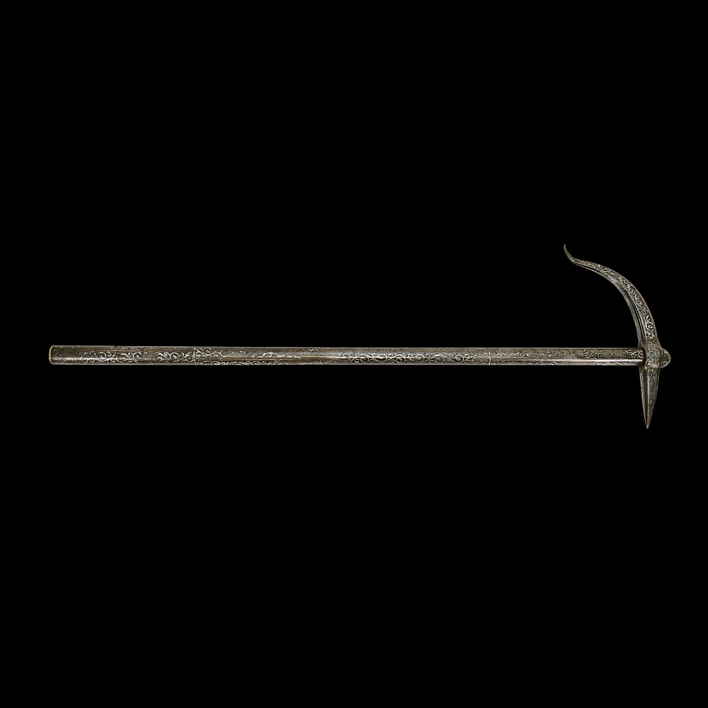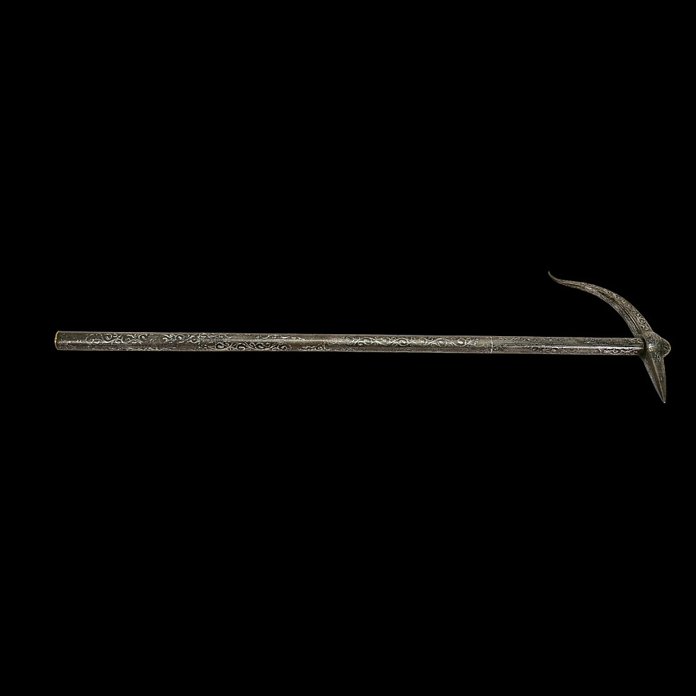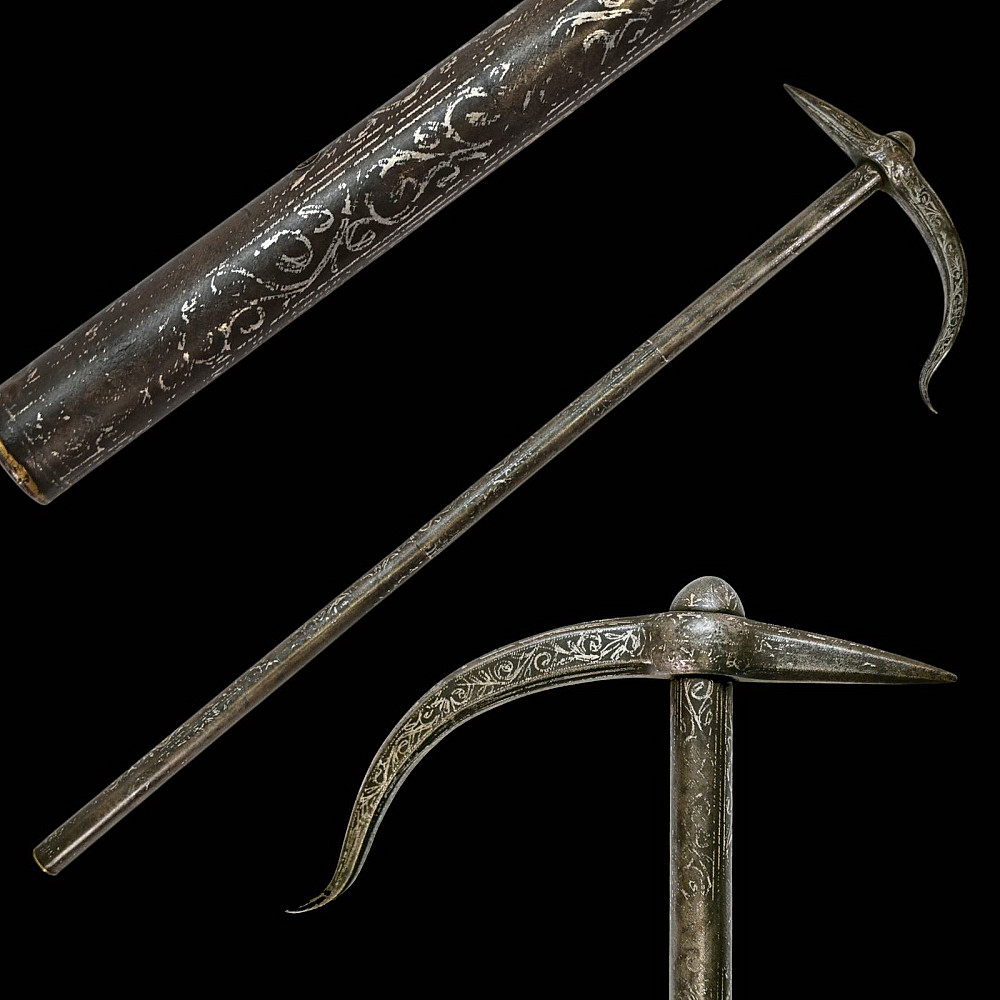 Rare Ottoman War Hammer with Silver Koftgari Decoration, 18th Century. A finely crafted Ottoman war hammer, dating to the 18th century, with elegant silver koftgari inlay covering the entire surface of the weapon. The hammer features a long cylindrical iron haft densely decorated with scrolling floral and foliate motifs in fine silver overlay. The head bears a sharply pointed beak-shaped on one side and a conical hammerhead on the other, both enriched with intricate inlay. The curved beak, designed for piercing armor, displays particularly refined silver scrollwork, indicative of high craftsmanship typical of Ottoman court or elite military workshops. Weapons of this type were used by cavalry officers of the Ottoman Empire both in battle and as symbols of rank and prestige. The precision of the silver inlay and the harmonious proportions of this example suggest it was likely made for a noble or officer of high standing. A distinguished and decorative example of Ottoman martial art, blending functionality with refined aesthetics — a testament to the artistry of the Empire’s armorers. Condition: Very good preserved condition, minor wear and patination consistent with age; silver inlay well preserved throughout. Length: 70 cm.