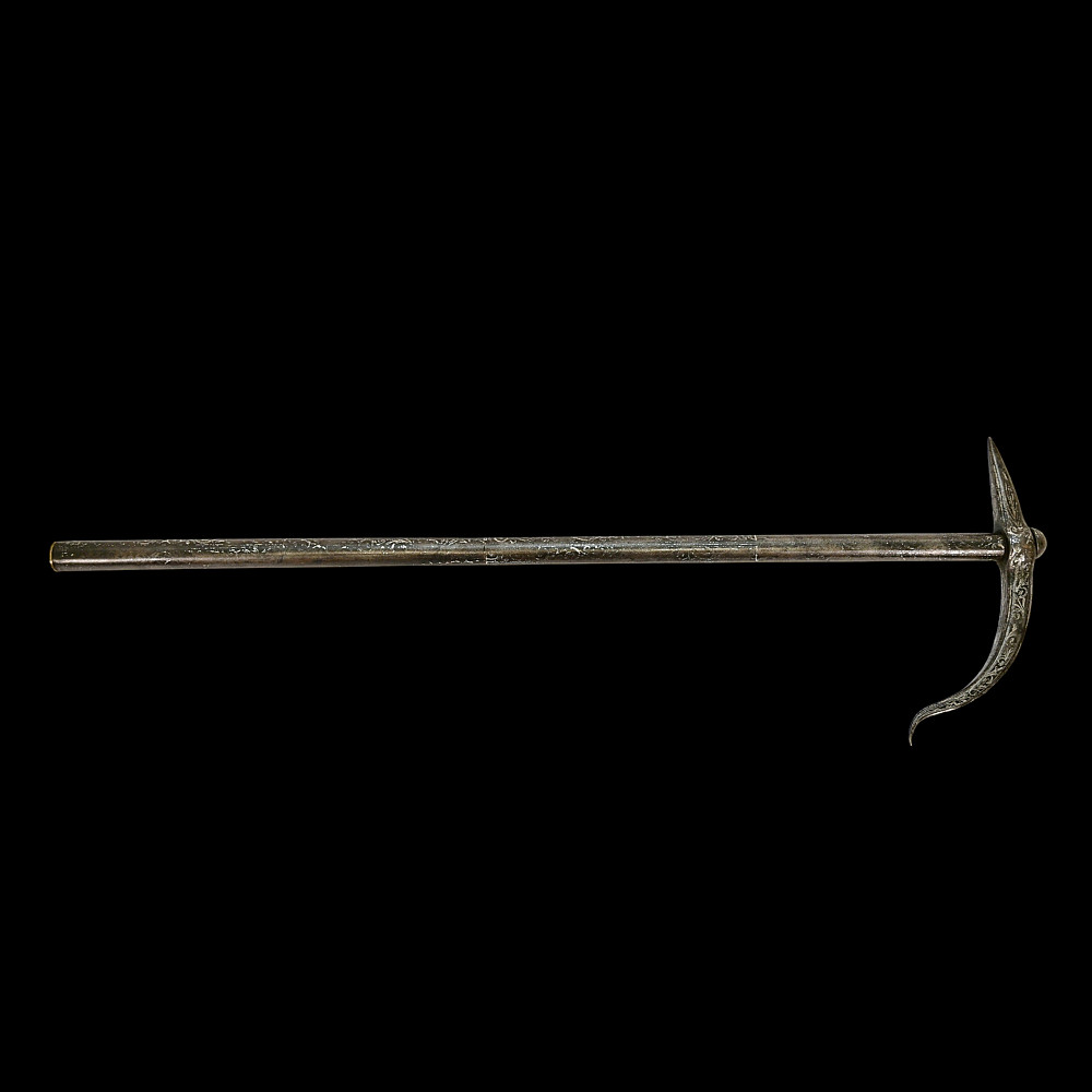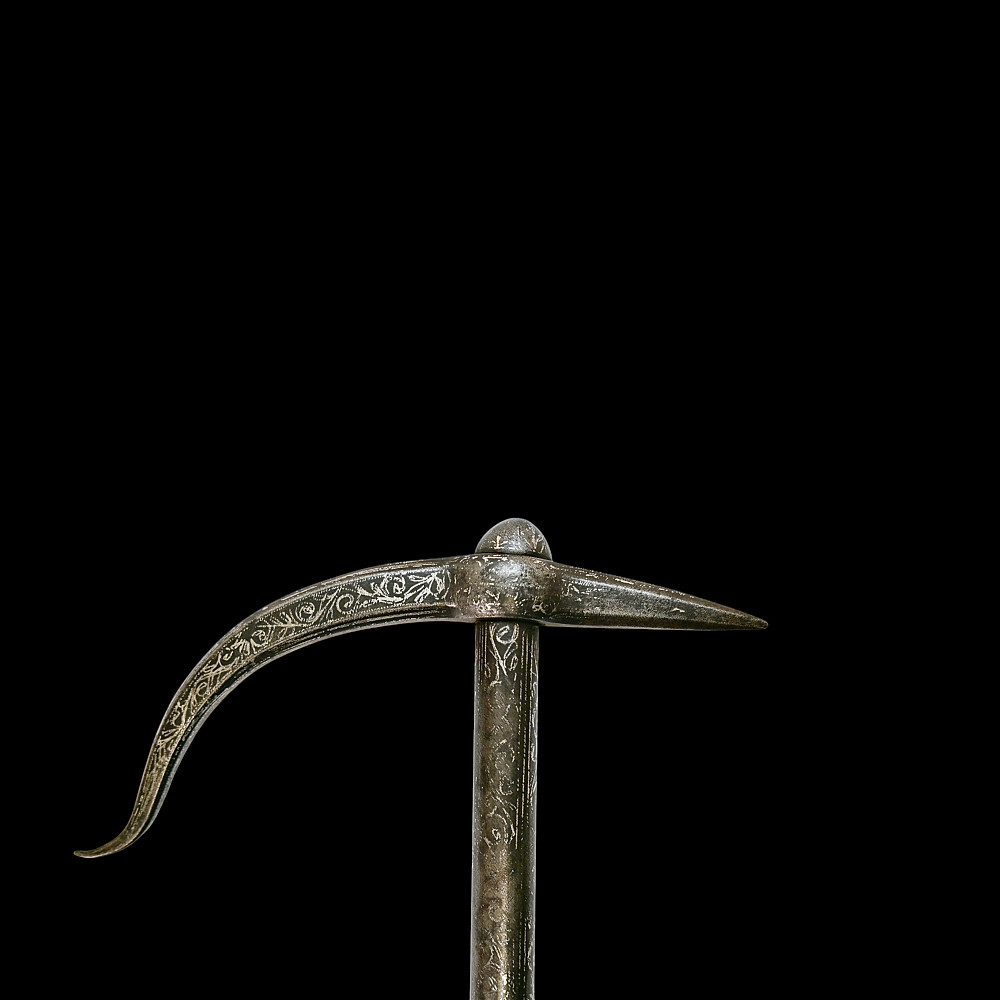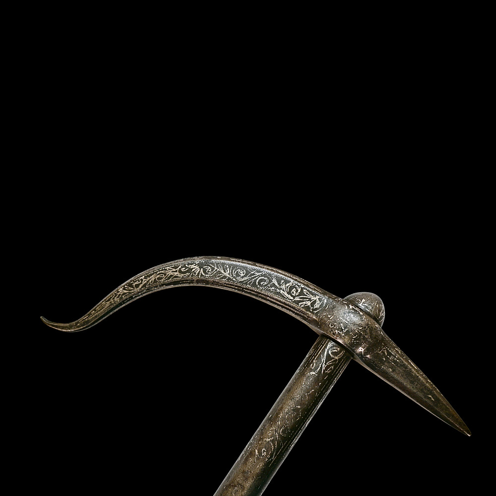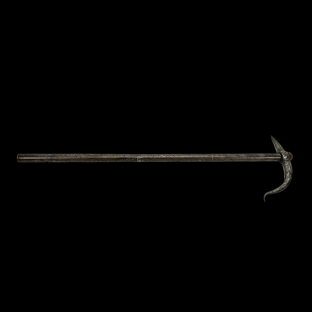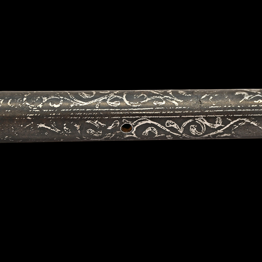 Rare Ottoman War Hammer with Silver Koftgari Decoration, 18th Century. A finely crafted Ottoman war hammer, dating to the 18th century, with elegant silver koftgari inlay covering the entire surface of the weapon. The hammer features a long cylindrical iron haft densely decorated with scrolling floral and foliate motifs in fine silver overlay. The head bears a sharply pointed beak-shaped on one side and a conical hammerhead on the other, both enriched with intricate inlay. The curved beak, designed for piercing armor, displays particularly refined silver scrollwork, indicative of high craftsmanship typical of Ottoman court or elite military workshops. Weapons of this type were used by cavalry officers of the Ottoman Empire both in battle and as symbols of rank and prestige. The precision of the silver inlay and the harmonious proportions of this example suggest it was likely made for a noble or officer of high standing. A distinguished and decorative example of Ottoman martial art, blending functionality with refined aesthetics — a testament to the artistry of the Empire’s armorers. Condition: Very good preserved condition, minor wear and patination consistent with age; silver inlay well preserved throughout. Length: 70 cm.