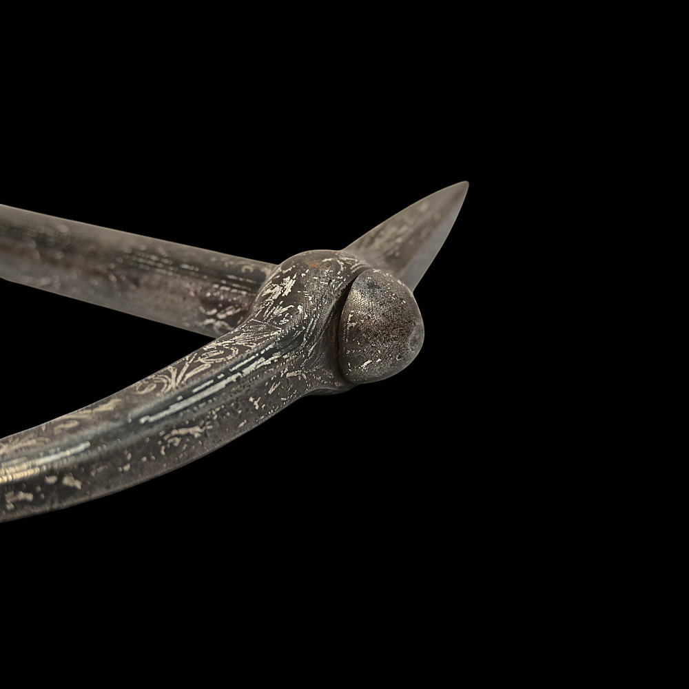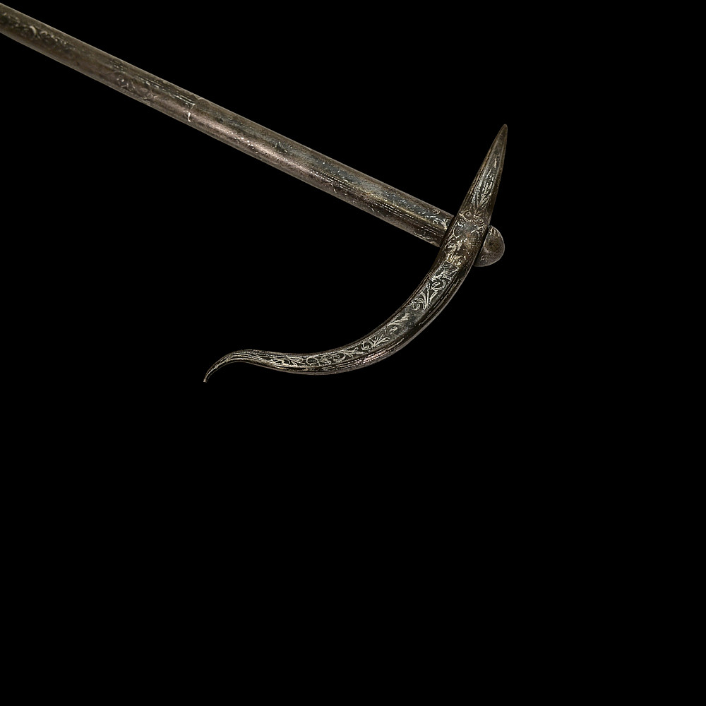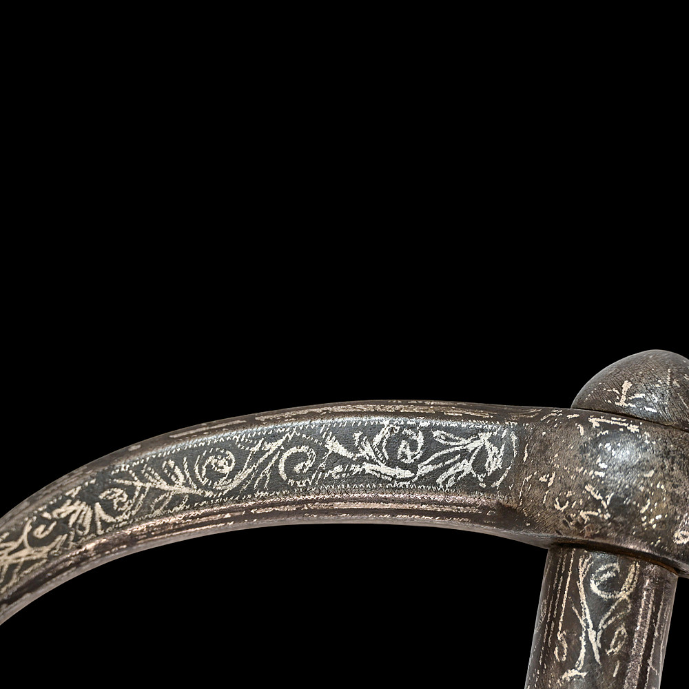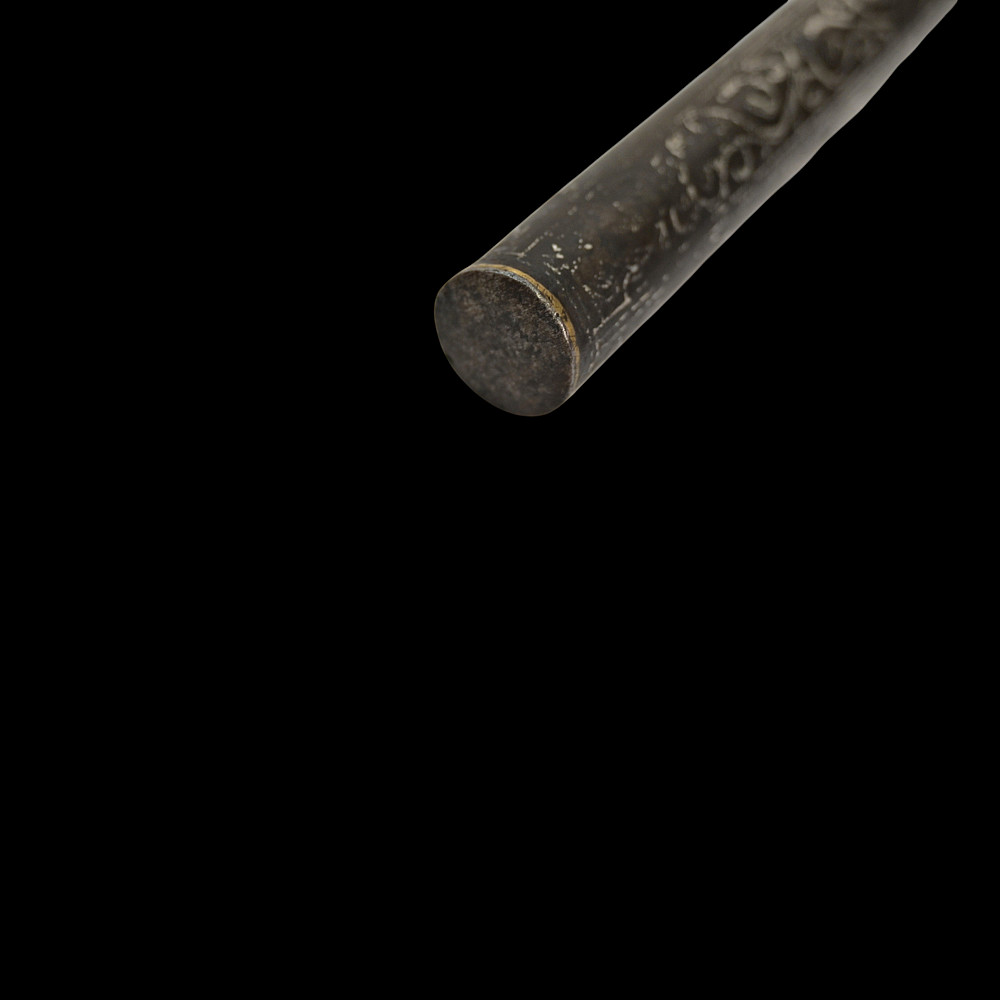 Rare Ottoman War Hammer with Silver Koftgari Decoration, 18th Century. A finely crafted Ottoman war hammer, dating to the 18th century, with elegant silver koftgari inlay covering the entire surface of the weapon. The hammer features a long cylindrical iron haft densely decorated with scrolling floral and foliate motifs in fine silver overlay. The head bears a sharply pointed beak-shaped on one side and a conical hammerhead on the other, both enriched with intricate inlay. The curved beak, designed for piercing armor, displays particularly refined silver scrollwork, indicative of high craftsmanship typical of Ottoman court or elite military workshops. Weapons of this type were used by cavalry officers of the Ottoman Empire both in battle and as symbols of rank and prestige. The precision of the silver inlay and the harmonious proportions of this example suggest it was likely made for a noble or officer of high standing. A distinguished and decorative example of Ottoman martial art, blending functionality with refined aesthetics — a testament to the artistry of the Empire’s armorers. Condition: Very good preserved condition, minor wear and patination consistent with age; silver inlay well preserved throughout. Length: 70 cm.