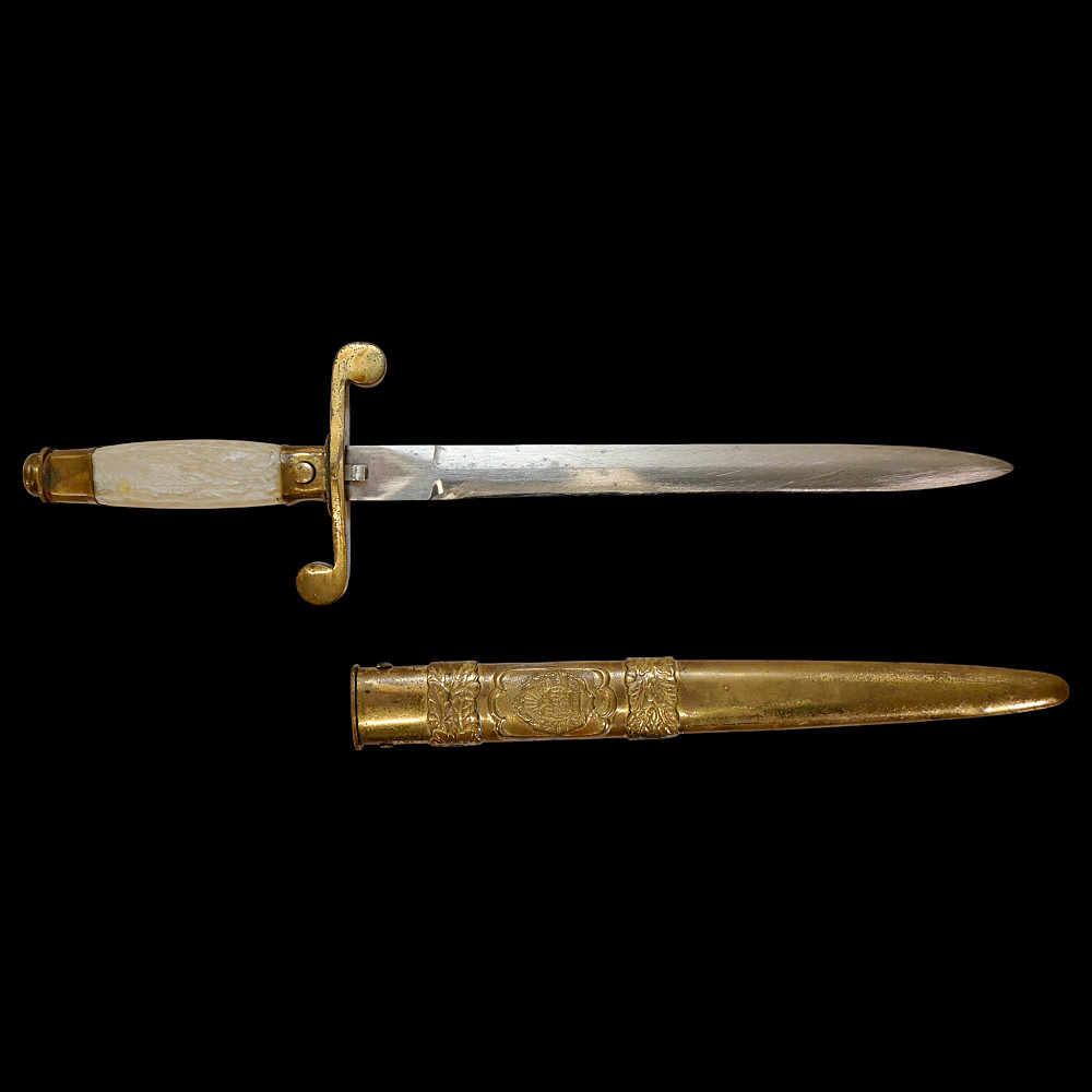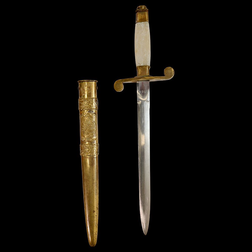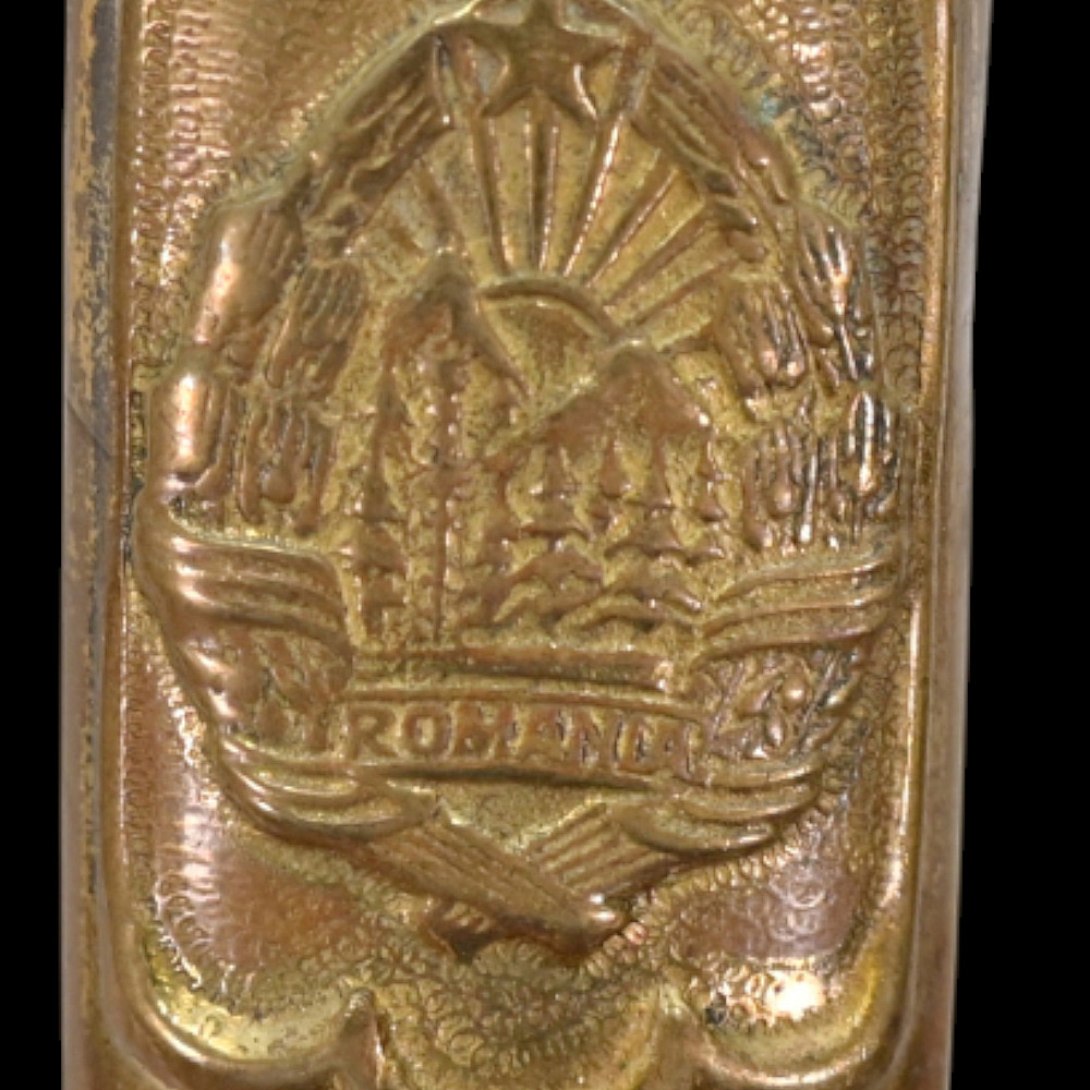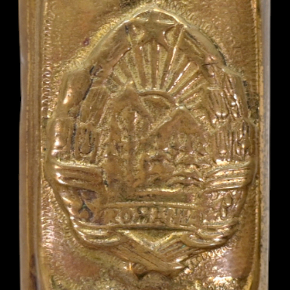 Rare Romanian Dagger, Dirk – People's Republic Period, ca 1950s. A rare dagger of the Romanian People’s Republic, dating to the early Cold War period (circa 1950s). The dagger features a brass hilt and scabbard richly decorated with the Romanian socialist state emblem depicting the rising sun over the Carpathian Mountains within a wreath of wheat ears, surmounted by a red star. The straight double-edged steel blade is serially numbered “10231” near the ricasso. The hilt is fitted with an imitation bone grip, complemented by a crossguard with circular finials. Such daggers were issued to high-ranking officers and officials during the early socialist period of Romania, closely modeled after Soviet daggers. They represent a fascinating symbol of the postwar alignment between Romania and the USSR during the establishment of the Eastern Bloc. Condition: Good, with minor wear and light oxidation consistent with age; blade bright and well-preserved. Dimensions: Overall length approx. 32 cm.