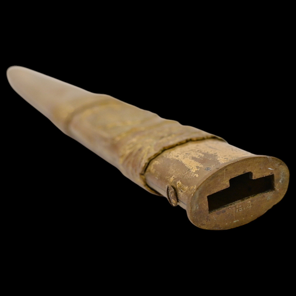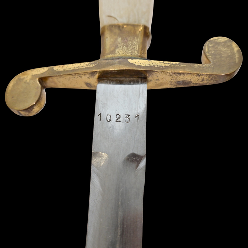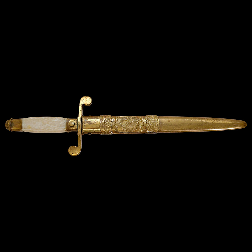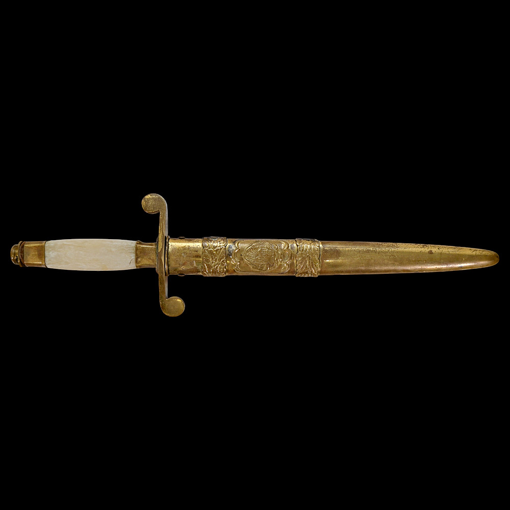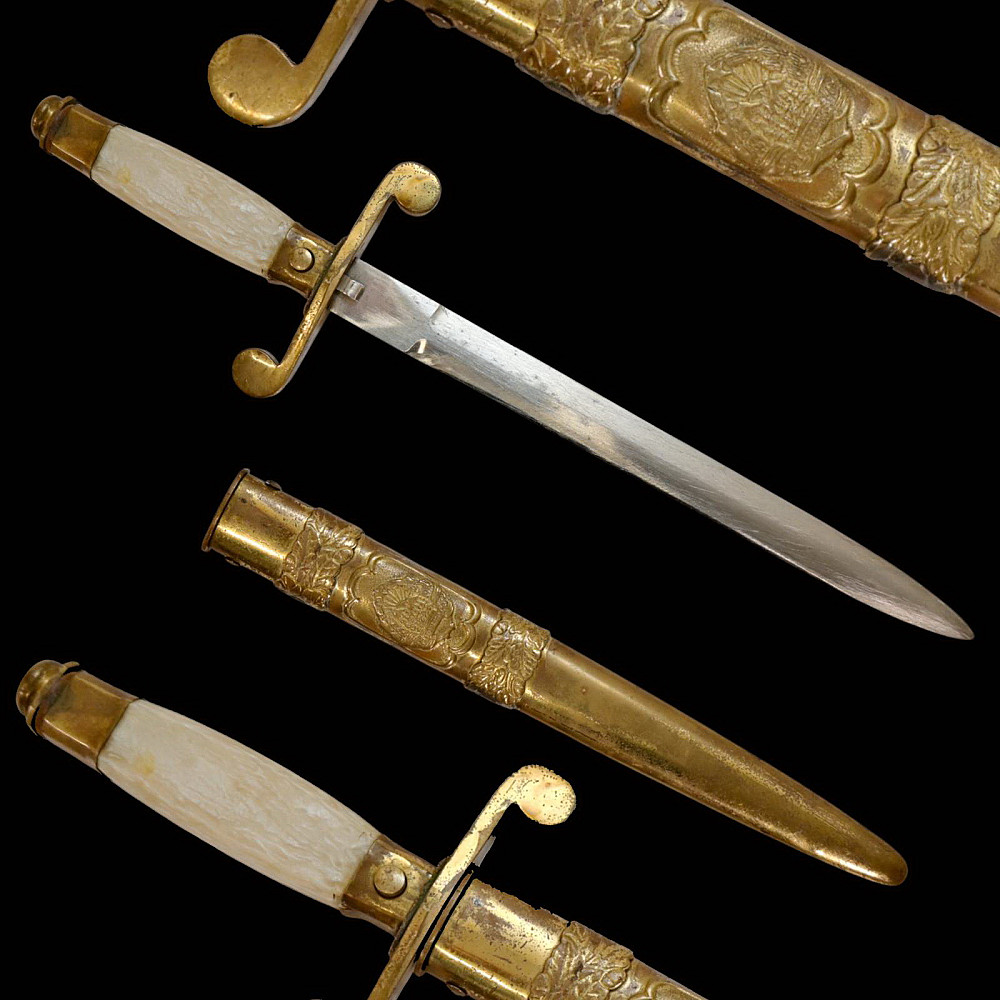 Rare Romanian Dagger, Dirk – People's Republic Period, ca 1950s. A rare dagger of the Romanian People’s Republic, dating to the early Cold War period (circa 1950s). The dagger features a brass hilt and scabbard richly decorated with the Romanian socialist state emblem depicting the rising sun over the Carpathian Mountains within a wreath of wheat ears, surmounted by a red star. The straight double-edged steel blade is serially numbered “10231” near the ricasso. The hilt is fitted with an imitation bone grip, complemented by a crossguard with circular finials. Such daggers were issued to high-ranking officers and officials during the early socialist period of Romania, closely modeled after Soviet daggers. They represent a fascinating symbol of the postwar alignment between Romania and the USSR during the establishment of the Eastern Bloc. Condition: Good, with minor wear and light oxidation consistent with age; blade bright and well-preserved. Dimensions: Overall length approx. 32 cm.