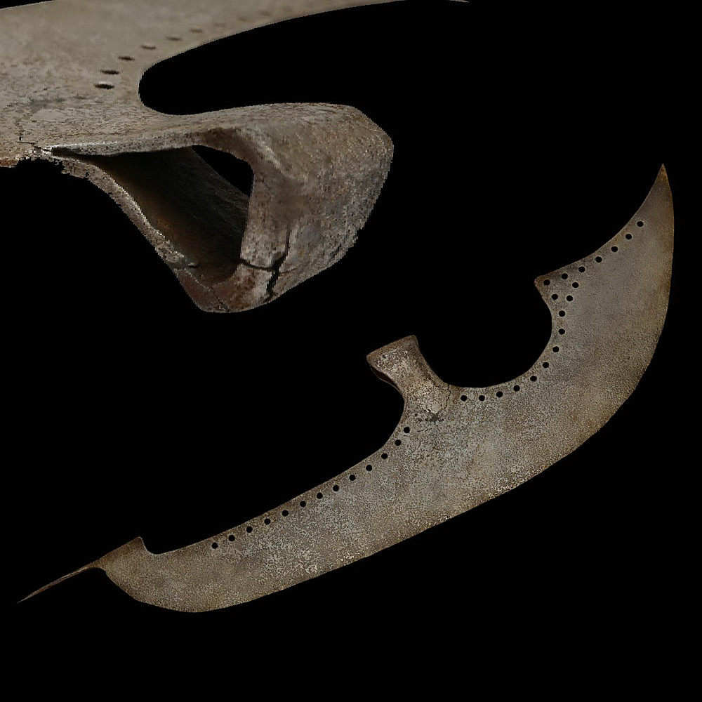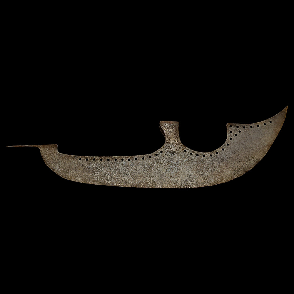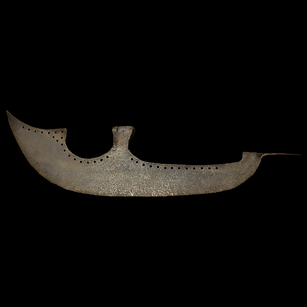 Rare Russian Bardiche (Battle Axe), Tsardom of Moscow, 16th Century. A rare and early Russian bardiche, forged in the 16th century during the period of the Tsardom of Moscow. The long, crescent-shaped blade with pierced decorative holes along the back edge exemplifies the distinctive style of early Muscovite polearms used by streltsy infantry and ceremonial guards. The blade is forged of iron with a broad cutting edge, socketed mount for a wooden shaft. An impressive and historically significant example of early Russian military craftsmanship, illustrating the evolution of polearms from the medieval to the early modern era. Condition: Very good for its age, Minor damage, see photos. Length: approx. 83 cm.