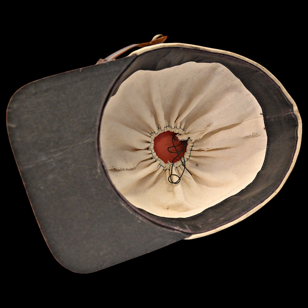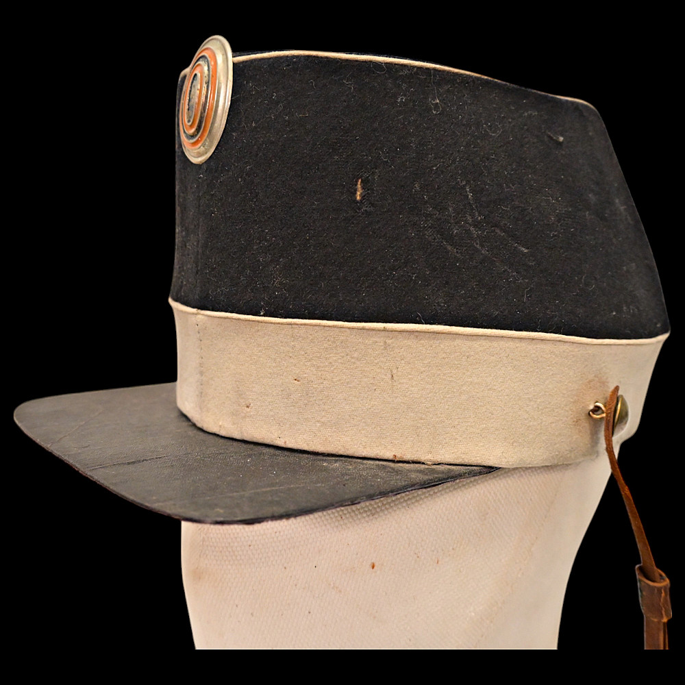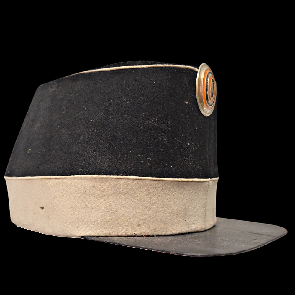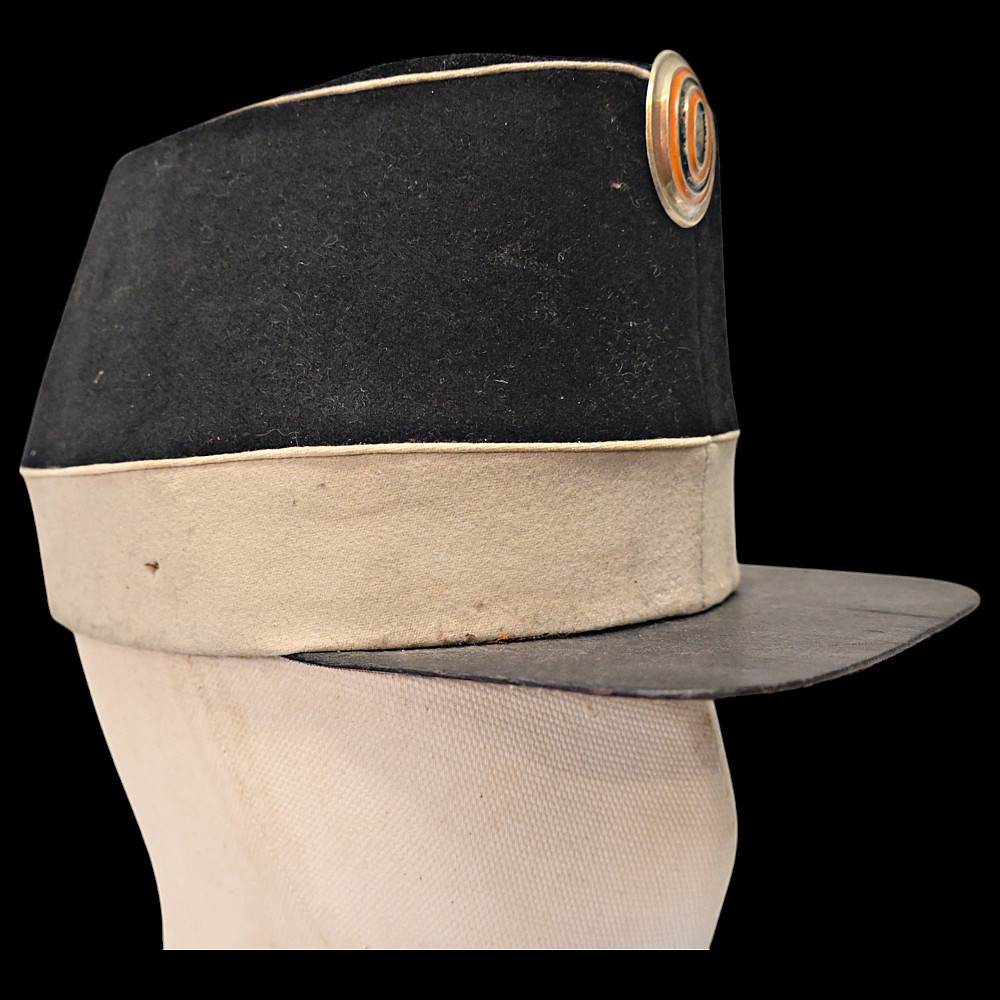 Rare Russian Imperial Cavalry Enlisted Man's Forage Vice Cap, 19th Century. An exceptional and rare vice cap worn by enlisted cavalry personnel of the Russian Imperial Army in the 19th century. The cap features a two-tone construction, black upper section and white band—with piping in white. Mounted on the front is a cockade in the traditional Imperial colors of orange and black, set within a silver-toned oval frame. Constructed from finely milled wool felt, the cap retains its original flat visor and brown leather chinstrap, secured with brass buttons. The interior shows period lining and signs of genuine use. A rare collectible artifact of the military history of the Russian Empire. Good condition. Height 13 cm.