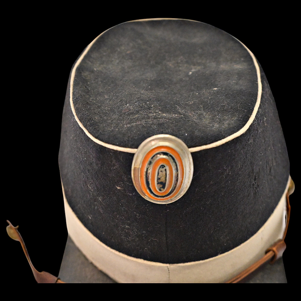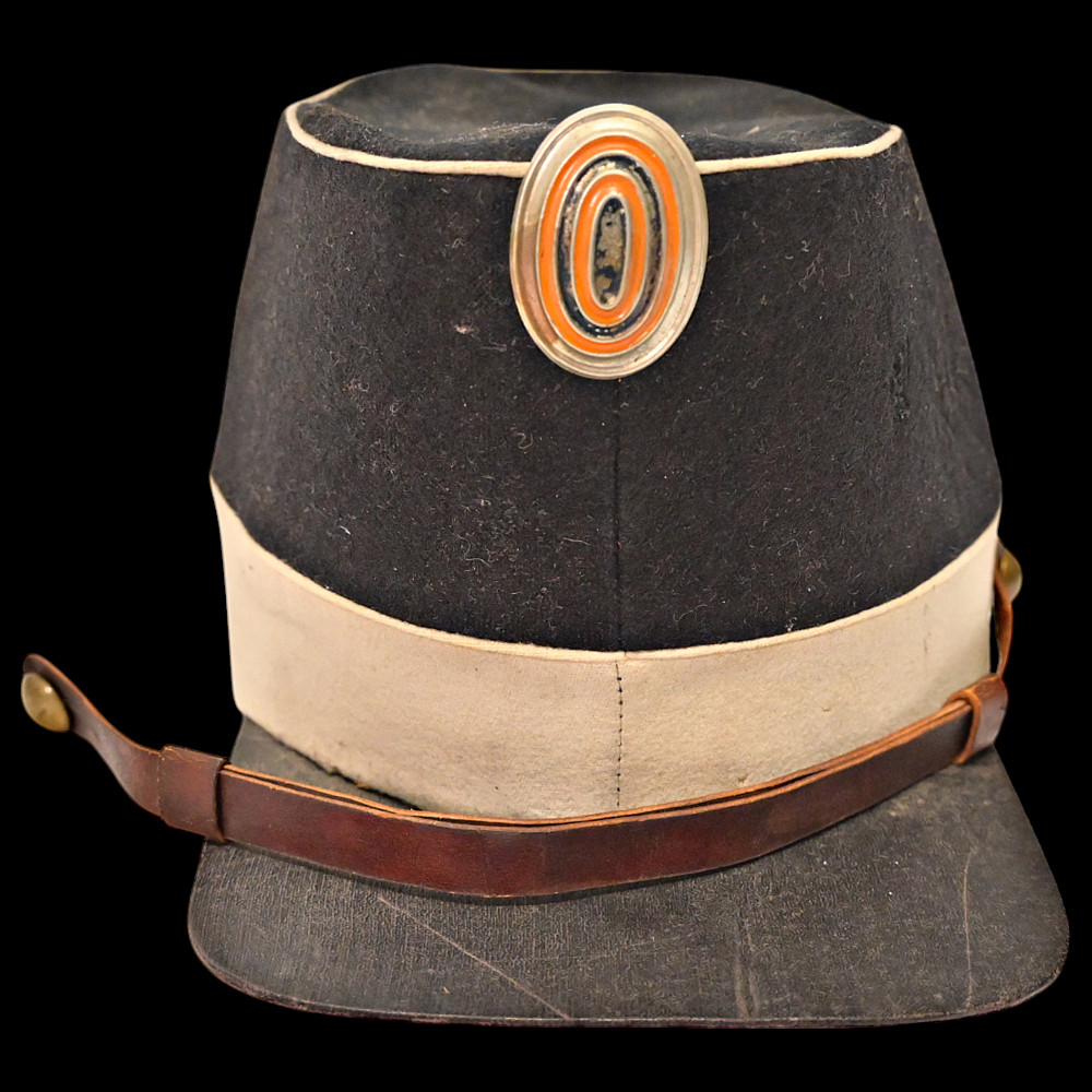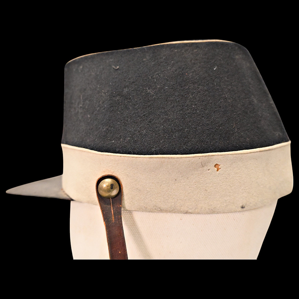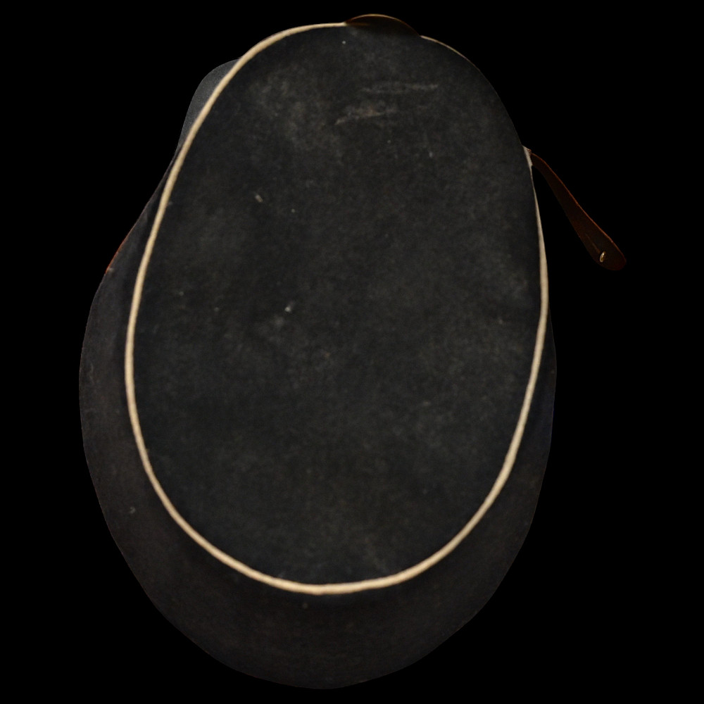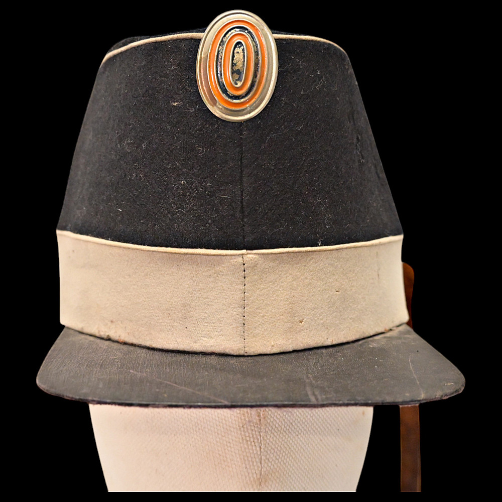 Rare Russian Imperial Cavalry Enlisted Man's Forage Vice Cap, 19th Century. An exceptional and rare vice cap worn by enlisted cavalry personnel of the Russian Imperial Army in the 19th century. The cap features a two-tone construction, black upper section and white band—with piping in white. Mounted on the front is a cockade in the traditional Imperial colors of orange and black, set within a silver-toned oval frame. Constructed from finely milled wool felt, the cap retains its original flat visor and brown leather chinstrap, secured with brass buttons. The interior shows period lining and signs of genuine use. A rare collectible artifact of the military history of the Russian Empire. Good condition. Height 13 cm.