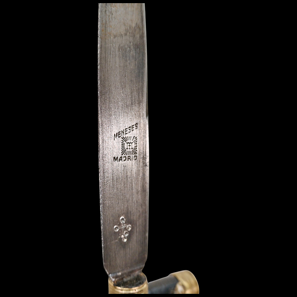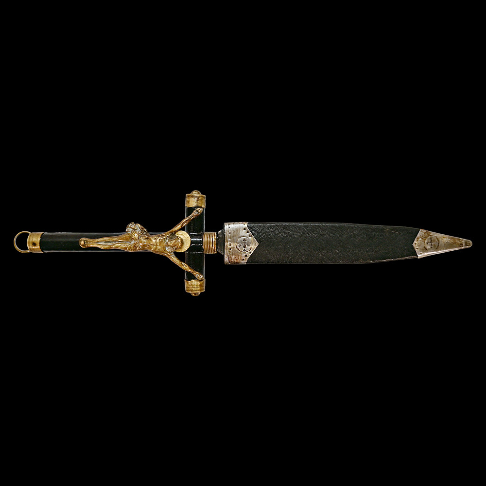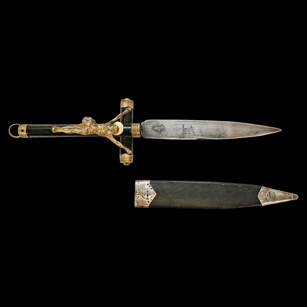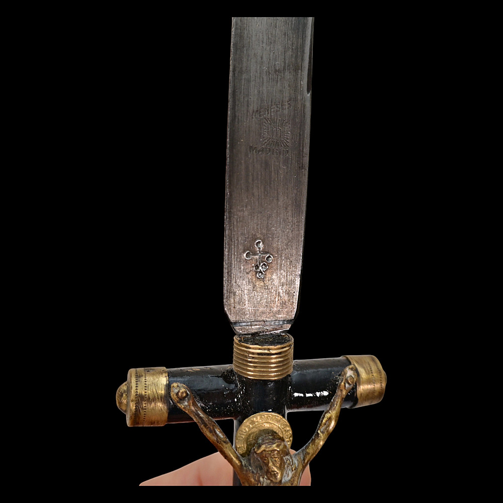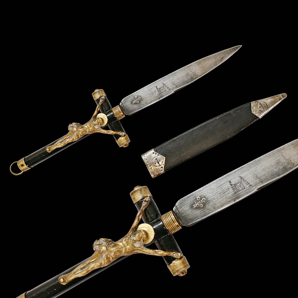 Rare Spanish Crucifix Dagger, Plata Meneses, 1935. An exceptional Spanish crucifix dagger, produced by the prestigious firm Plata Meneses, Madrid, and dated 1935. The hilt is formed as a Latin cross, mounted with a finely cast bronze figure of Christ in high relief, the ends capped with metal. The grip and crosspiece are finished in black lacquered wood, lending the piece an elegant and solemn appearance. The double-edged steel blade bears clear Meneses Madrid markings, including the distinctive sunburst emblem enclosing a Gothic “M”, and the engraved date 1935. The black leather scabbard is fitted with silvered mounts delicately engraved with cross motifs. Crucifix daggers of this type were traditionally carried in Catholic Spain as devotional or symbolic weapons, often associated with the Spanish Civil War era. A rare and beautifully made devotional dagger by one of Spain’s finest 20th-century cutlers, Plata Meneses of Madrid. Condition: Very good, showing honest wear and patina; blade markings well preserved. Length: approx. 27 cm.