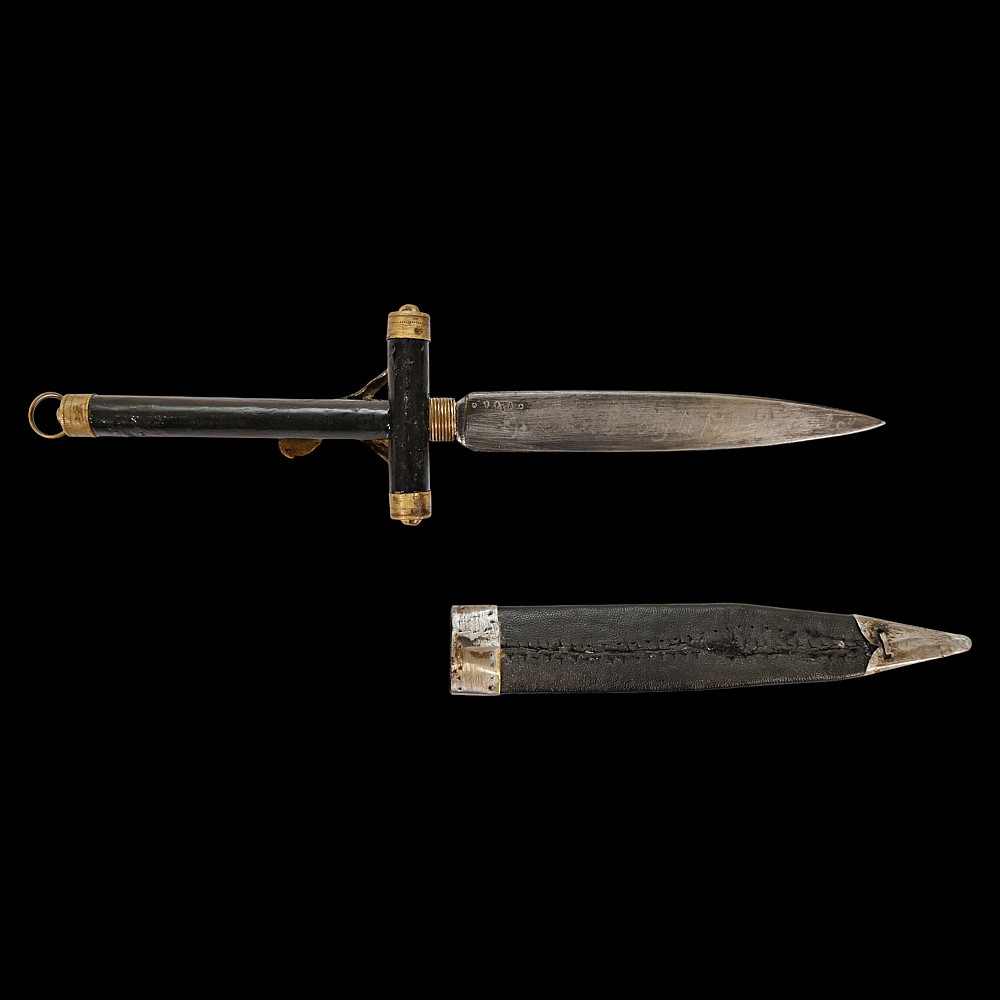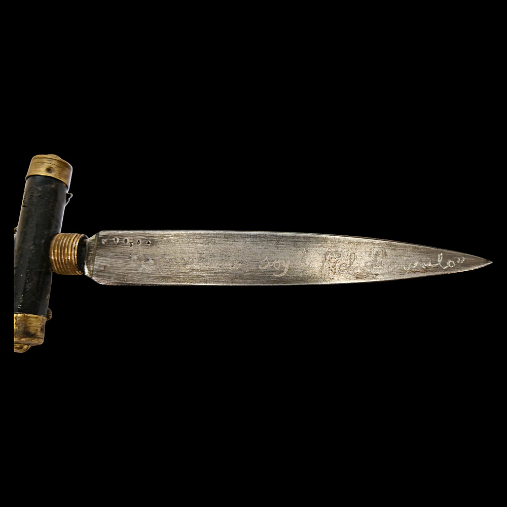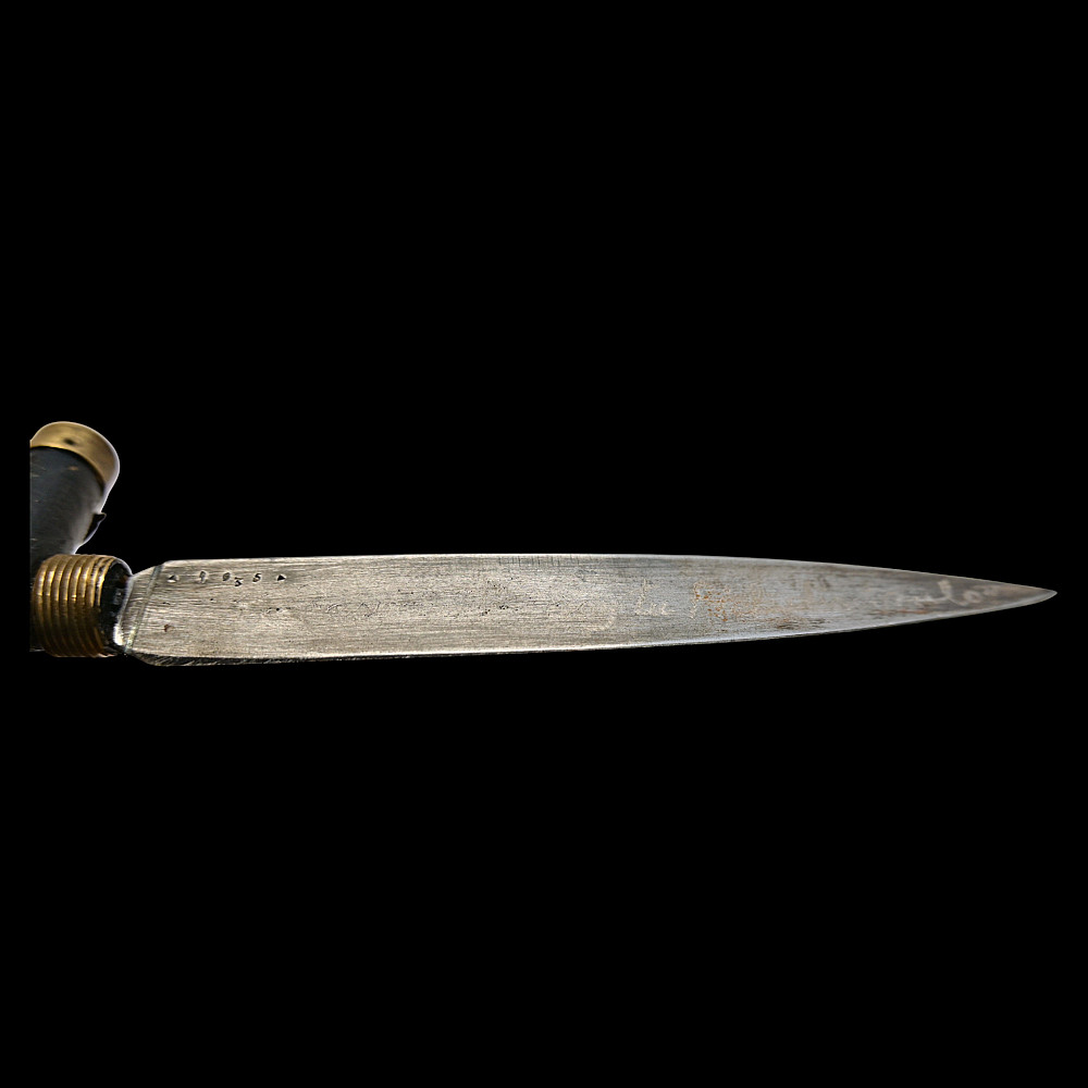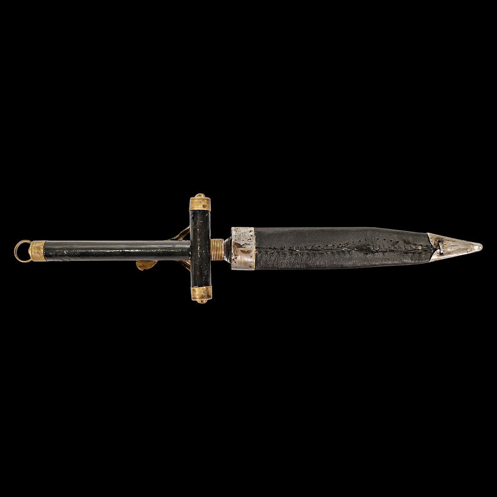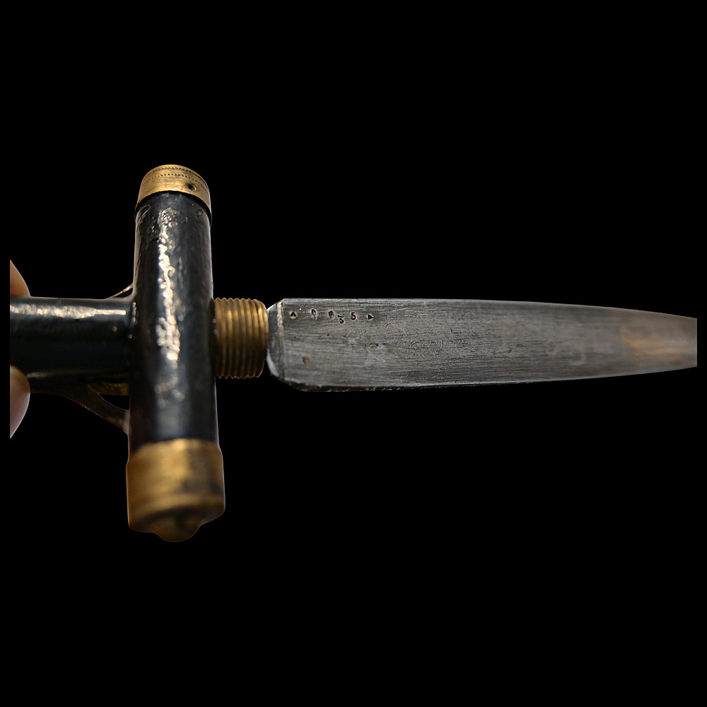 Rare Spanish Crucifix Dagger, Plata Meneses, 1935. An exceptional Spanish crucifix dagger, produced by the prestigious firm Plata Meneses, Madrid, and dated 1935. The hilt is formed as a Latin cross, mounted with a finely cast bronze figure of Christ in high relief, the ends capped with metal. The grip and crosspiece are finished in black lacquered wood, lending the piece an elegant and solemn appearance. The double-edged steel blade bears clear Meneses Madrid markings, including the distinctive sunburst emblem enclosing a Gothic “M”, and the engraved date 1935. The black leather scabbard is fitted with silvered mounts delicately engraved with cross motifs. Crucifix daggers of this type were traditionally carried in Catholic Spain as devotional or symbolic weapons, often associated with the Spanish Civil War era. A rare and beautifully made devotional dagger by one of Spain’s finest 20th-century cutlers, Plata Meneses of Madrid. Condition: Very good, showing honest wear and patina; blade markings well preserved. Length: approx. 27 cm.