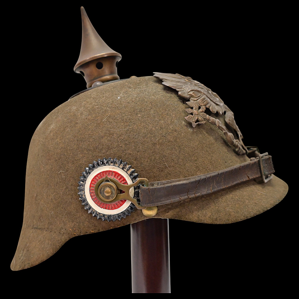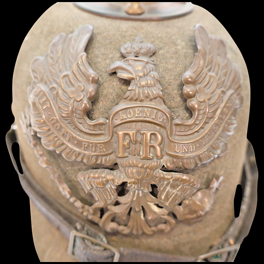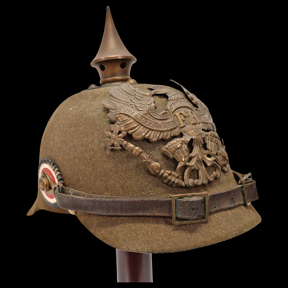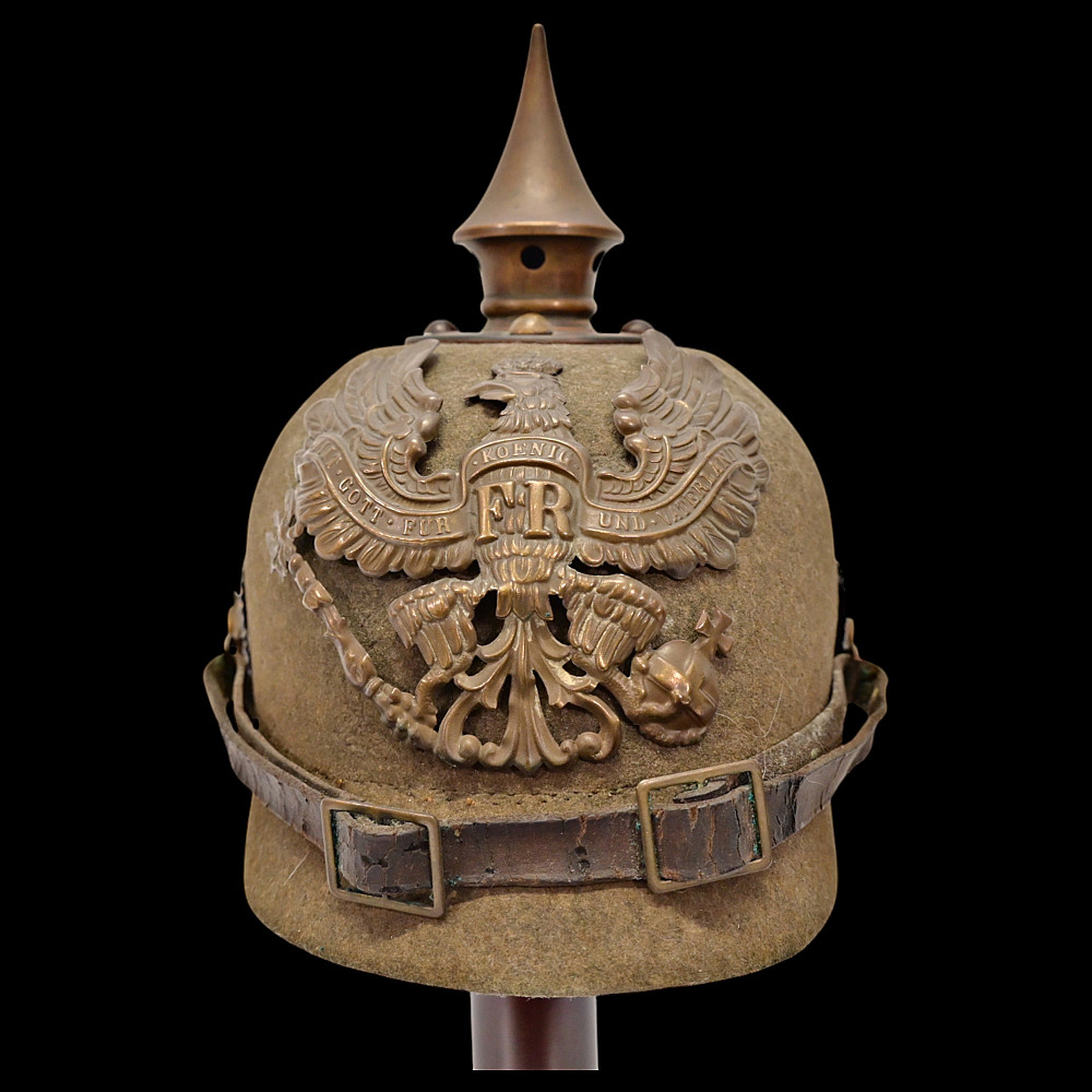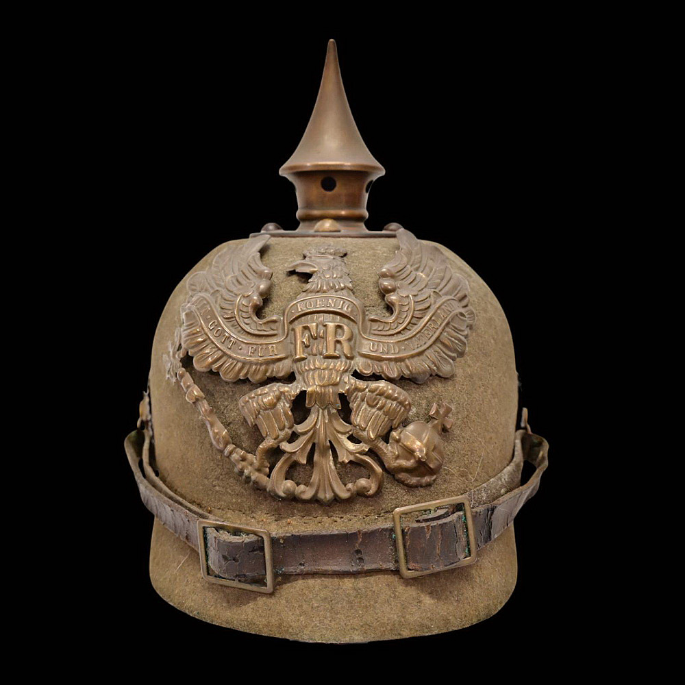 Rare WWI Prussian Ersatz Felt Pickelhaube, Model 1915. A rare and authentic Model 1915 Prussian Ersatz Pickelhaube, wartime economy version manufactured from pressed brown felt to replace the traditional leather helmets during World War I. The helmet features a high-quality hard felt shell, fitted with all-original field-gray metal fittings, including the removable ventilated spike. The large Prussian eagle front plate (wappen) in brass bears the crowned cipher “FR” (Friedrich Rex) and the motto “Mit Gott fur Konig und Vaterland” (“With God for King and Fatherland”). Retains the original leather chinstrap, mounted on Model 1915 gray metal side posts, complete with both national (black-white-red) and Prussian (black-white) cockades. The interior shows the original black leather liner. Condition: Very good but there is some minor damage, look at the photo. Height: approx. 22 cm (to spike).