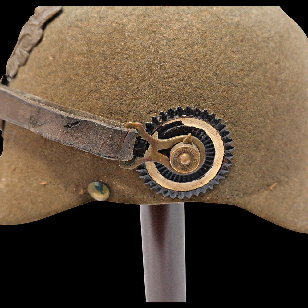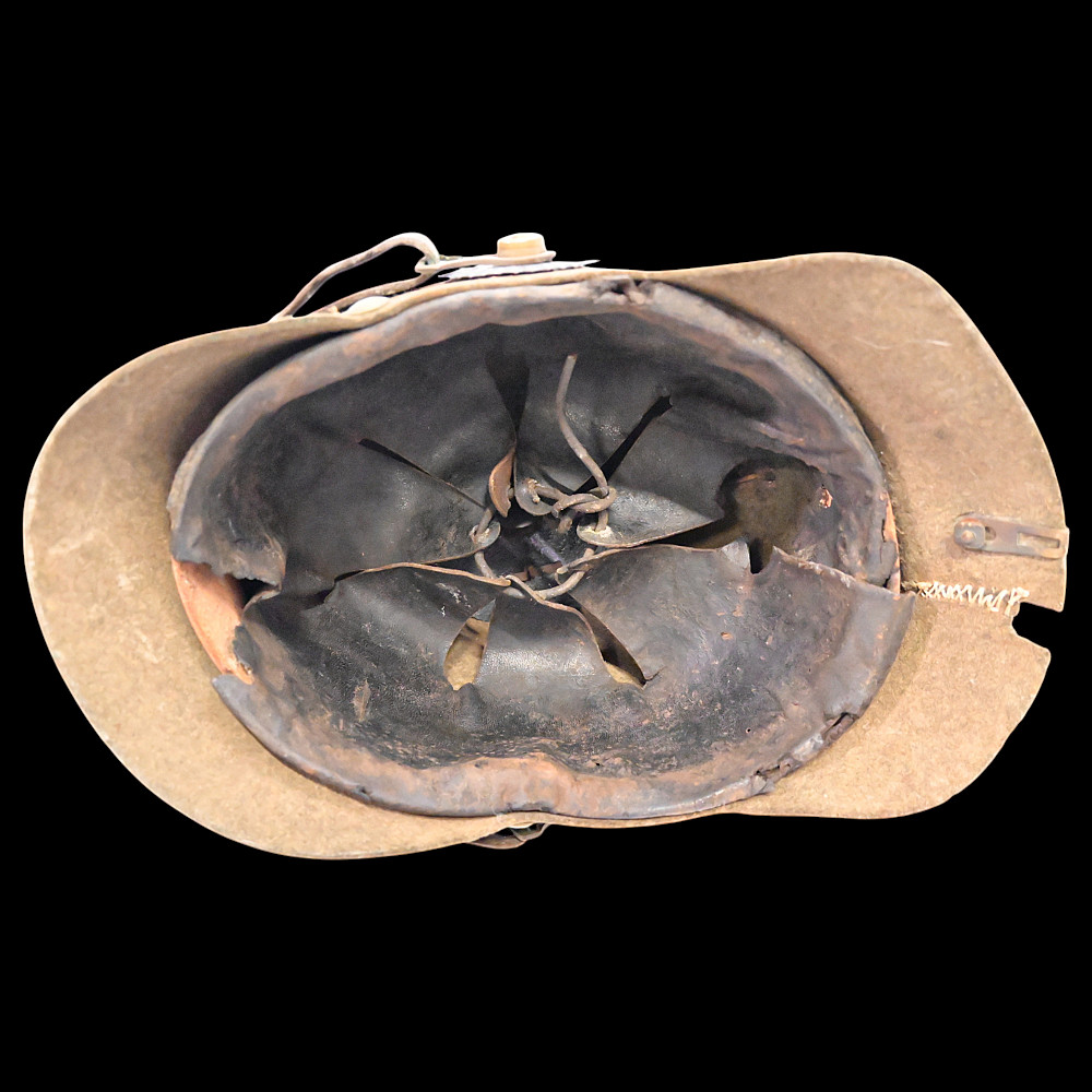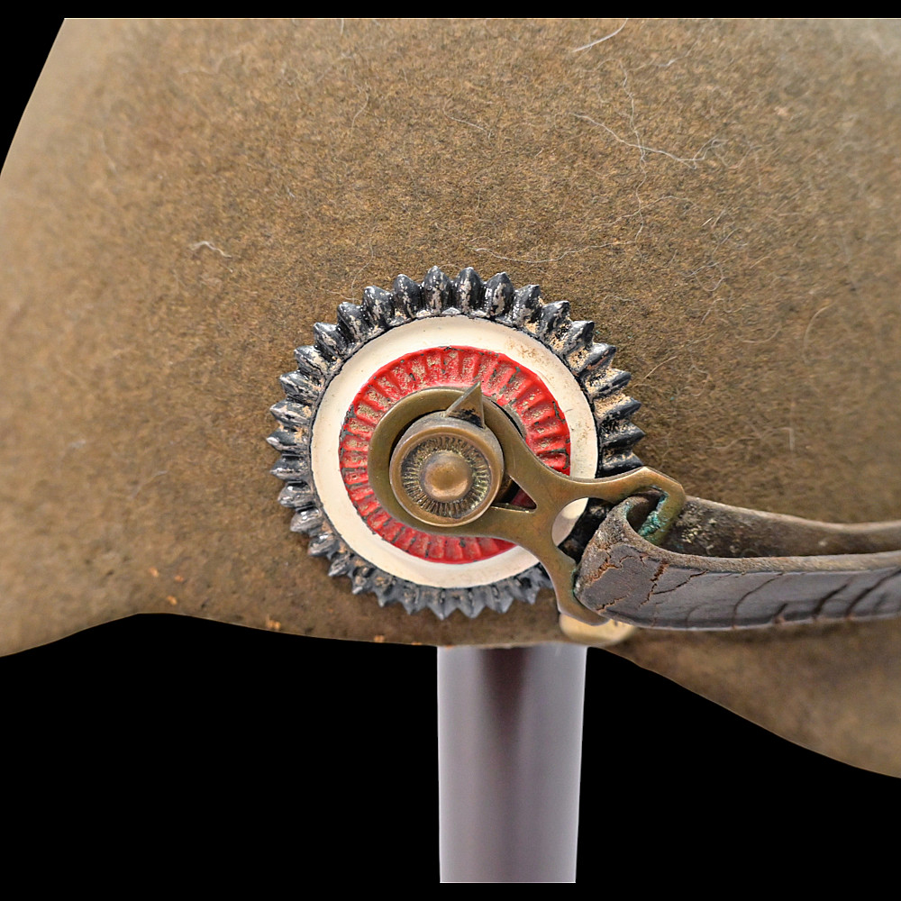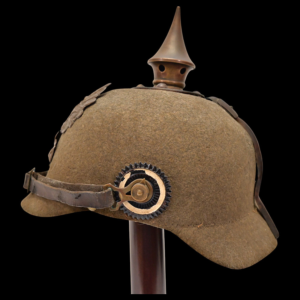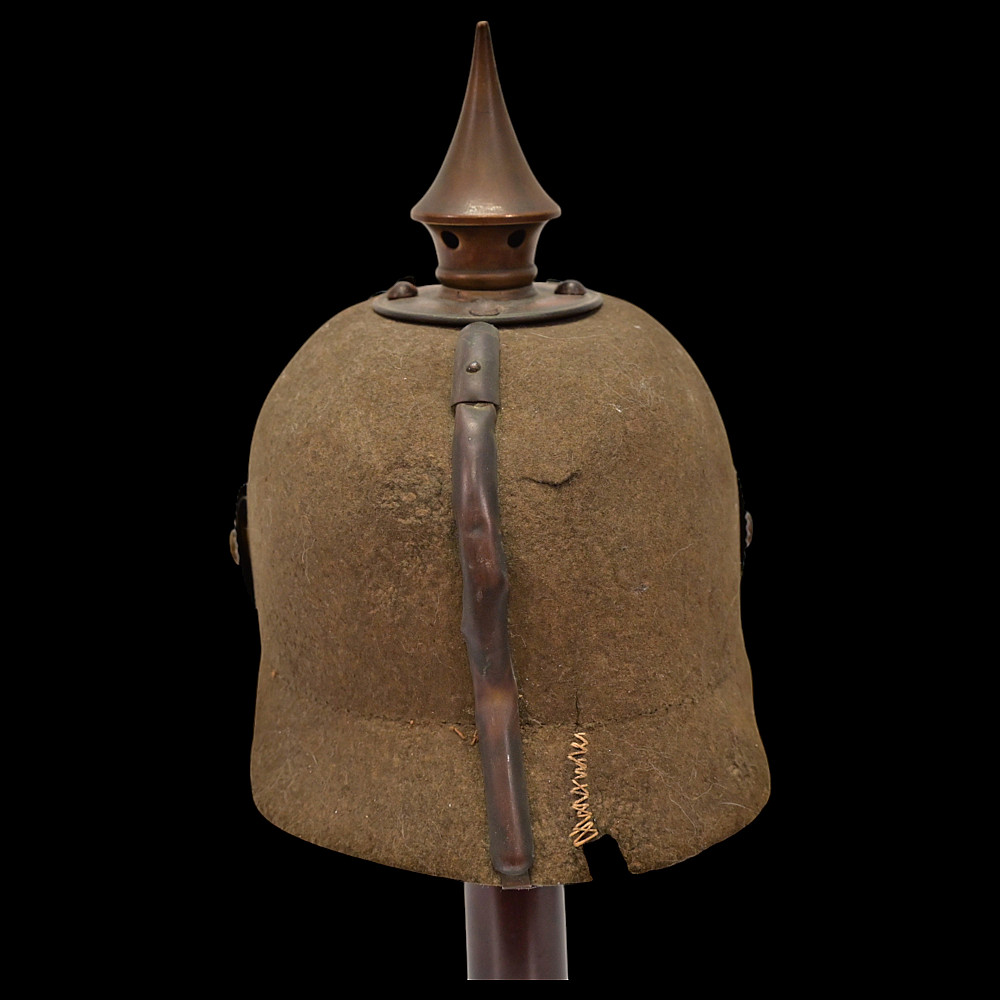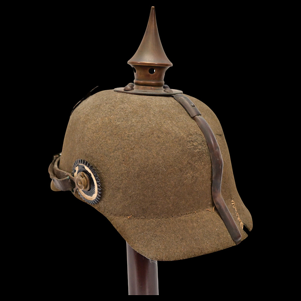 Rare WWI Prussian Ersatz Felt Pickelhaube, Model 1915. A rare and authentic Model 1915 Prussian Ersatz Pickelhaube, wartime economy version manufactured from pressed brown felt to replace the traditional leather helmets during World War I. The helmet features a high-quality hard felt shell, fitted with all-original field-gray metal fittings, including the removable ventilated spike. The large Prussian eagle front plate (wappen) in brass bears the crowned cipher “FR” (Friedrich Rex) and the motto “Mit Gott fur Konig und Vaterland” (“With God for King and Fatherland”). Retains the original leather chinstrap, mounted on Model 1915 gray metal side posts, complete with both national (black-white-red) and Prussian (black-white) cockades. The interior shows the original black leather liner. Condition: Very good but there is some minor damage, look at the photo. Height: approx. 22 cm (to spike).