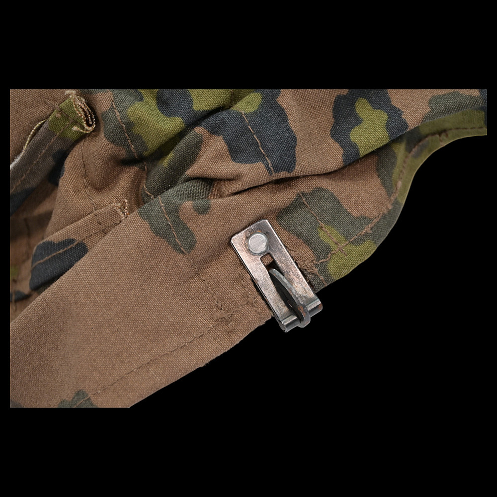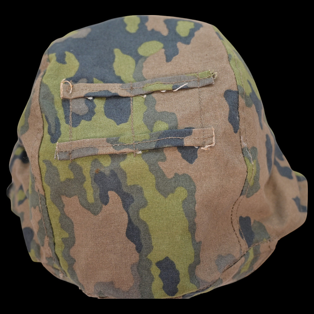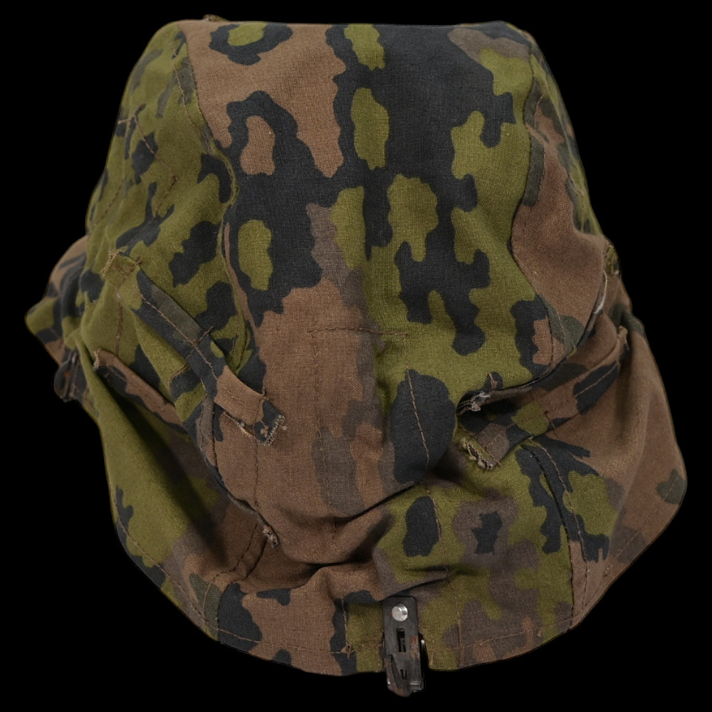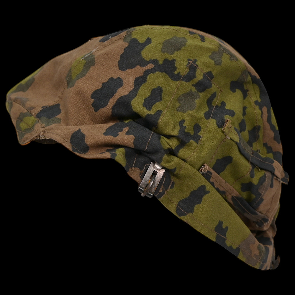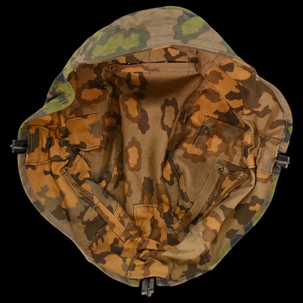 Rare WWII Nazi German cover for Waffen SS helmet, 1st type in oak leaf pattern camouflage. A helmet cover 1st type in oak leaf pattern camouflage. Reversible issue in cloth imprinted with spring and autumn colours the lower edge. A three blackened hooks on tension springs for affixing to the steel helmet both sides with sewn-in brown linen visor reinforcement. Cf. Beaver M. Camouflage Uniforms of the Waffen-SS pp. 119 - 136. An excellent collector’s item for military history enthusiasts or those interested in WWII memorabilia. Good condition