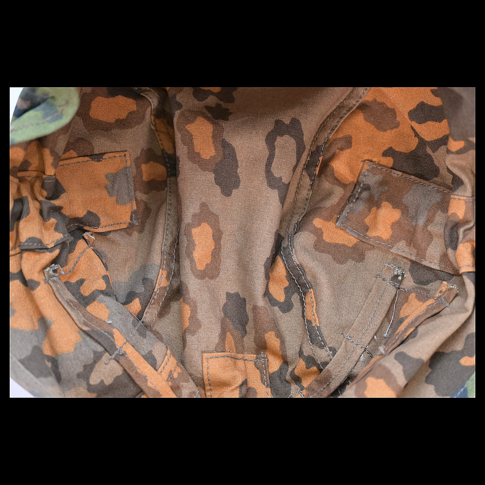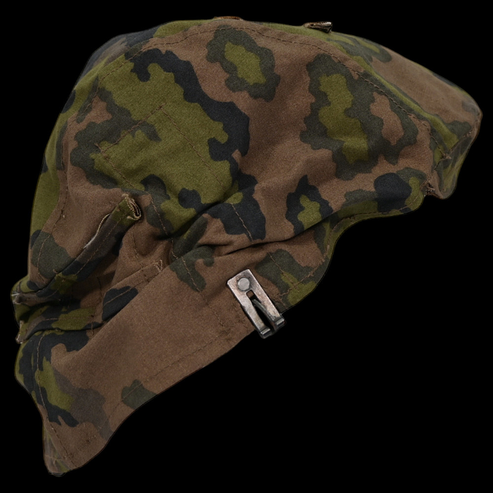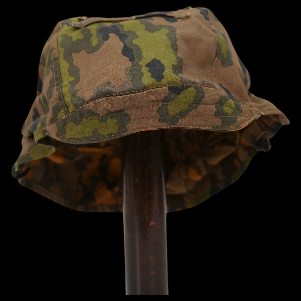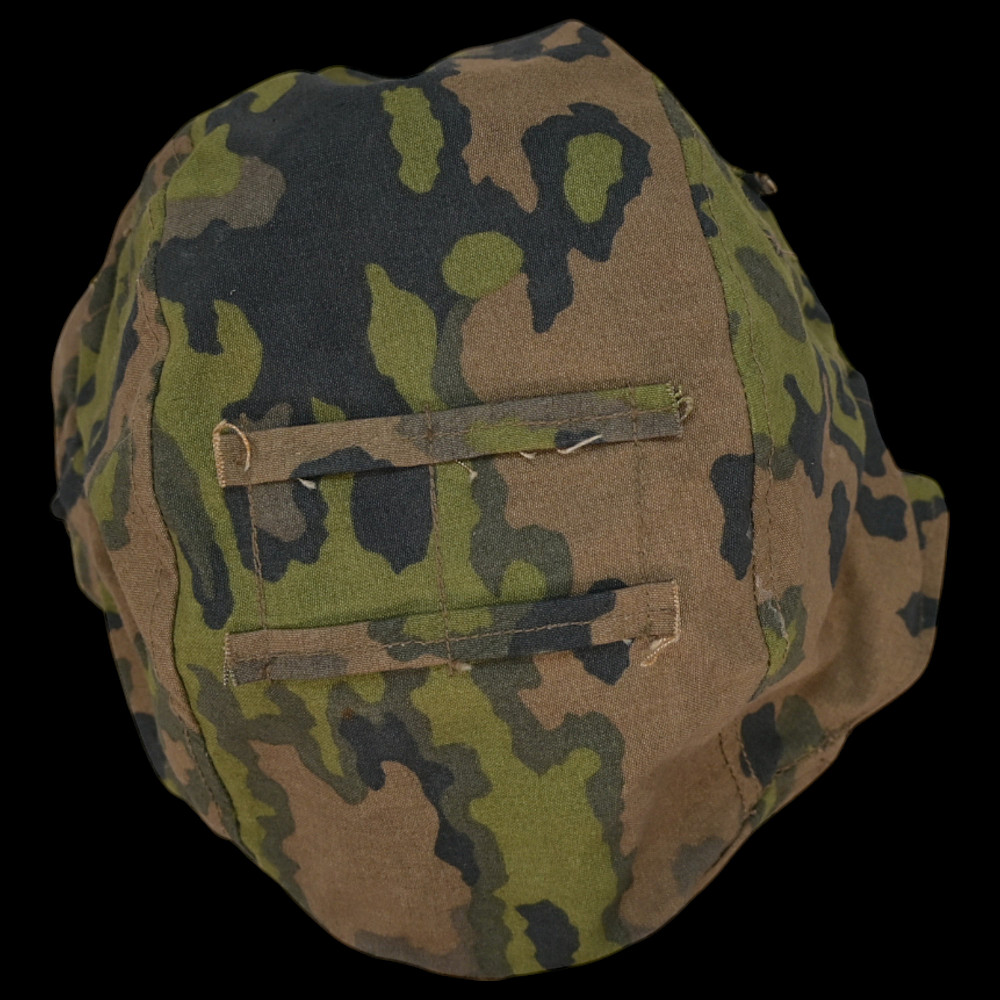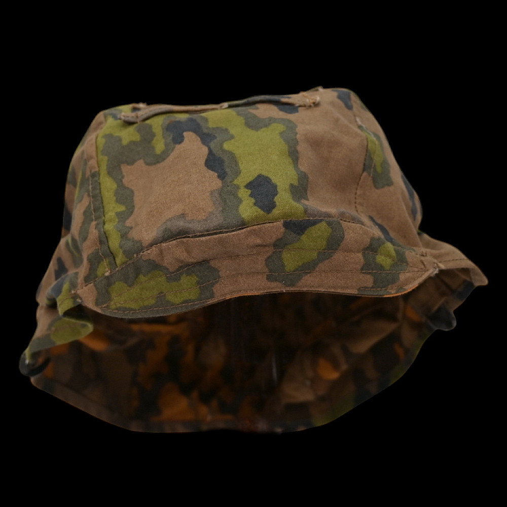 Rare WWII Nazi German cover for Waffen SS helmet, 1st type in oak leaf pattern camouflage. A helmet cover 1st type in oak leaf pattern camouflage. Reversible issue in cloth imprinted with spring and autumn colours the lower edge. A three blackened hooks on tension springs for affixing to the steel helmet both sides with sewn-in brown linen visor reinforcement. Cf. Beaver M. Camouflage Uniforms of the Waffen-SS pp. 119 - 136. An excellent collector’s item for military history enthusiasts or those interested in WWII memorabilia. Good condition