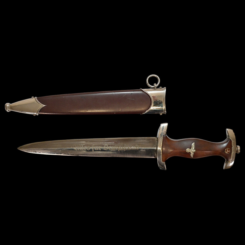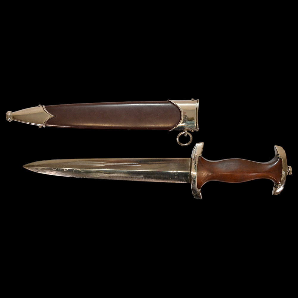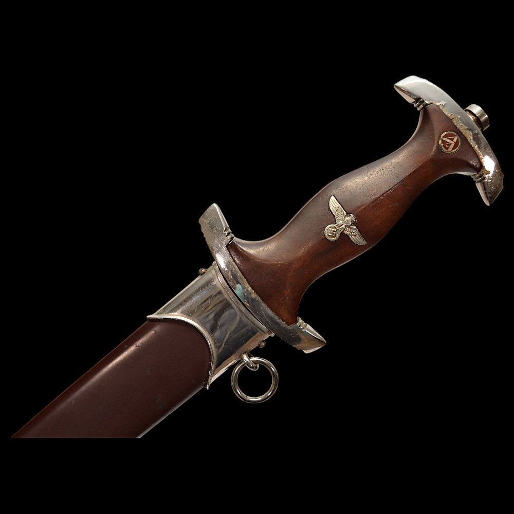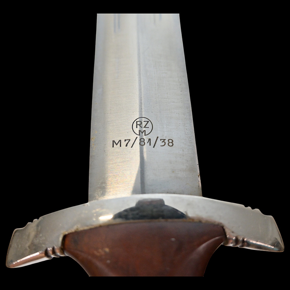 Rare WWII Nazi German dagger M33, SA Sturmabteilung, Karl Tiegel, Riemberg. Model 1933 Service Dagger, measuring 37.5 cm in total length when inserted into the scabbard. It features a steel blade with a sharpened tip and edges. Acid-etched onto the obverse of the blade is an inscription of “ALLES FÜR DEUTSCHLAND” (“EVERYTHING FOR GERMANY”) in Fraktur script. Maker marked by RZM 7/81/38 (Karl Tiegel, Riemberg, 1938) which is a very uncommon and rare manufacturer. The blade sits within a crossguard which is marked with eight notches, distributed in groups of four at both the top and bottom. A single piece of lacquered brown wood compositions the handle grip, and is carved into a curvature for a comfortable grip. Inset into the obverse of the handle is a German national eagle clutching a wreathed swastika and Sturmabteilung (SA) measuring insignia. It is accompanied by its original scabbard, constructed of a brown-painted iron. Nickel fixtures are secured to both the tip and throat, with the latter retaining a loop for the accommodation of a hanger. The throat also retains a functional spring catch to firmly hold the dagger in place during storage. A rare opportunity for collectors of items from the Third Reich to add an SA dagger of such a rare manufacturer. Length 37.5 cm. Good condition.
