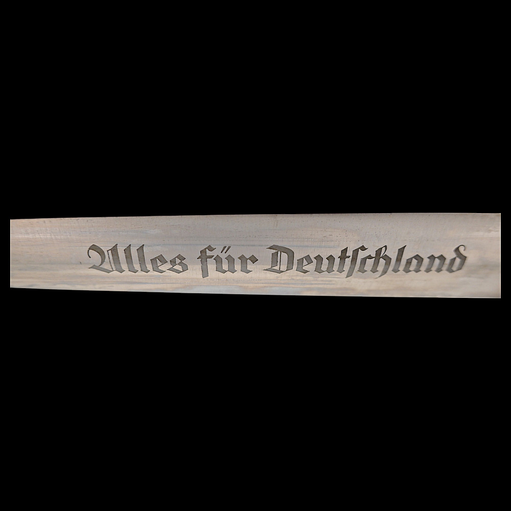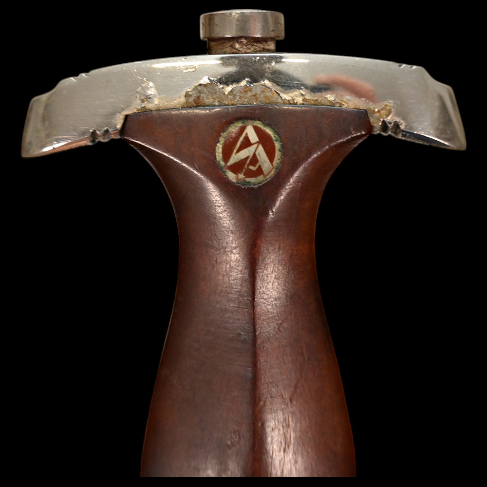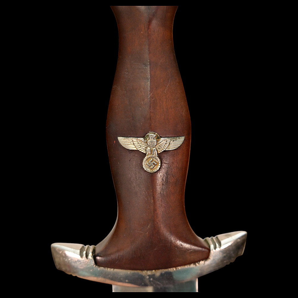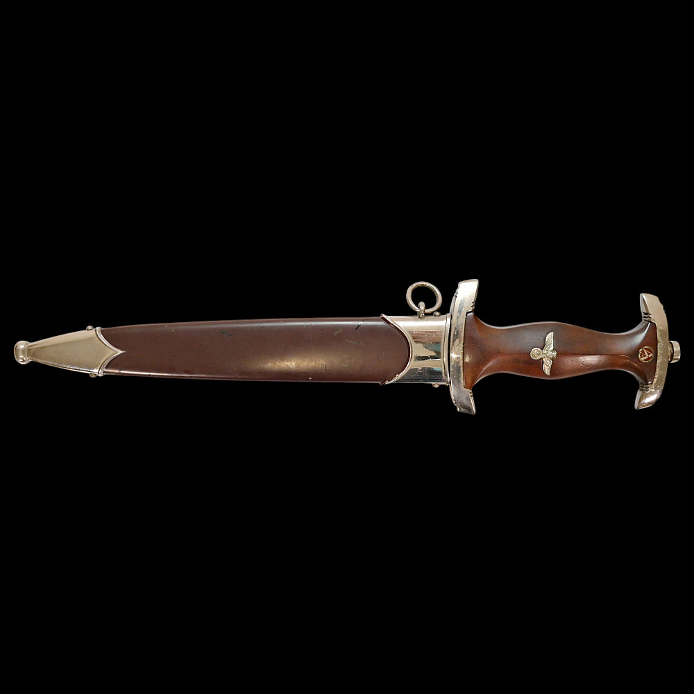 Rare WWII Nazi German dagger M33, SA Sturmabteilung, Karl Tiegel, Riemberg. Model 1933 Service Dagger, measuring 37.5 cm in total length when inserted into the scabbard. It features a steel blade with a sharpened tip and edges. Acid-etched onto the obverse of the blade is an inscription of “ALLES FÜR DEUTSCHLAND” (“EVERYTHING FOR GERMANY”) in Fraktur script. Maker marked by RZM 7/81/38 (Karl Tiegel, Riemberg, 1938) which is a very uncommon and rare manufacturer. The blade sits within a crossguard which is marked with eight notches, distributed in groups of four at both the top and bottom. A single piece of lacquered brown wood compositions the handle grip, and is carved into a curvature for a comfortable grip. Inset into the obverse of the handle is a German national eagle clutching a wreathed swastika and Sturmabteilung (SA) measuring insignia. It is accompanied by its original scabbard, constructed of a brown-painted iron. Nickel fixtures are secured to both the tip and throat, with the latter retaining a loop for the accommodation of a hanger. The throat also retains a functional spring catch to firmly hold the dagger in place during storage. A rare opportunity for collectors of items from the Third Reich to add an SA dagger of such a rare manufacturer. Length 37.5 cm. Good condition.