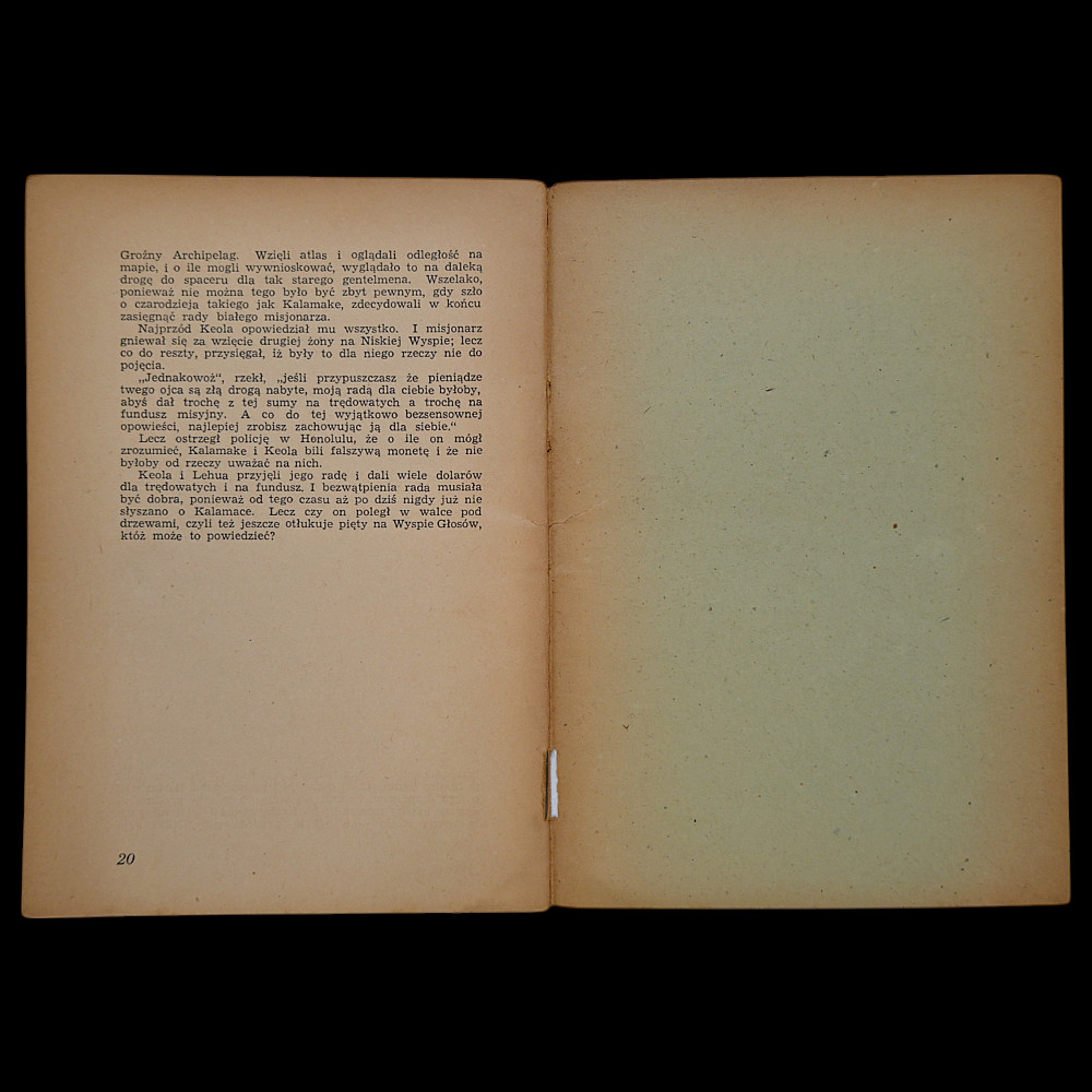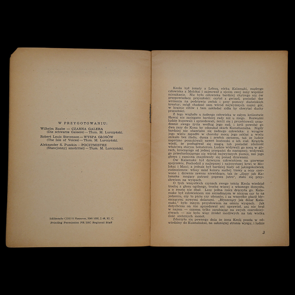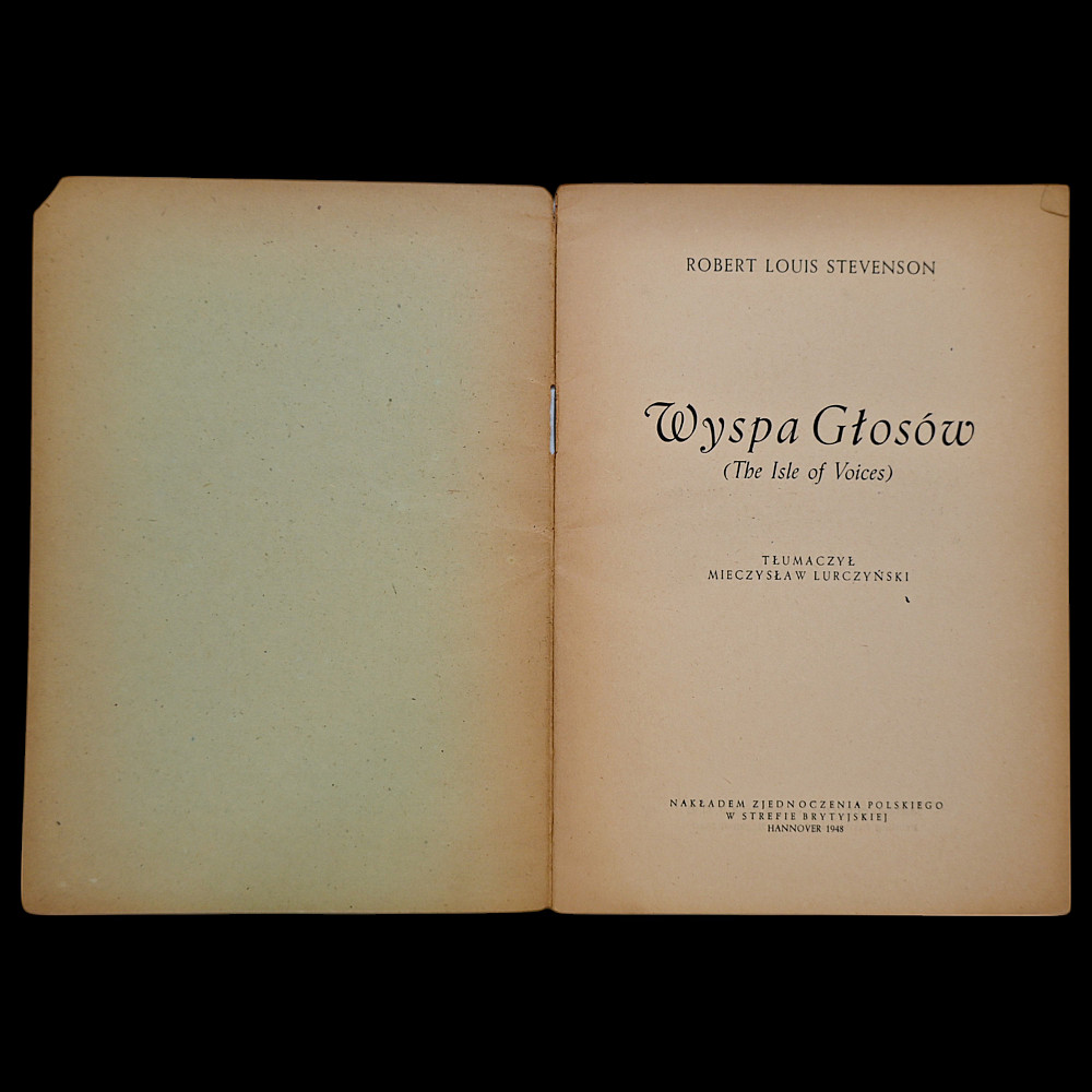 Robert Louis Stevenson – Wyspa Głosów (The Isle of Voices), Polish edition published by the Union of Polish Associations in the British Zone, Hannover, 1948. Translation by Mieczysław Lurczyński. A scarce and historically significant post-war Polish-language edition of The Isle of Voices by Robert Louis Stevenson, translated by Mieczysław Lurczyński. Published in 1948 in Hannover by the Union of Polish Associations in the British Occupation Zone of Germany, this booklet reflects the intellectual and cultural activities of displaced Polish communities in the aftermath of World War II. Softcover with visible age toning, particularly at the edges. Staple-bound, 20 numbered pages. The typography and production style are typical of low-cost émigré press publications of the late 1940s. This rare example of Polish post-war émigré literature is of interest to collectors of Eastern European publishing history, Polish diaspora materials, and Stevenson translations. Dimensions: approximately 18x13 cm.
