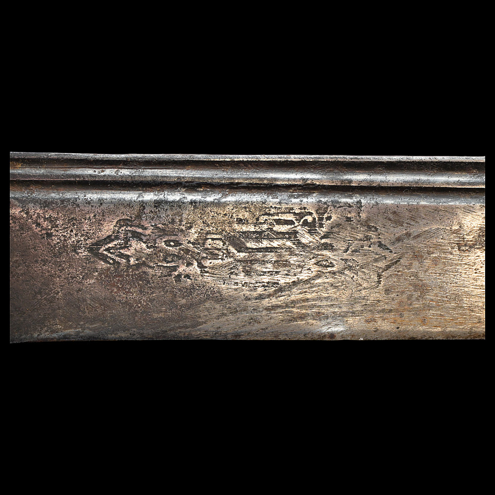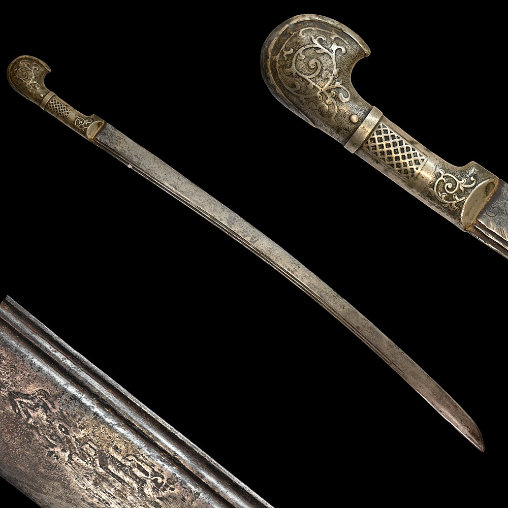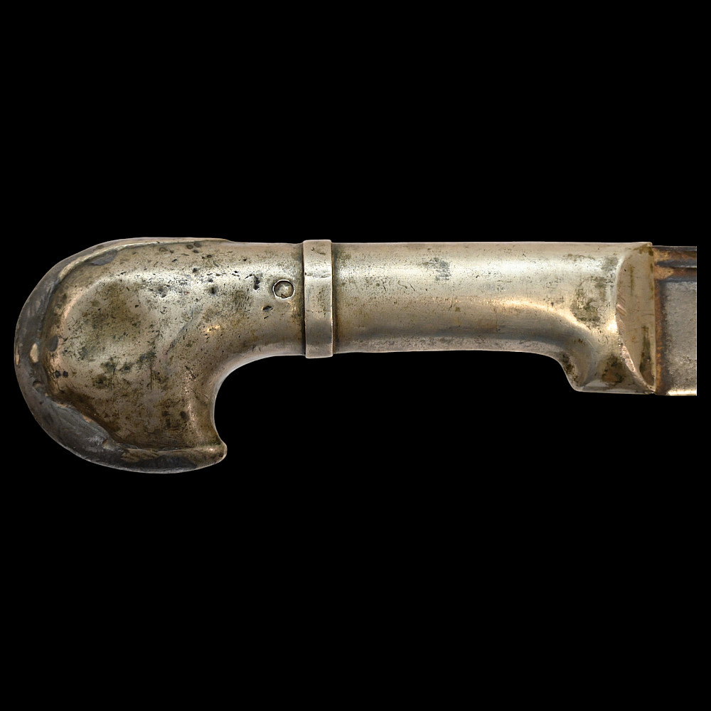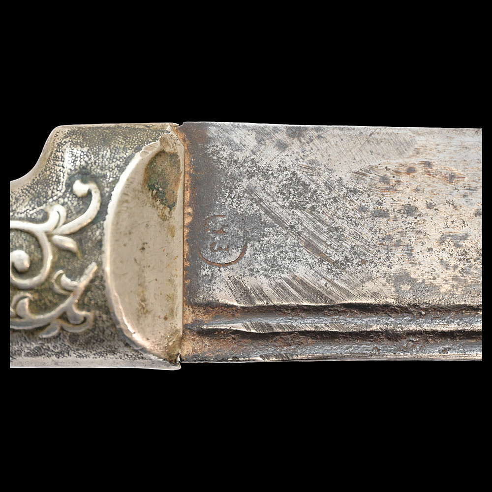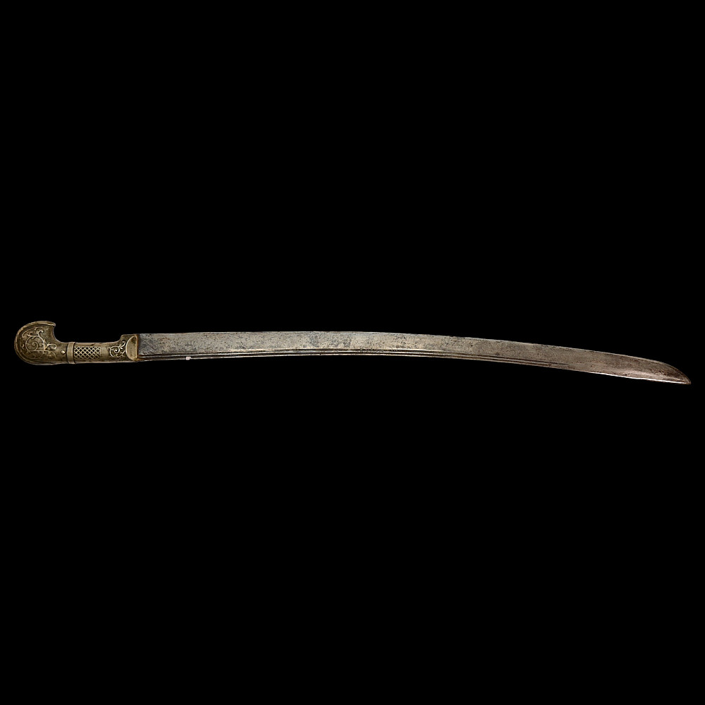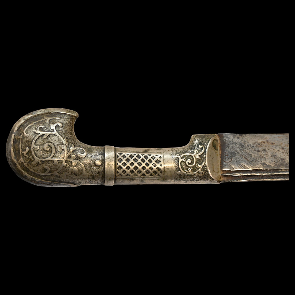 Shashka Officer "KKV" Kuban Cossack army, Russian Empire, early 20th century. Steel blade with a slight bend, two fullers on each side. Worn mark "ZOF" Zlatoust Arms Factory, on one side of the blade. The handle is metal, decorated with embossing on one side. Rare collector's item. length 90 cm.