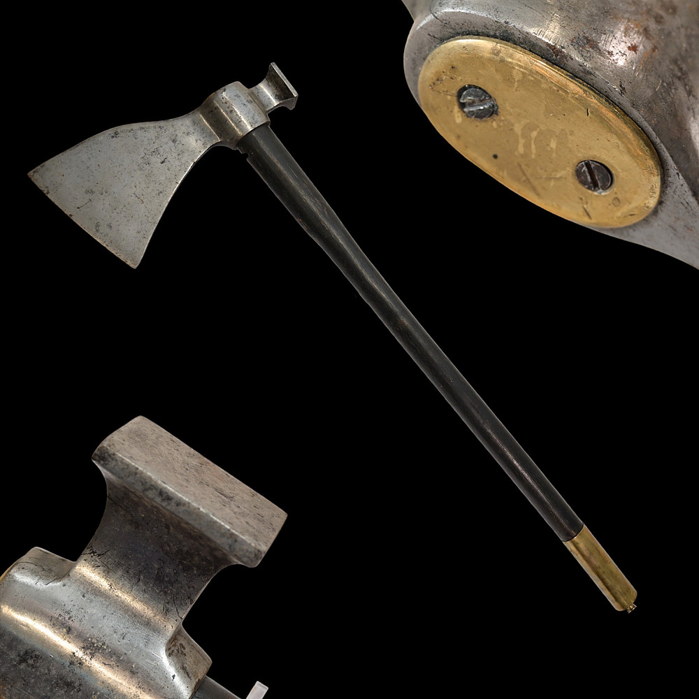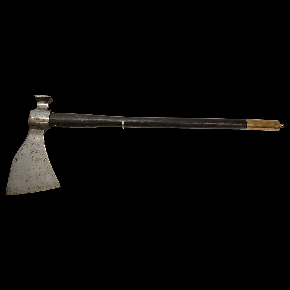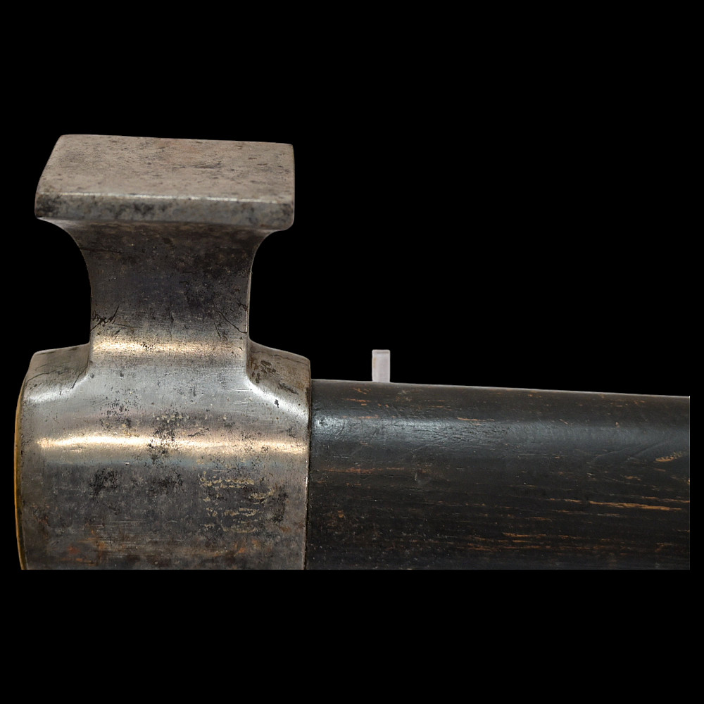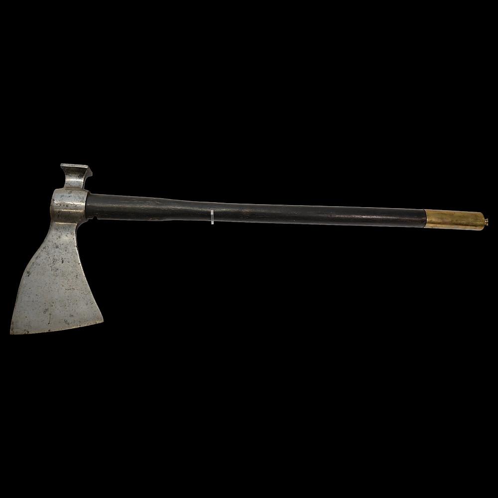 Stunning, Large Size, Sapper Engineer's Axe, France, First Empire, early 19th century. The forged steel blade is mounted on a black wooden shaft. The ax has a wide blade at the front and a hammer at the back. There is a brass end at the bottom of the shaft. A wonderful collector's item in excellent condition.length 110 cm.