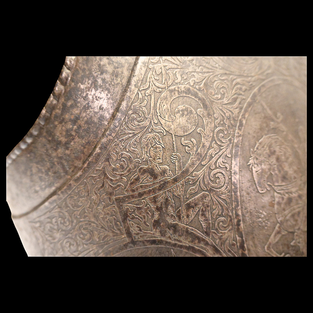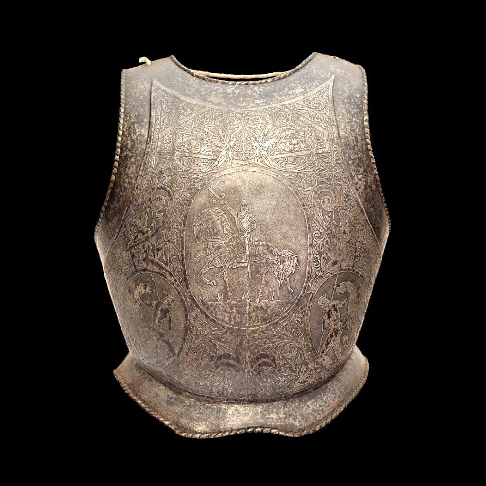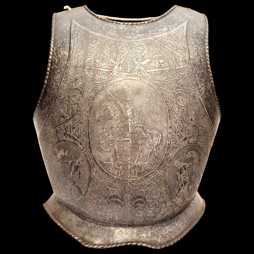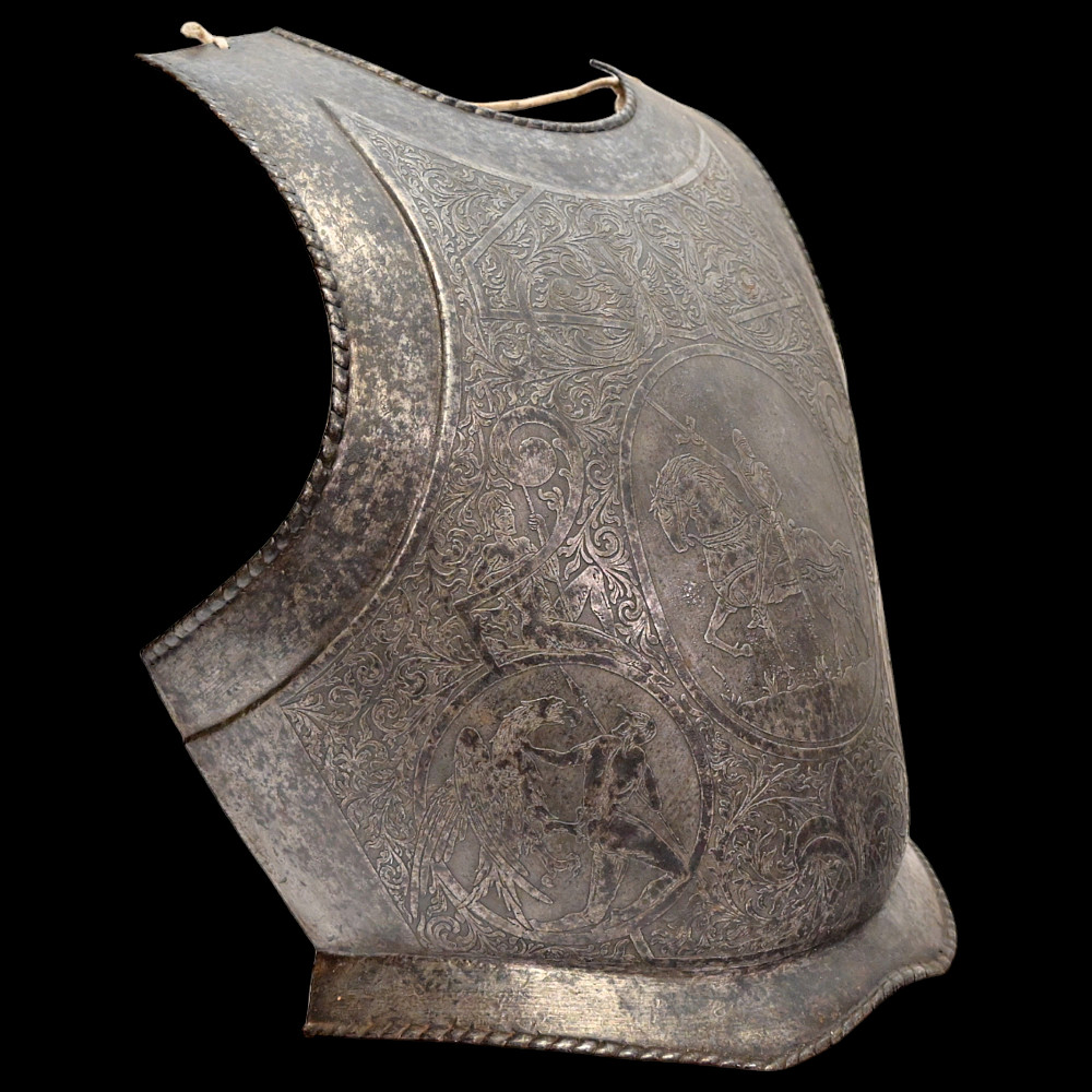 The Magnificent Steel Armor, Breast Plate in Renaissance Style, Germany 19th century. The breast plate is richly decorated with engraved plant ornamentation. The central medallion depicts a medieval knight on horseback. In the lower part there are two medallions depicting a warrior with a spear, who has entered into battle with a huge bird of prey. A fine armour in Renaissance Style in good condition. Height of breast plate 48 cm.