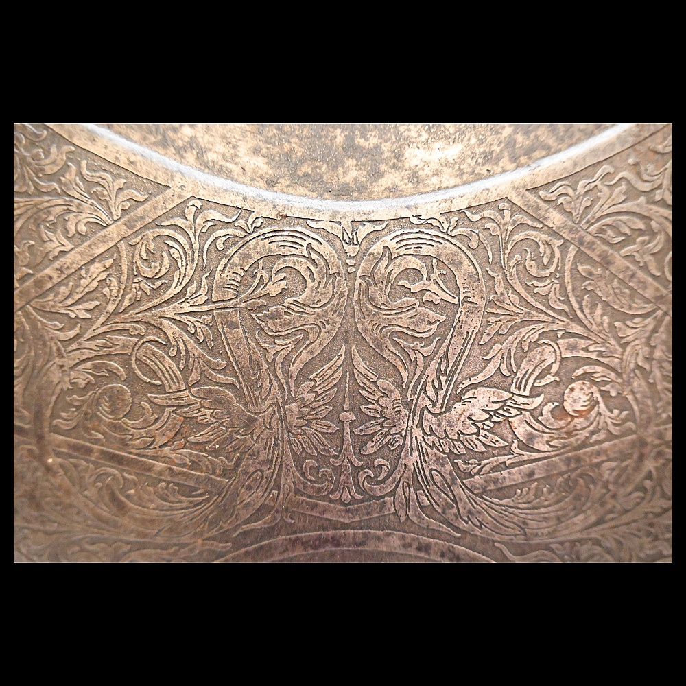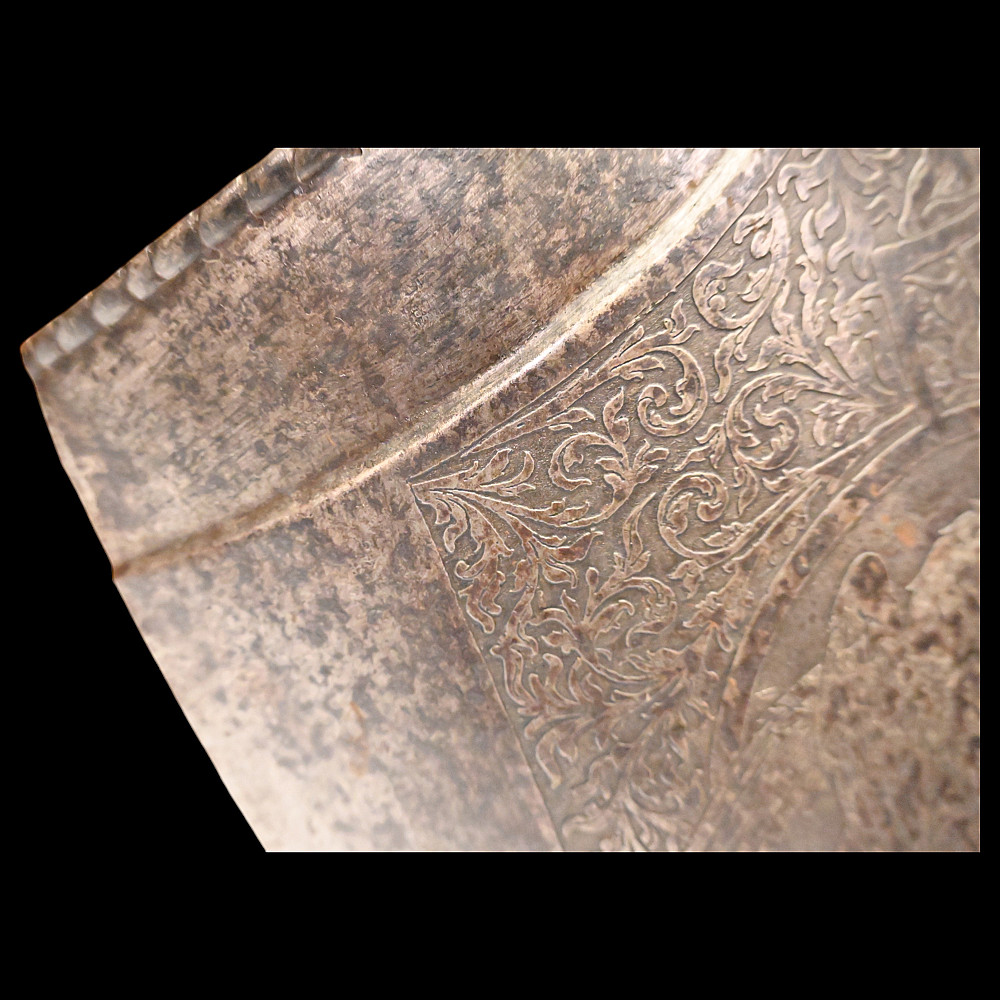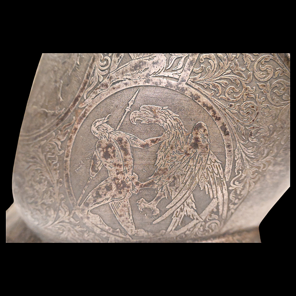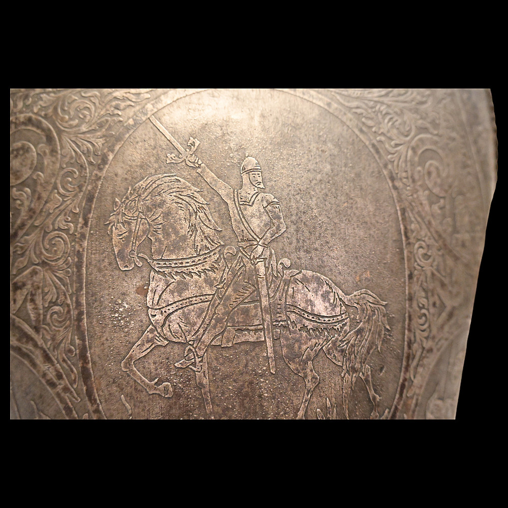 The Magnificent Steel Armor, Breast Plate in Renaissance Style, Germany 19th century. The breast plate is richly decorated with engraved plant ornamentation. The central medallion depicts a medieval knight on horseback. In the lower part there are two medallions depicting a warrior with a spear, who has entered into battle with a huge bird of prey. A fine armour in Renaissance Style in good condition. Height of breast plate 48 cm.