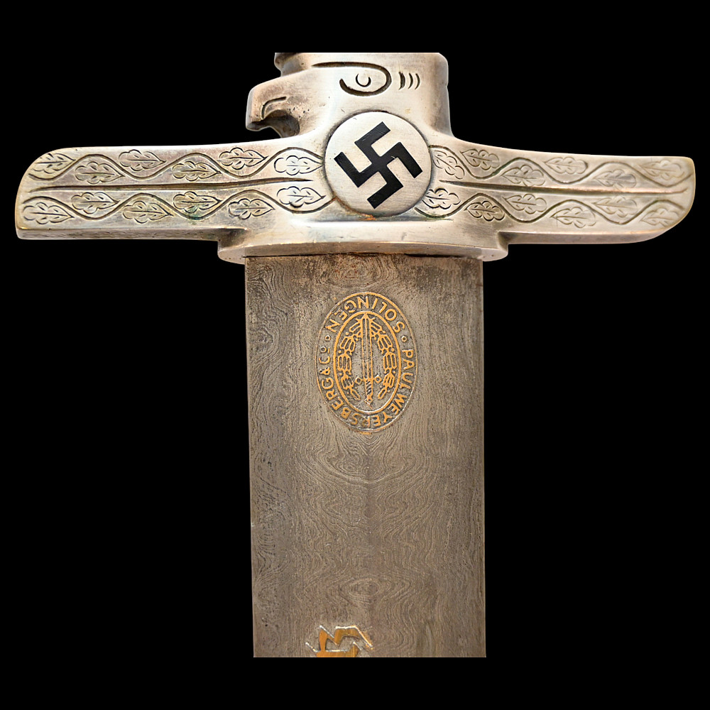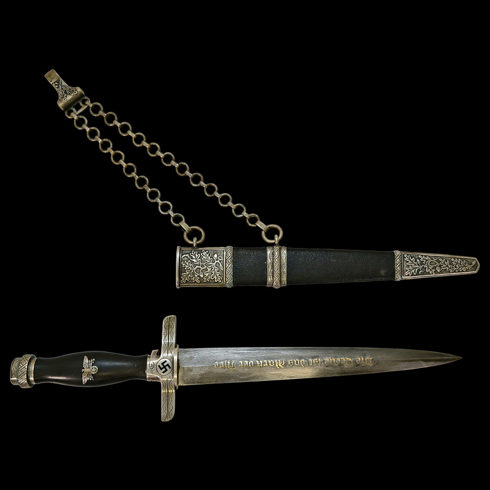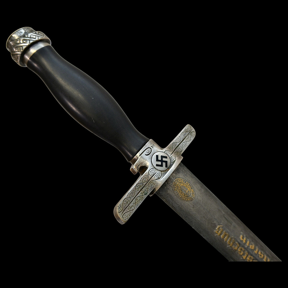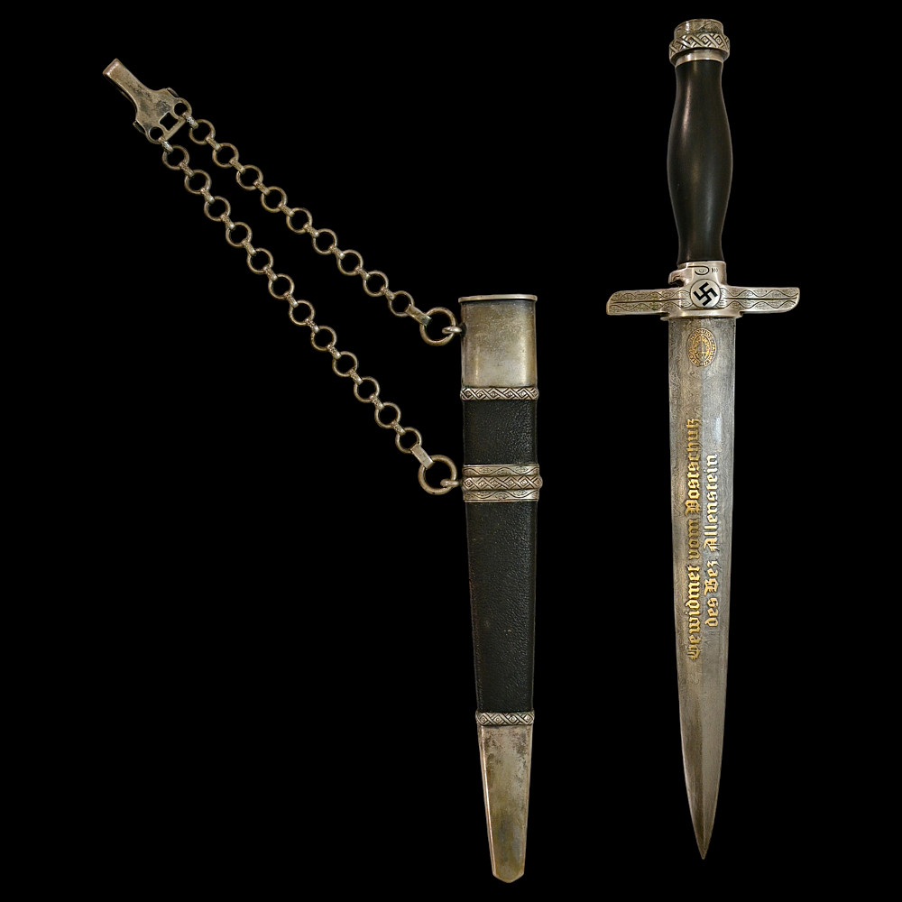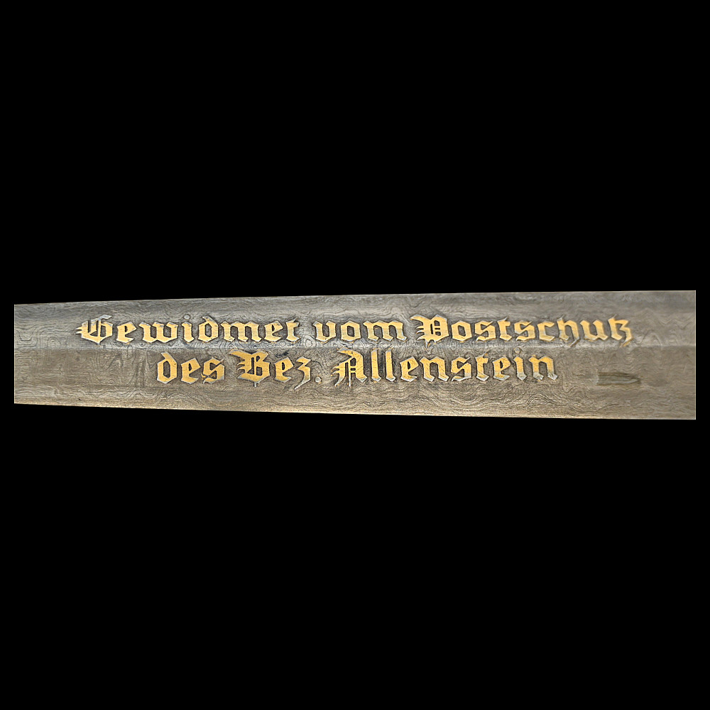 Third Reich Postschutz Officer's Award Dagger, model 1939. The Damascus blade is decorated with a gold inscription on both sides «Gewidmet vom Postschutz des Bez. Menstrein» and «Die Treue ist das Mark der Ehre" maker Paul Weyersberg. This model could not be identified in the literature. No guarantee of authenticity. Total length- 39,5cm.